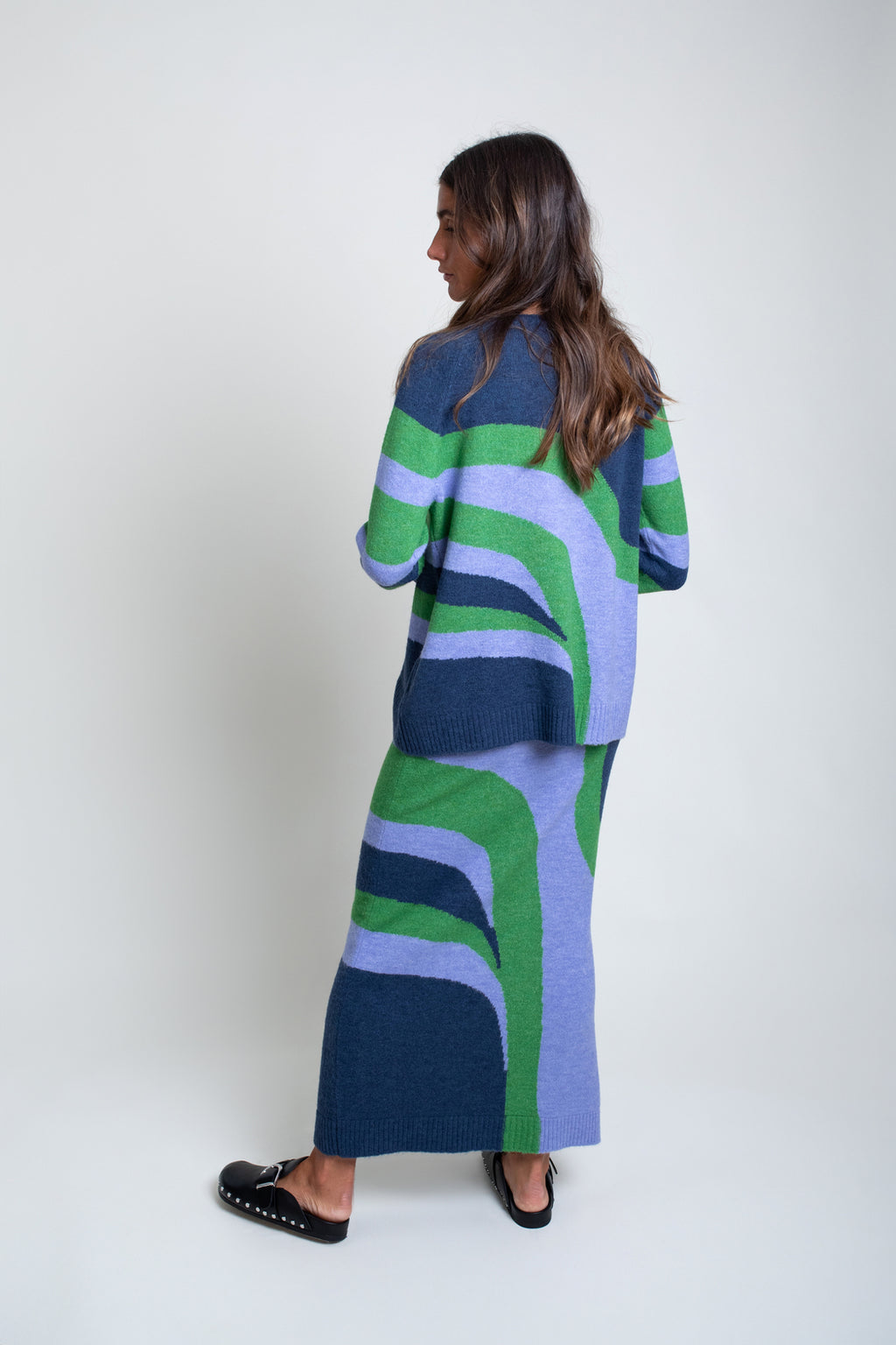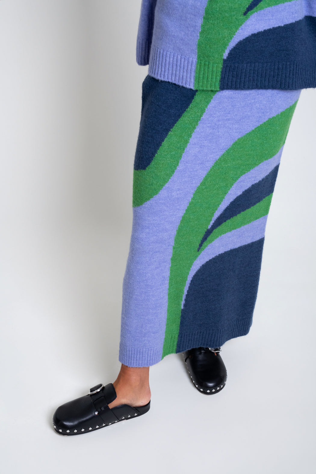 Long knitted skirt with intarsia in 3 colours. Straight cut with side slit and elasticated waistband.