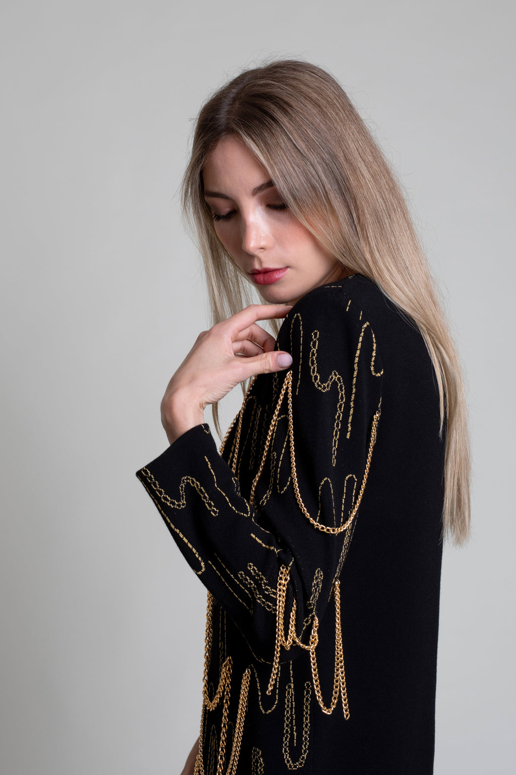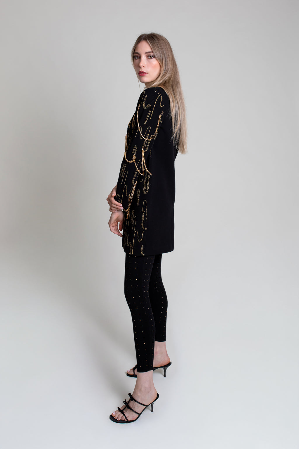 Abrigo de punto tricot con jacquar de cadenas en oro y adornos de cadena metálica. Modelo de corte encajado, cuello caja y manga larga. Cierre central con botones metálicos.