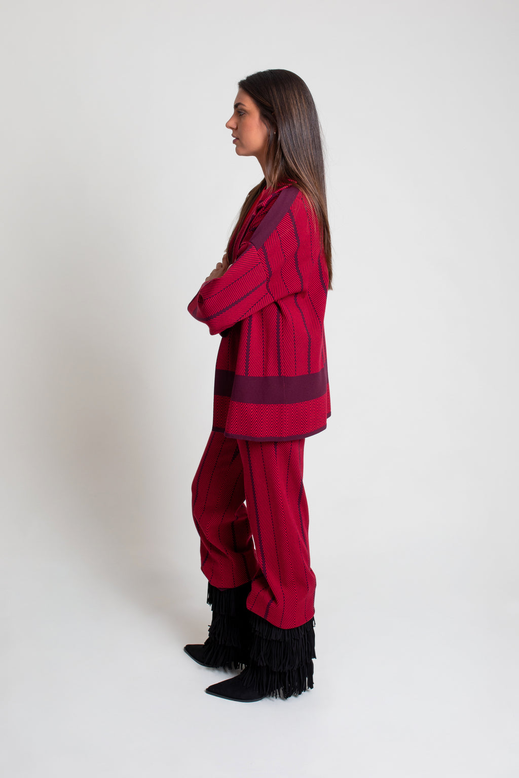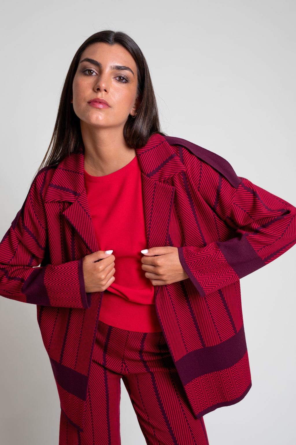 Chaquetona de punto tricot con intarsia bicolor. Modelo de corte oversize con escote solapa y manga larga caída