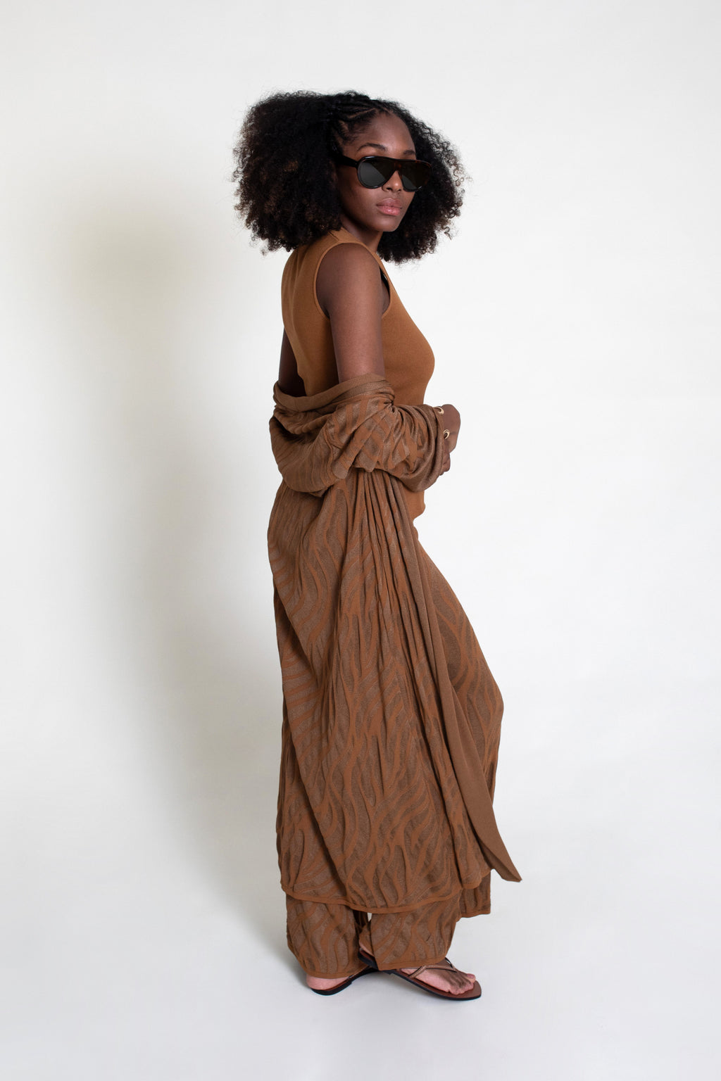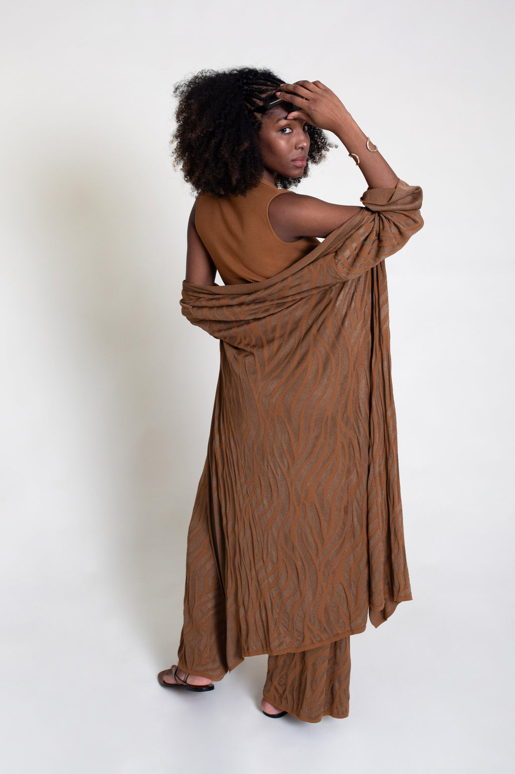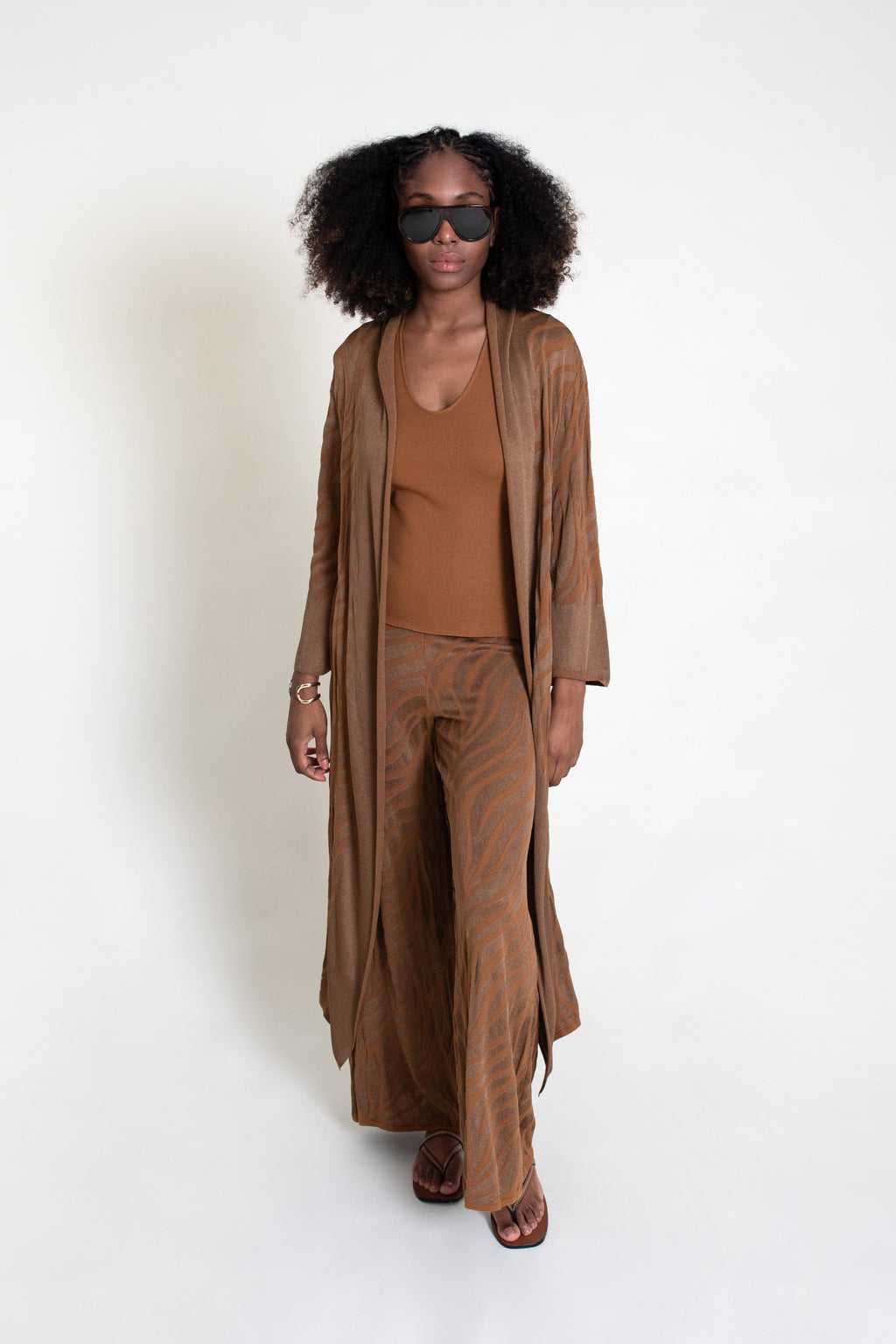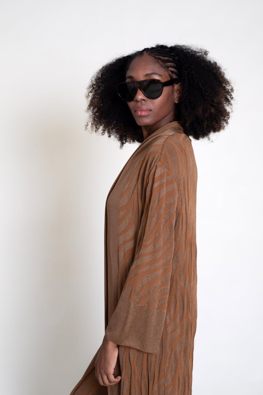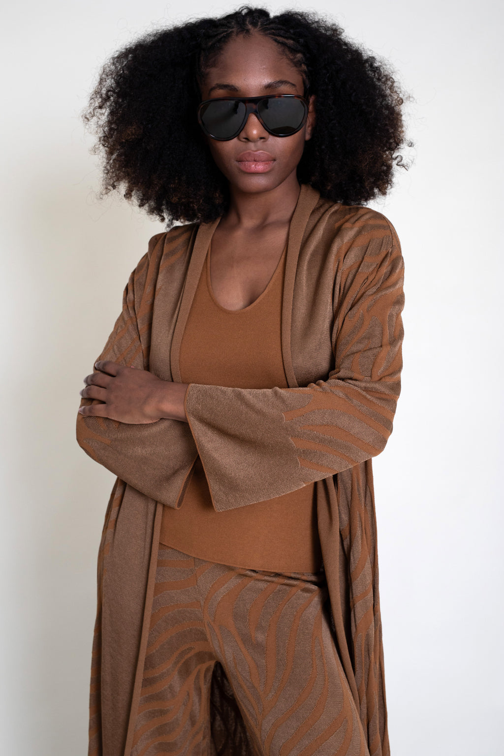 Abrigo tipo kimono en punto tricot de jacquard animal con ligero brillo. Modelo con manga 3/4 ancha y cuello batín.