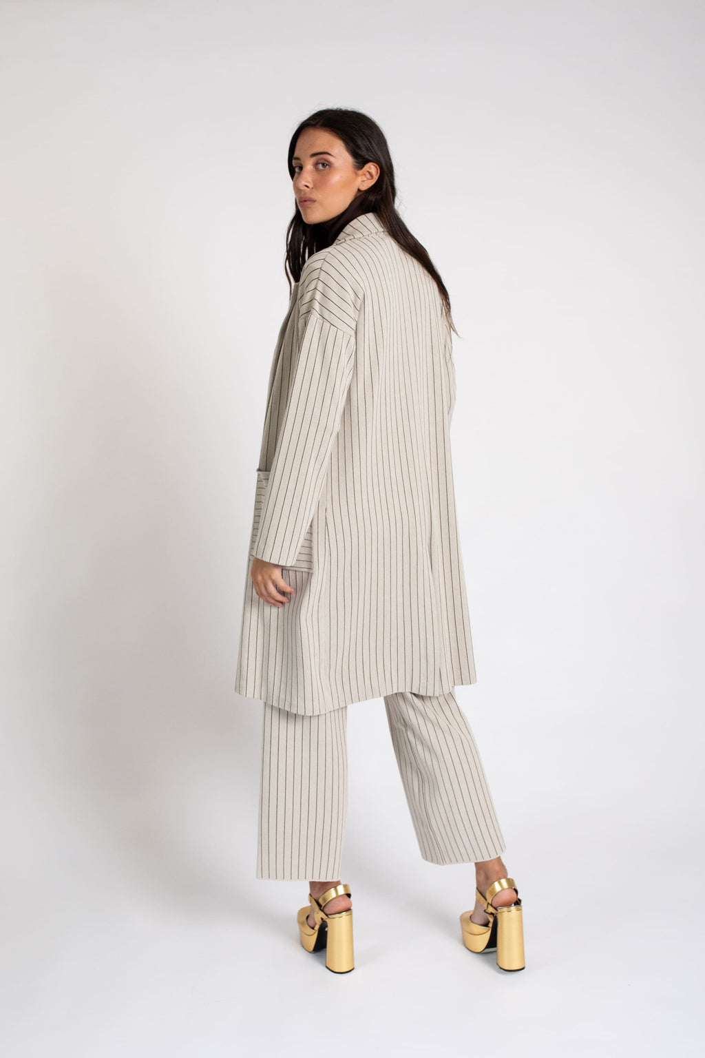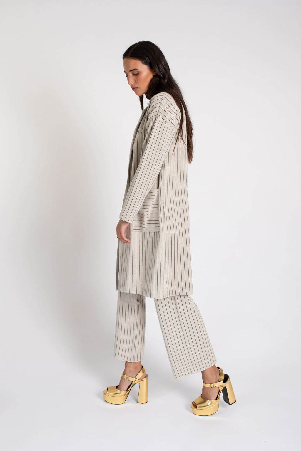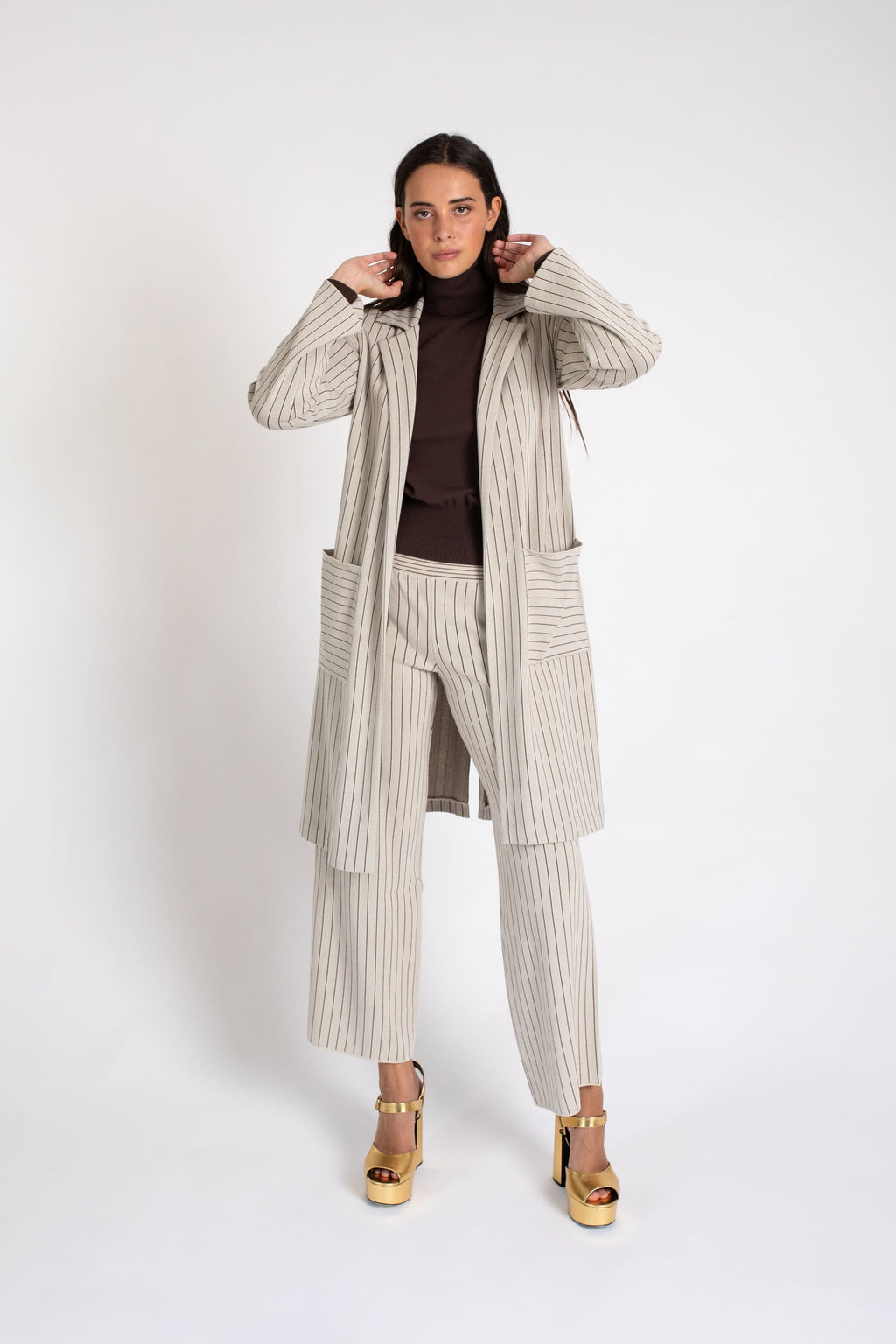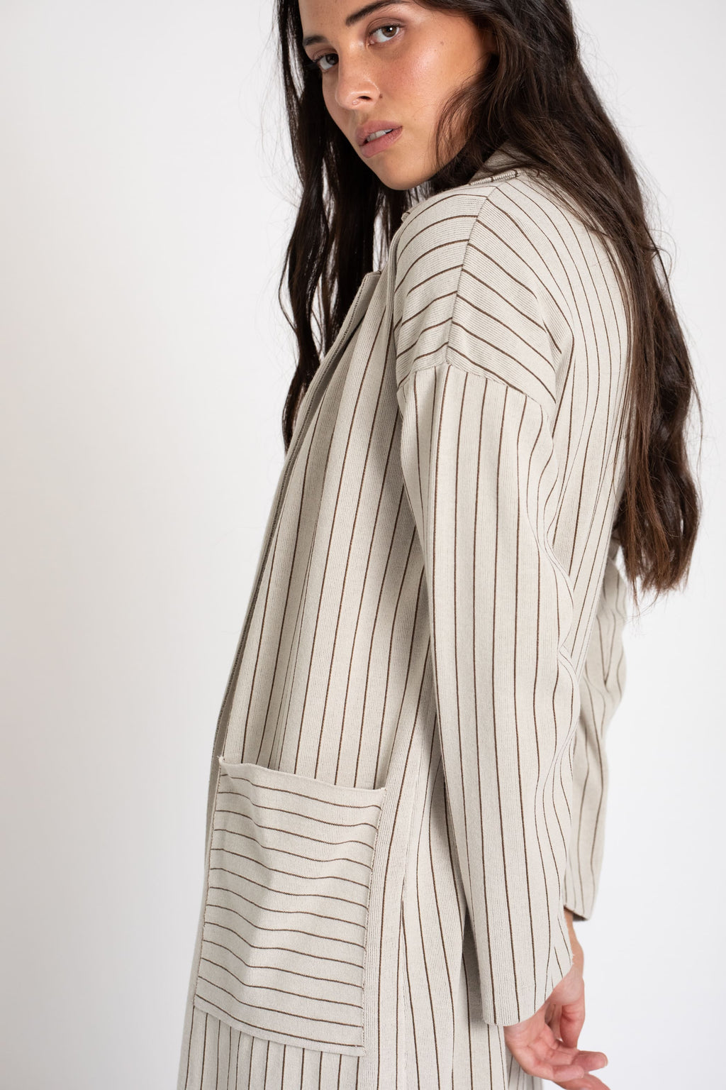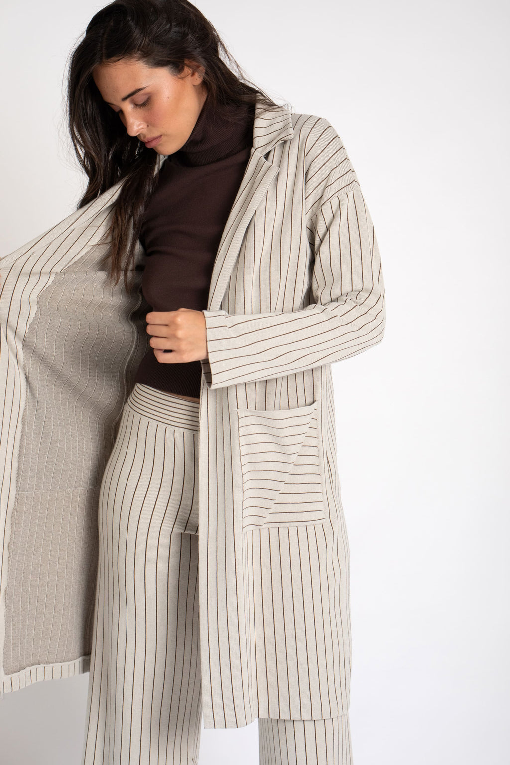 Abrigo de punto en jacquard de raya diplomática con manga larga y cuello solapa. Cierre con automático metálico y bolsillos en delantero