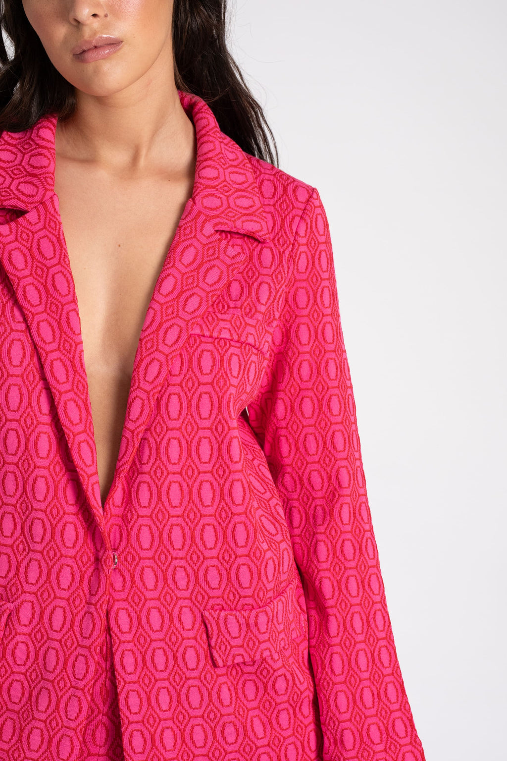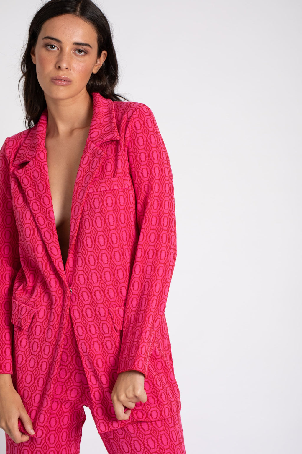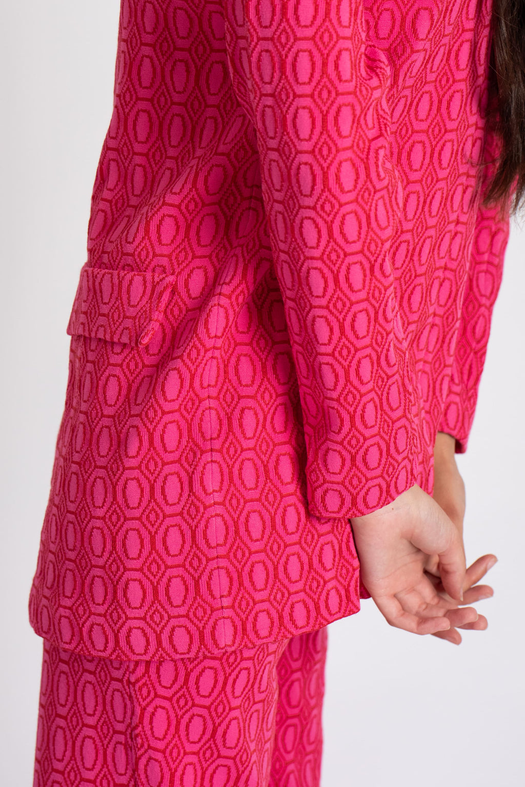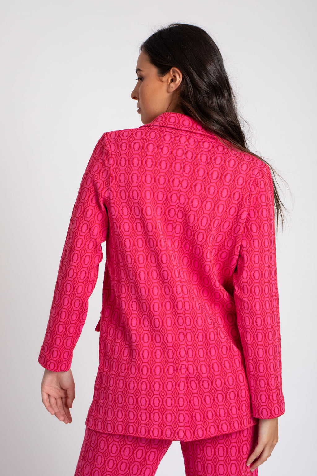 Blazer de punto en jacquard bicolor. Modelo de corte recto con manga larga y cuello solapa . Cierre delantero con automático metálico y falsos bolsillos con tapeta