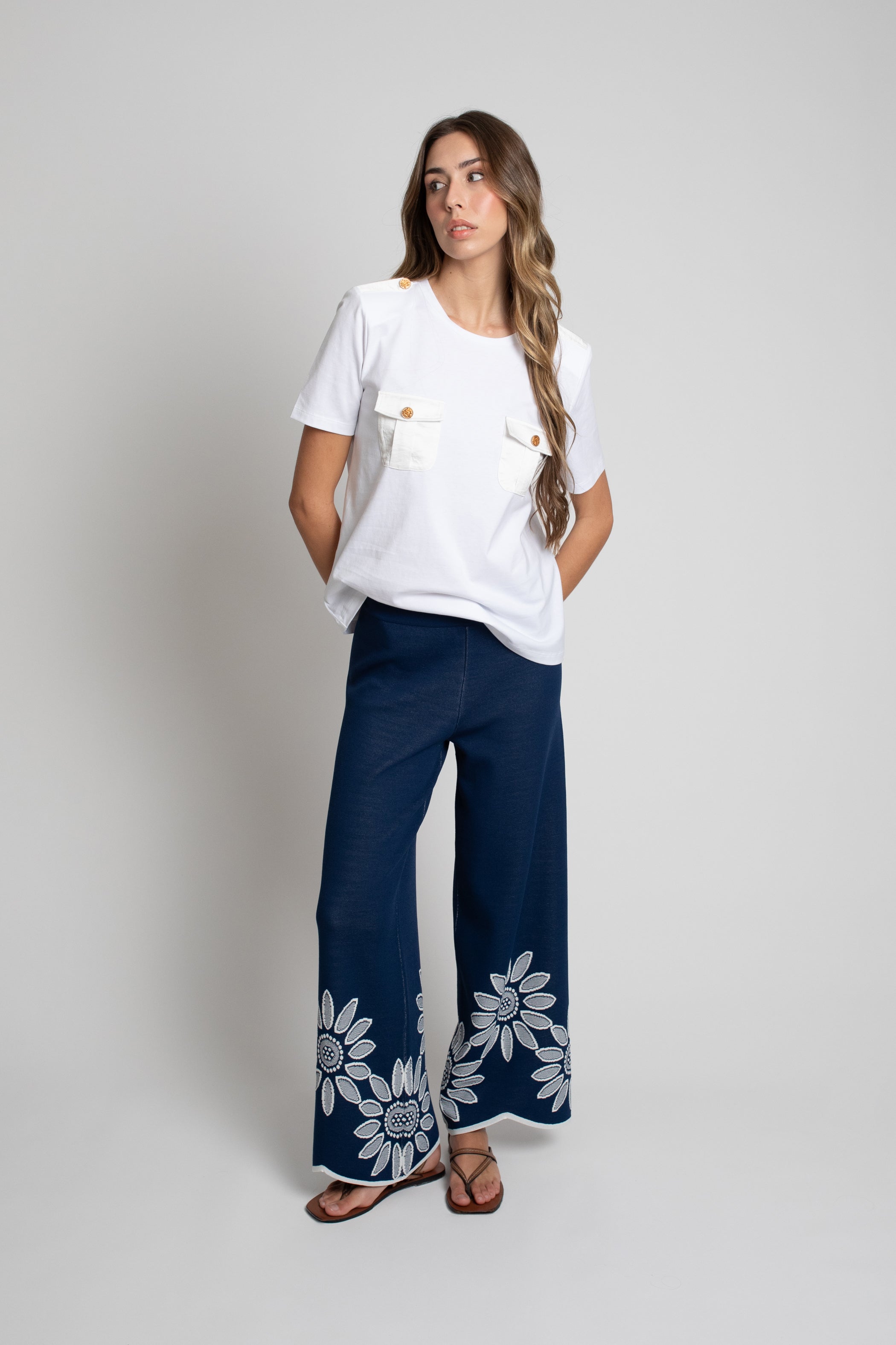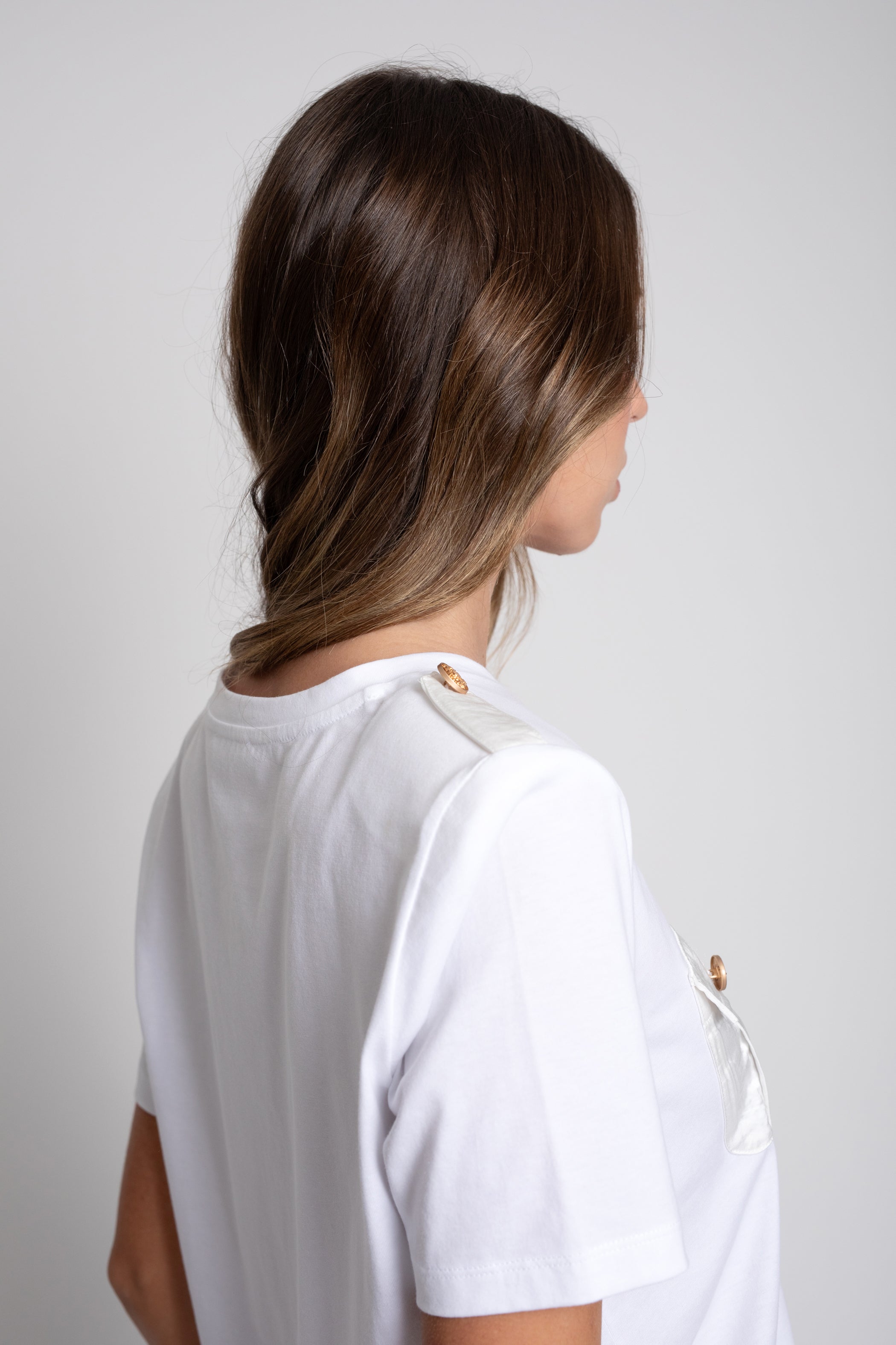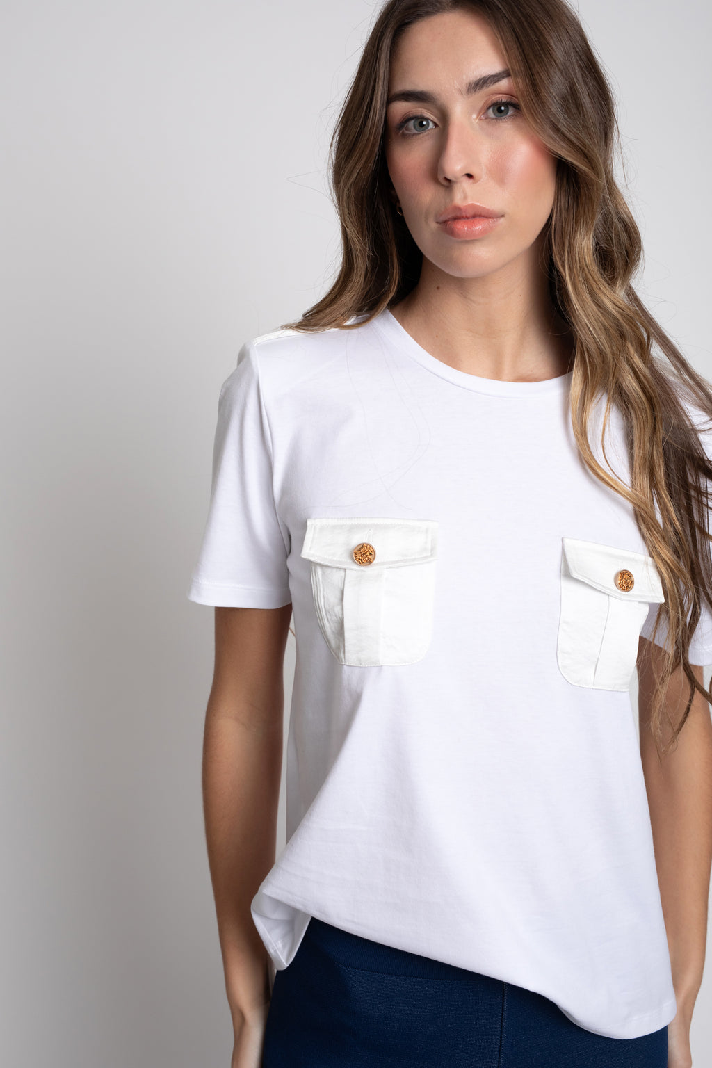 Camiseta de mujer de manga corta confeccionada en algodón, un tejido natural, suave y transpirable que garantiza confort durante todo el día. Su diseño se distingue por los bolsillos delanteros con tapeta y los botones decorativos en los hombros, que aportan carácter y un aire sofisticado a una prenda esencial.