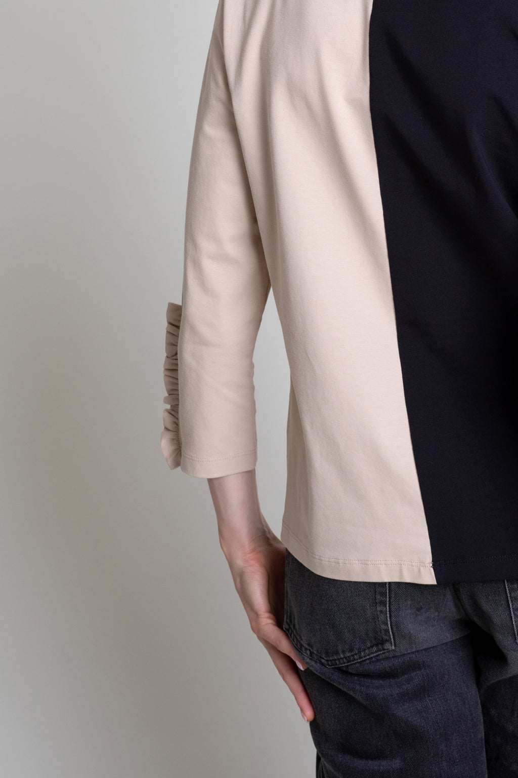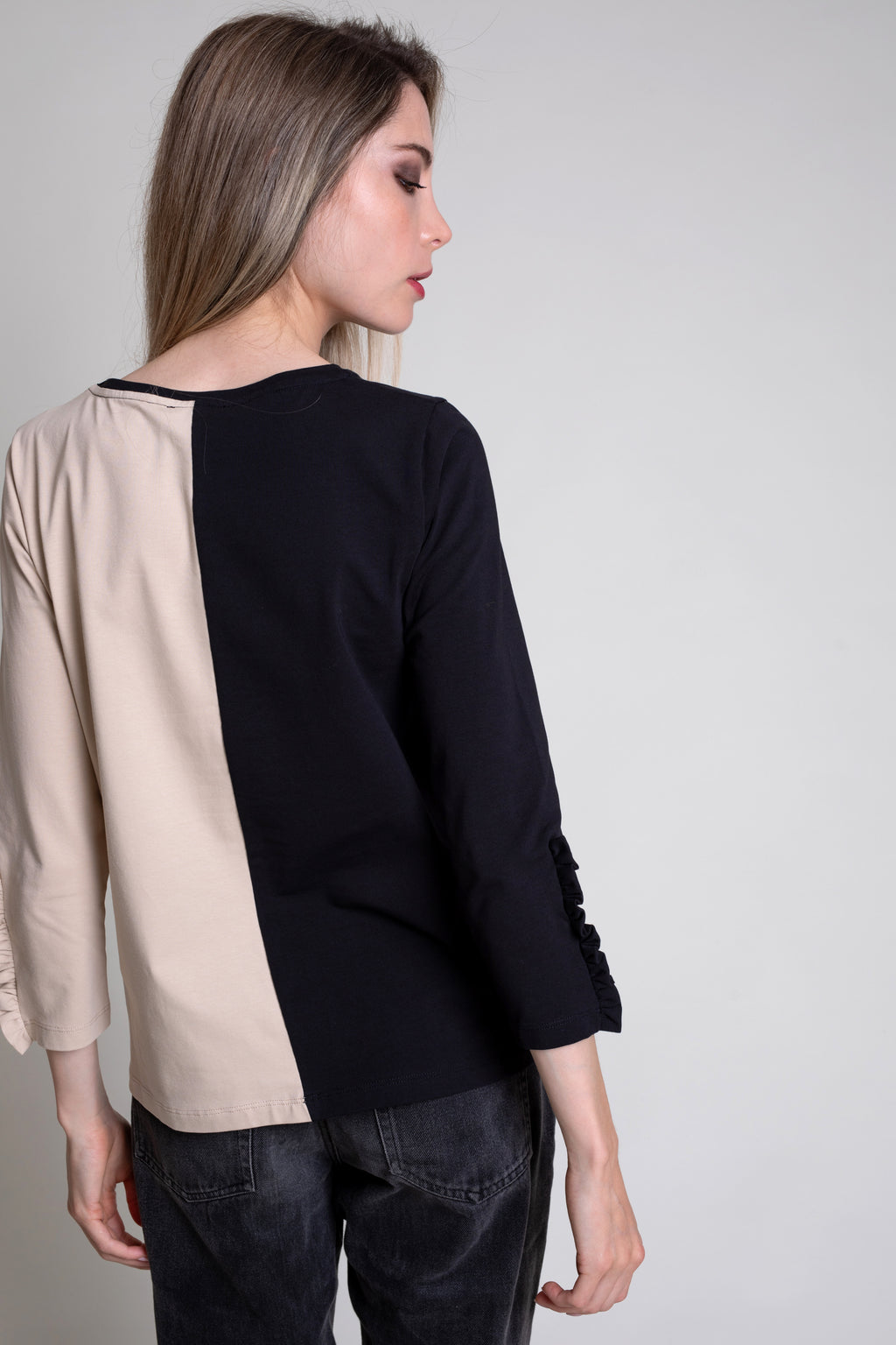 Camiseta de algodón bicolor con print bordado superpuesto en delantero. Modelo recto con cuello caja y manga larga con detalle de volante