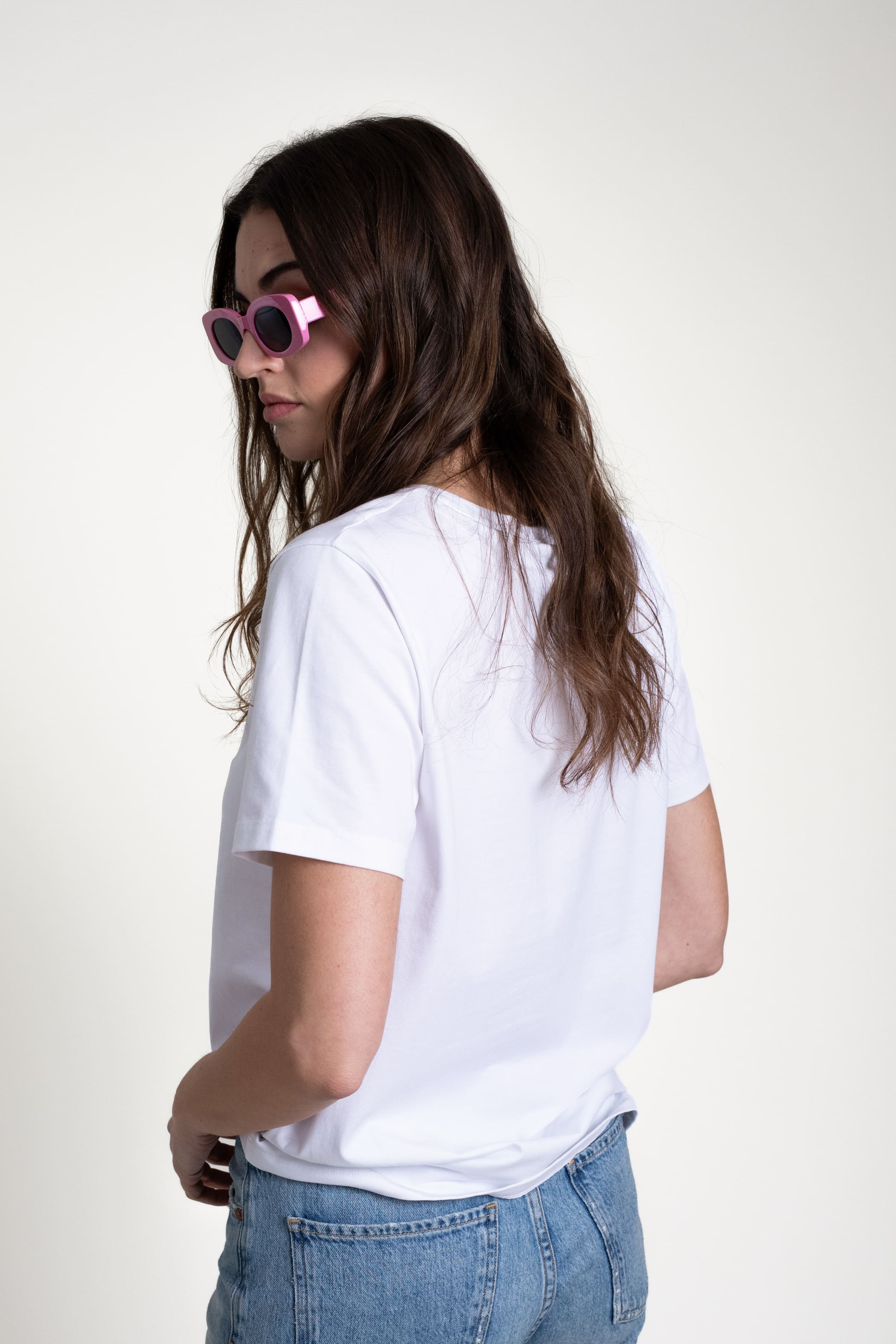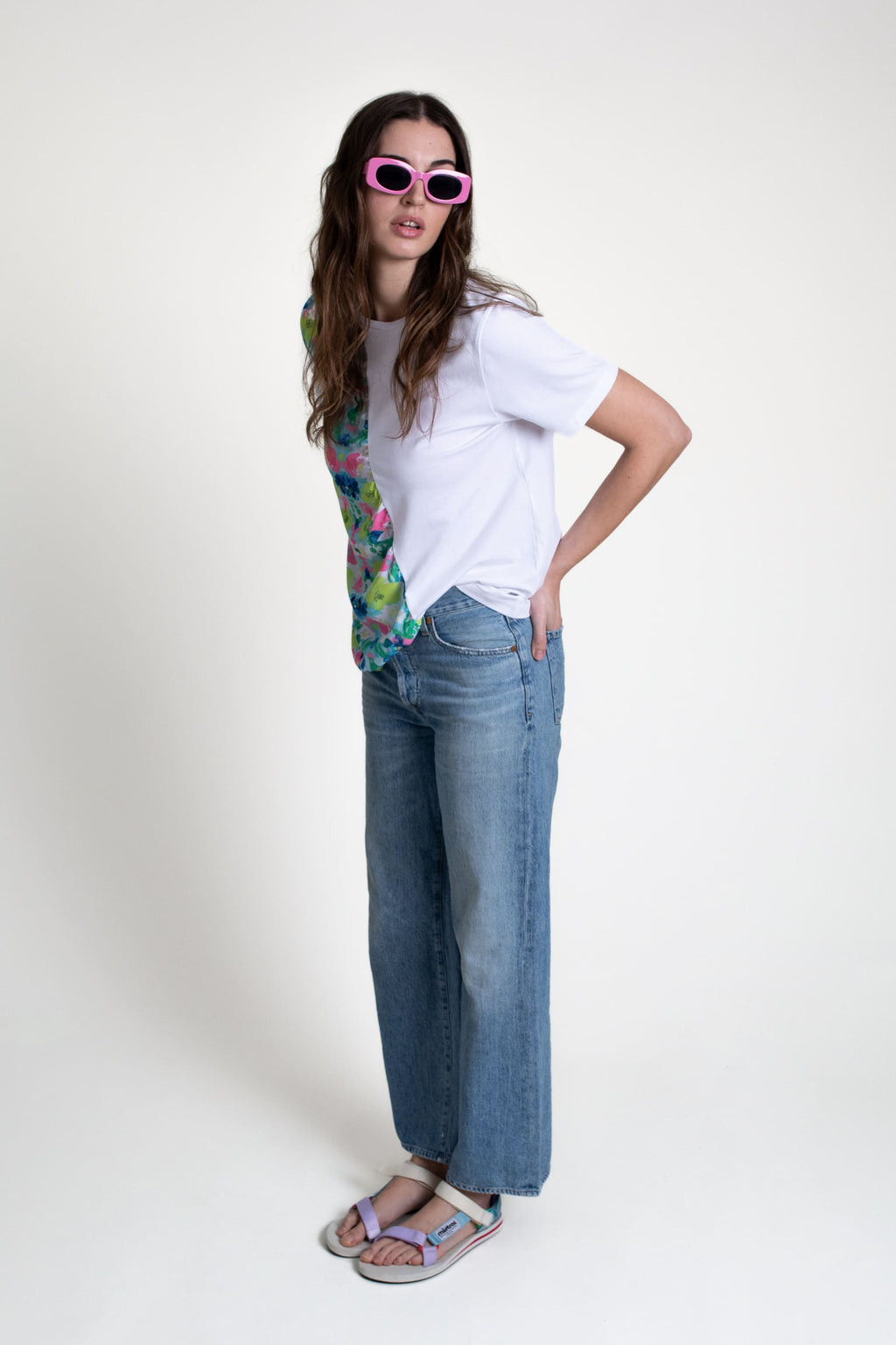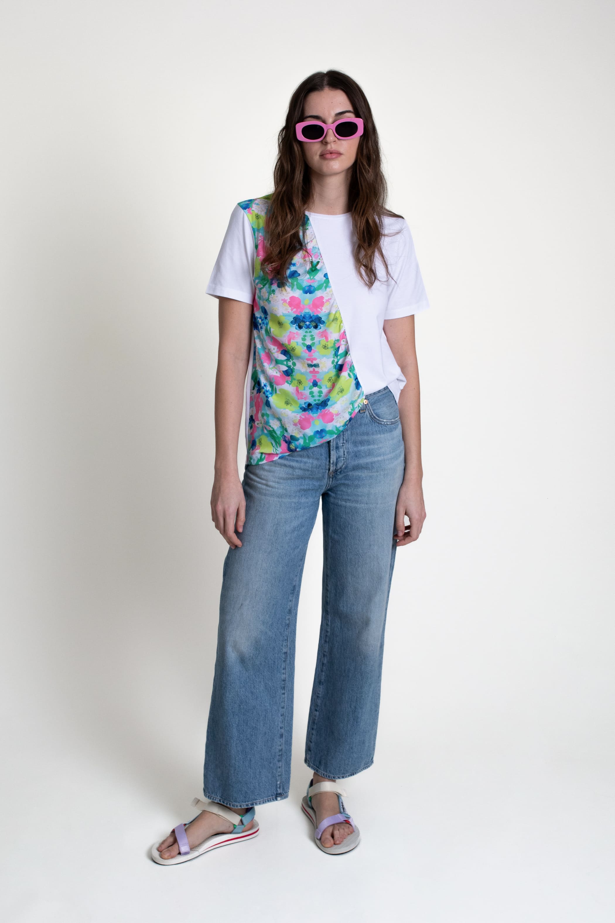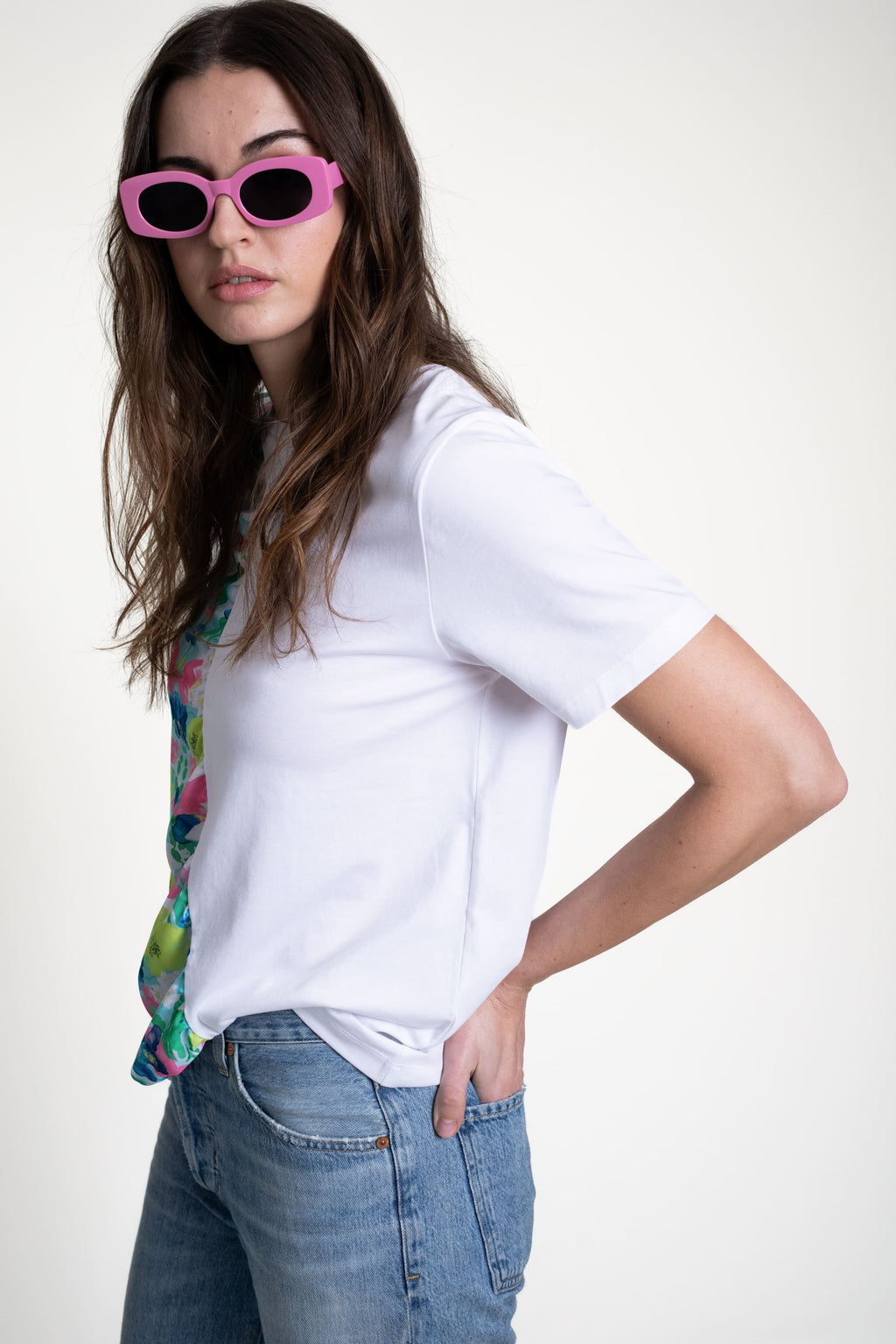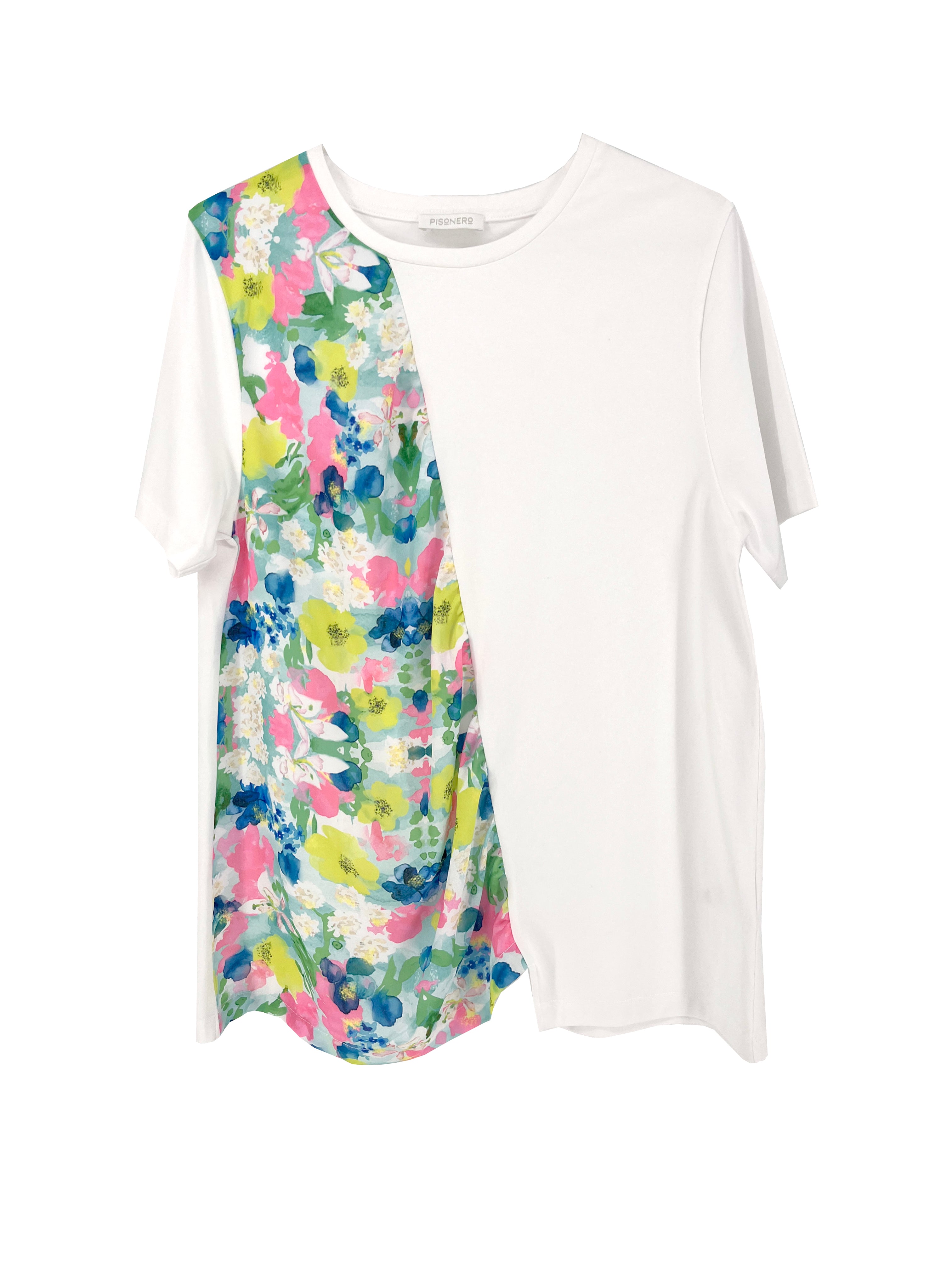 Camiseta blanca de algodón combinada con estampado floral en tejido georgette en la parte delantera. Modelo de corte recto con cuello redondo y manga corta.