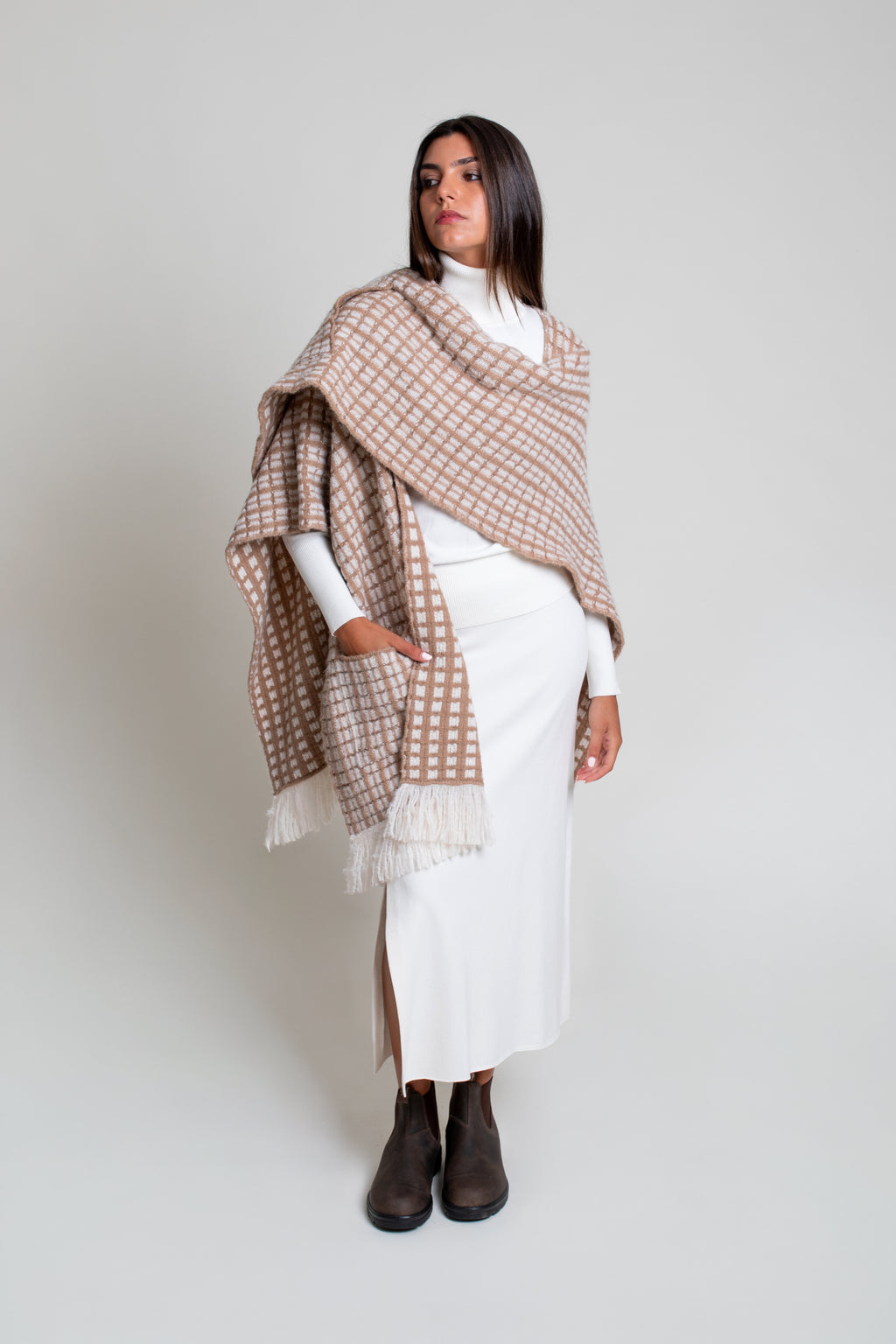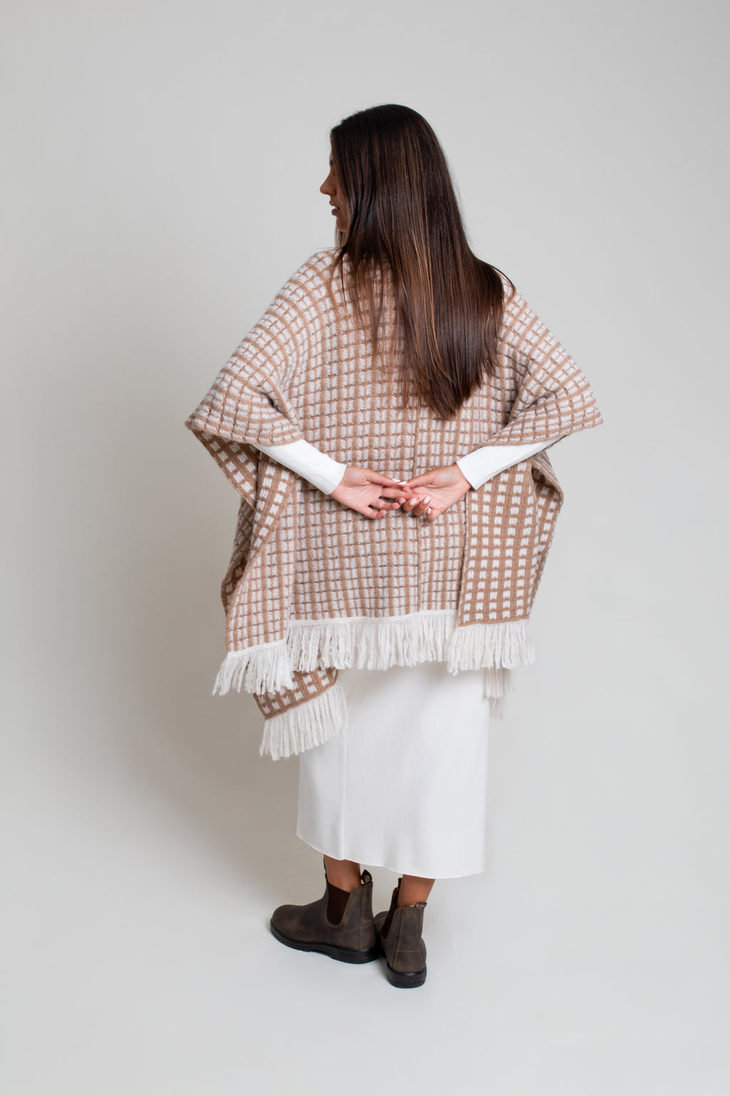 Poncho de punto tricot bicolor con bolsillos delanteros y bajo con flecos.