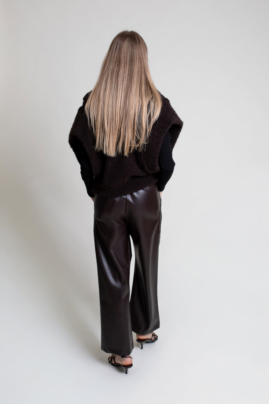 Chaleco corto en punto bouclé con escote pico y manga corta amplia. Costuras marcadas a modo de adorno en escote y mangas. Cierre delantero con broche metálico.