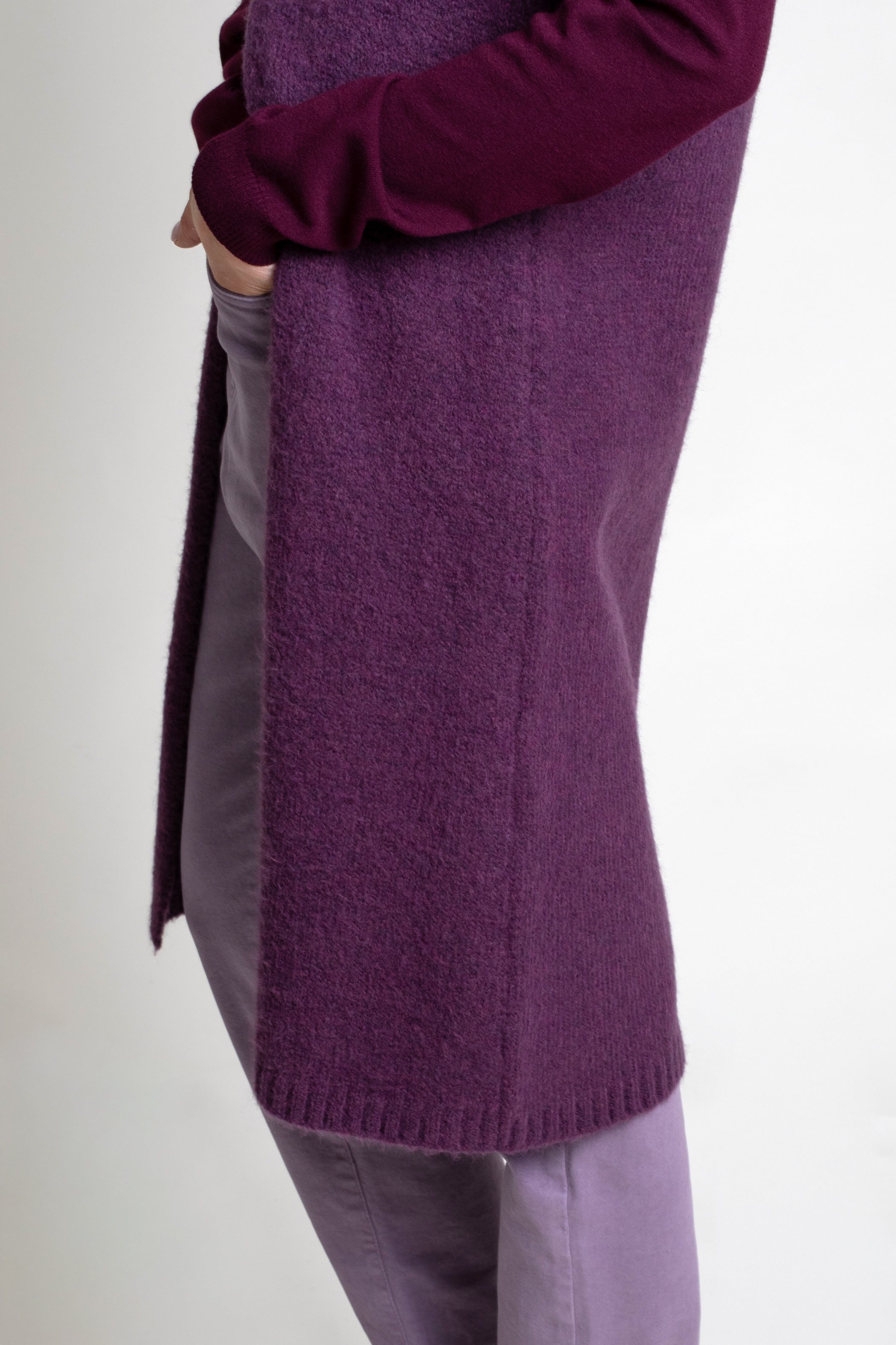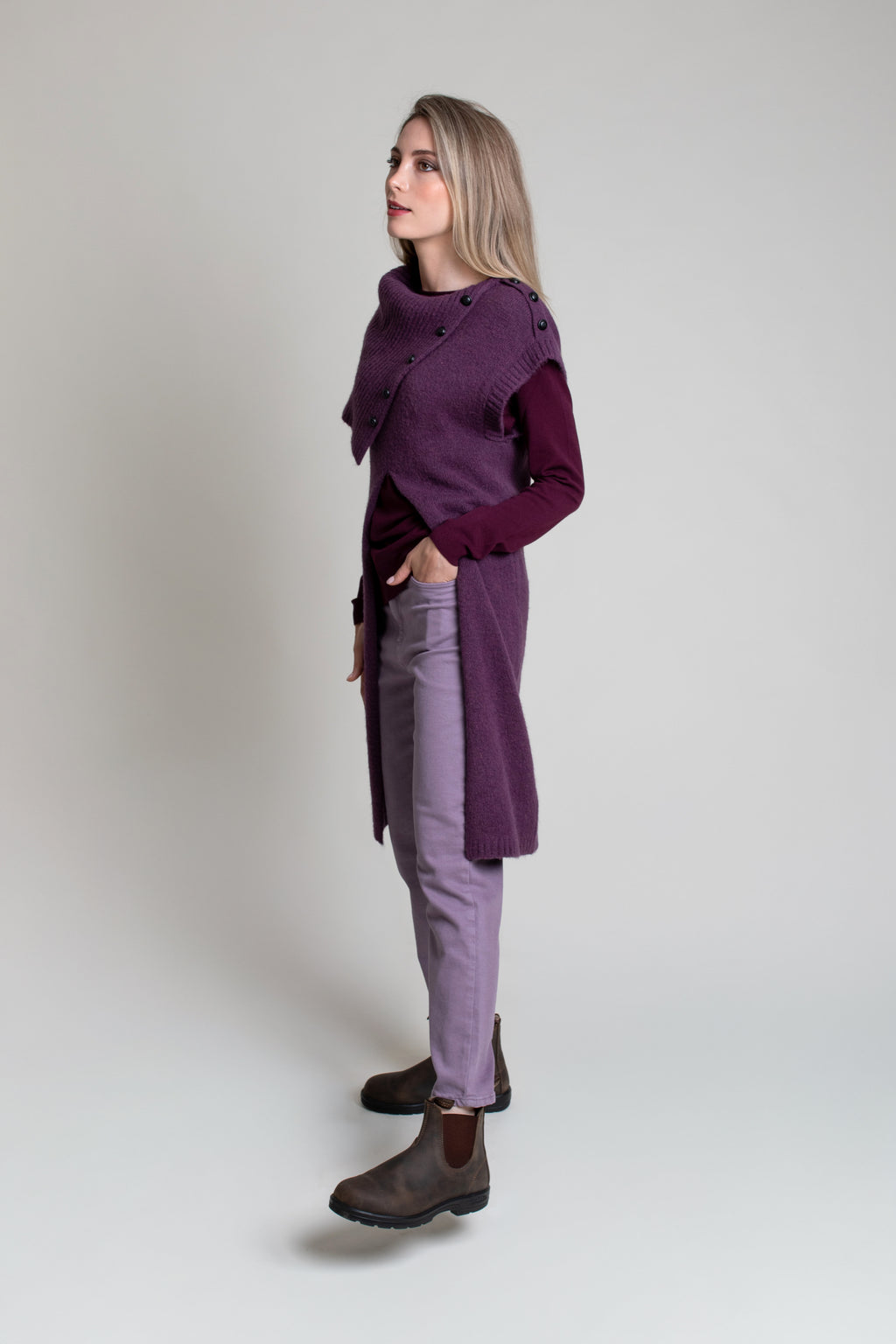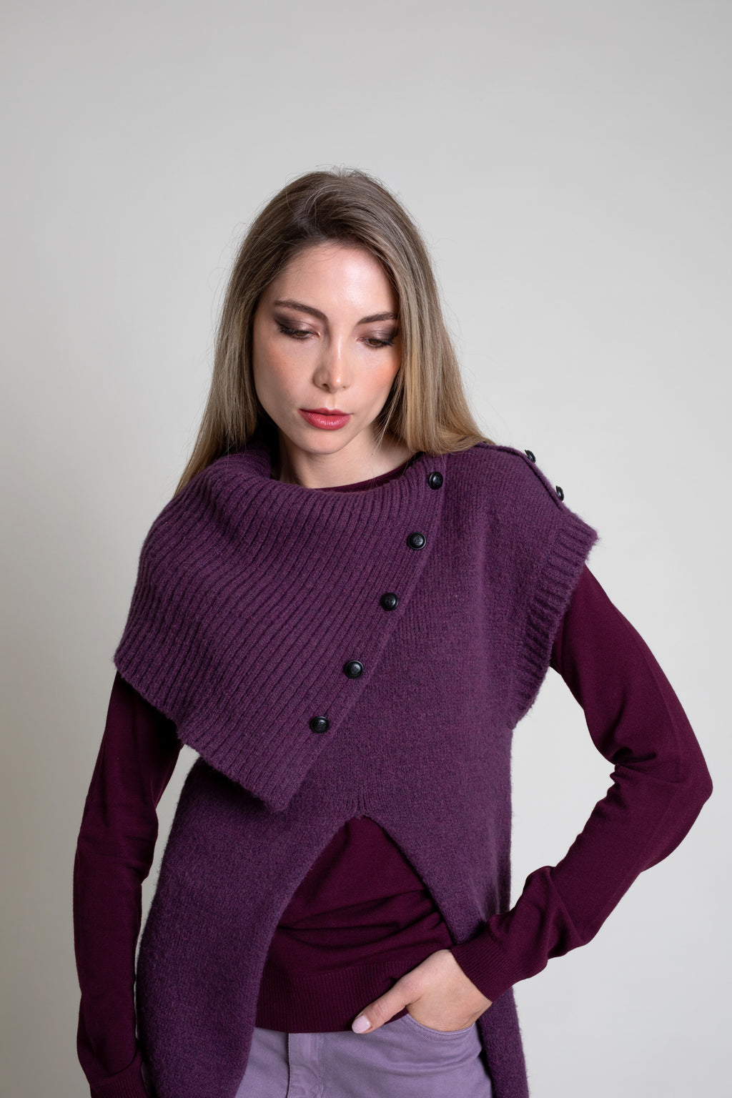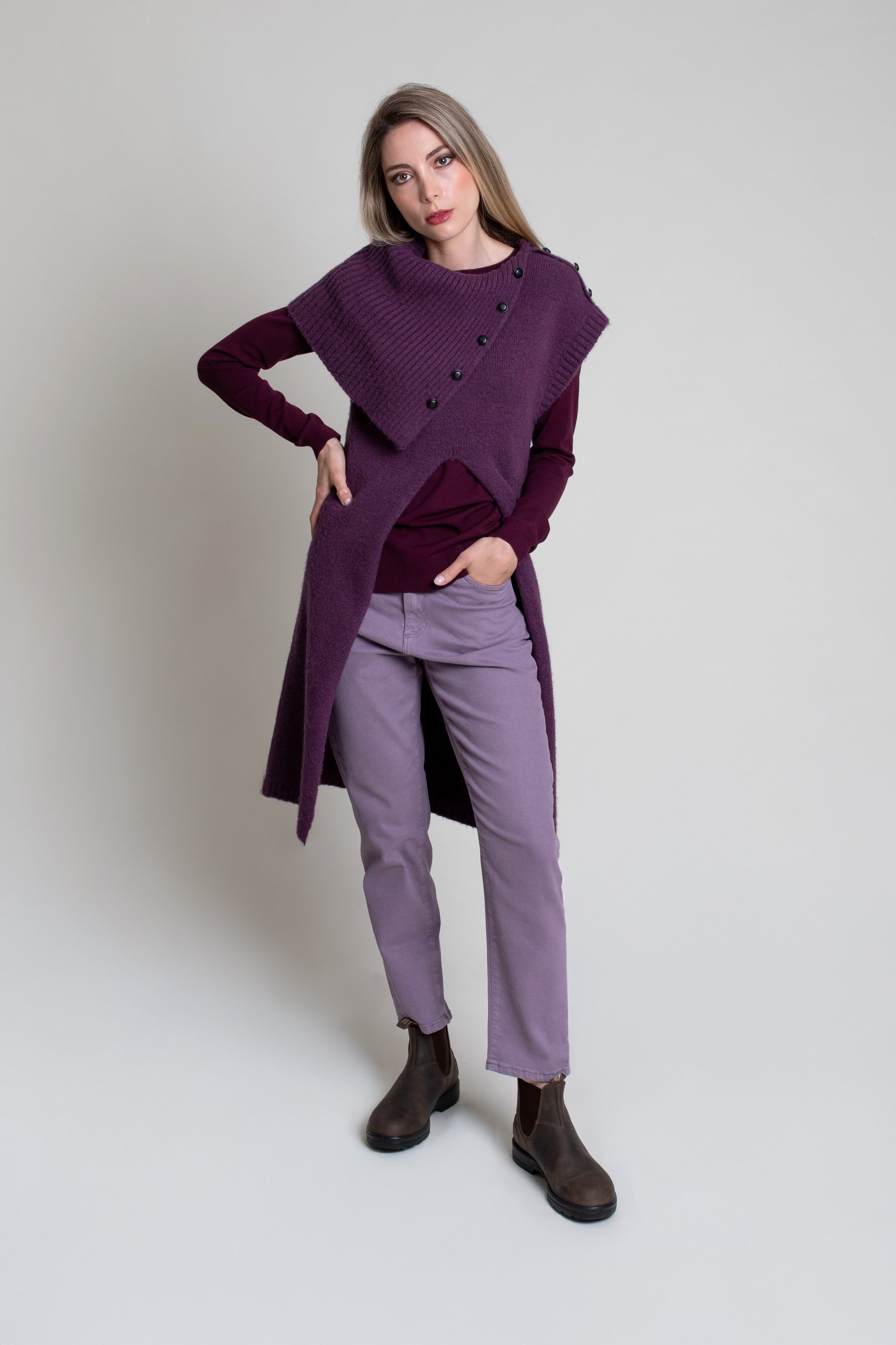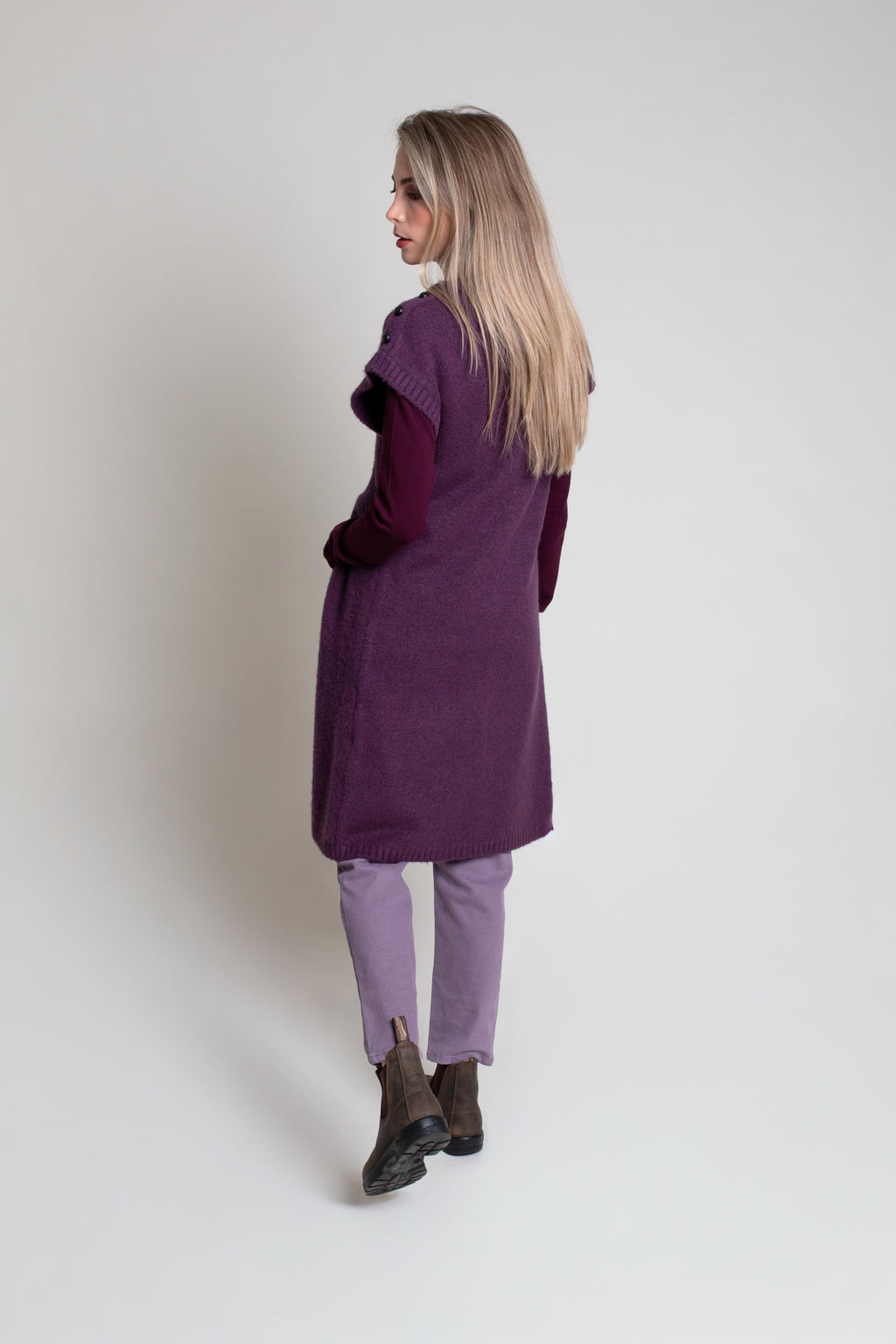Chaleco largo cerrado con abertura central. Modelo de corte recto con manga caída y amplio cuello a modo de adorno con botones metálicos negros.