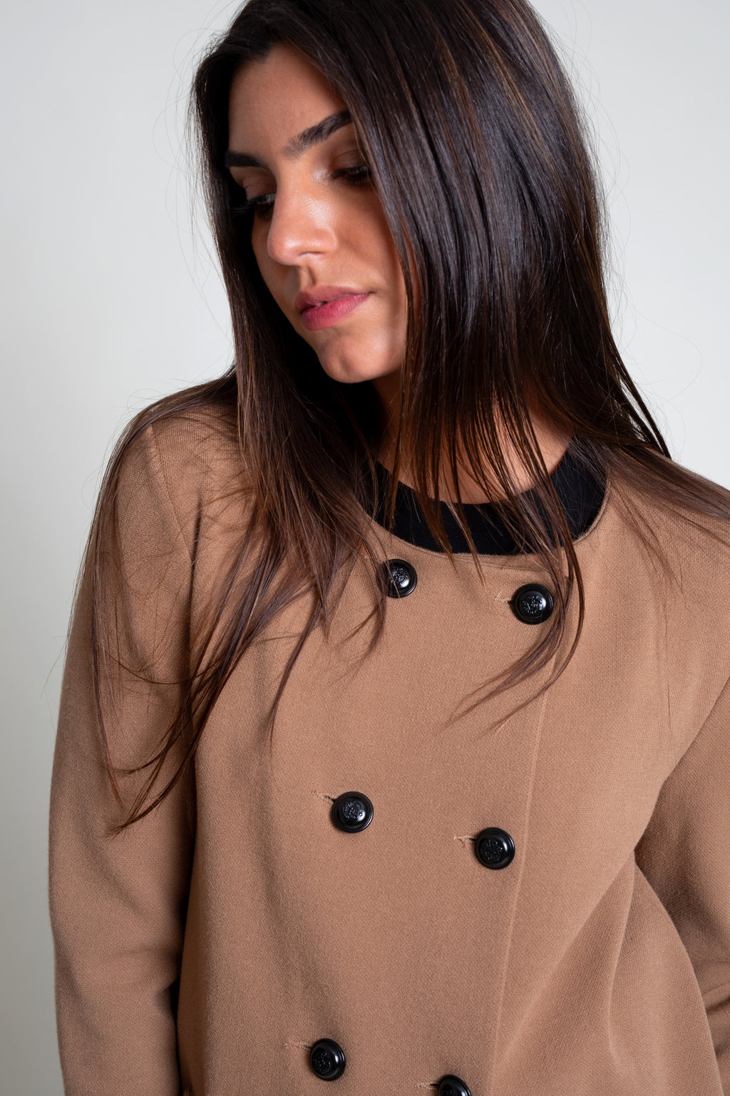 Abrigo de punto tricot con cuello caja y manga larga. Modelo de corte recto con delantero cruzado con cierre de botones metálicos a contraste. Bajo espalda con detalle de volantes