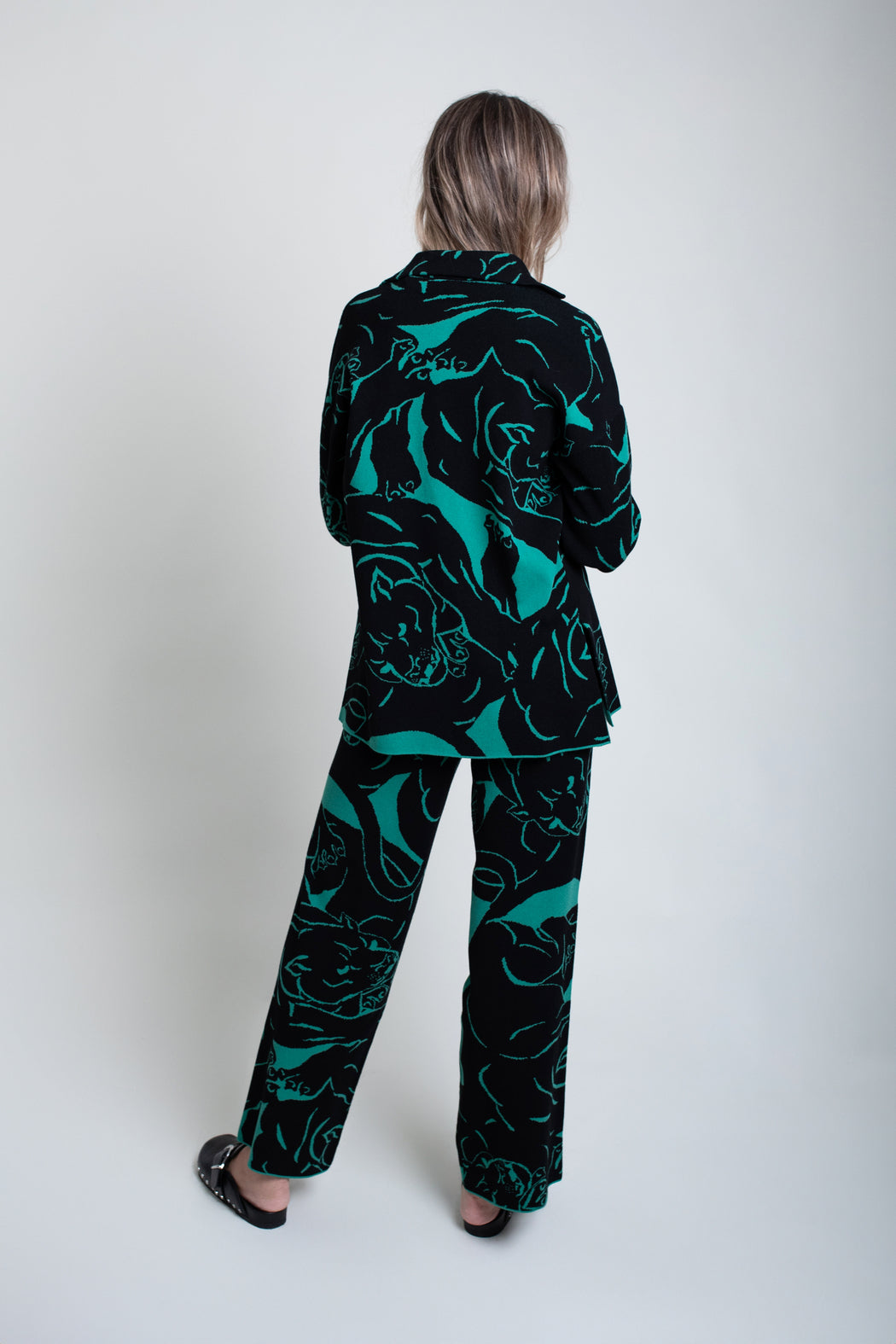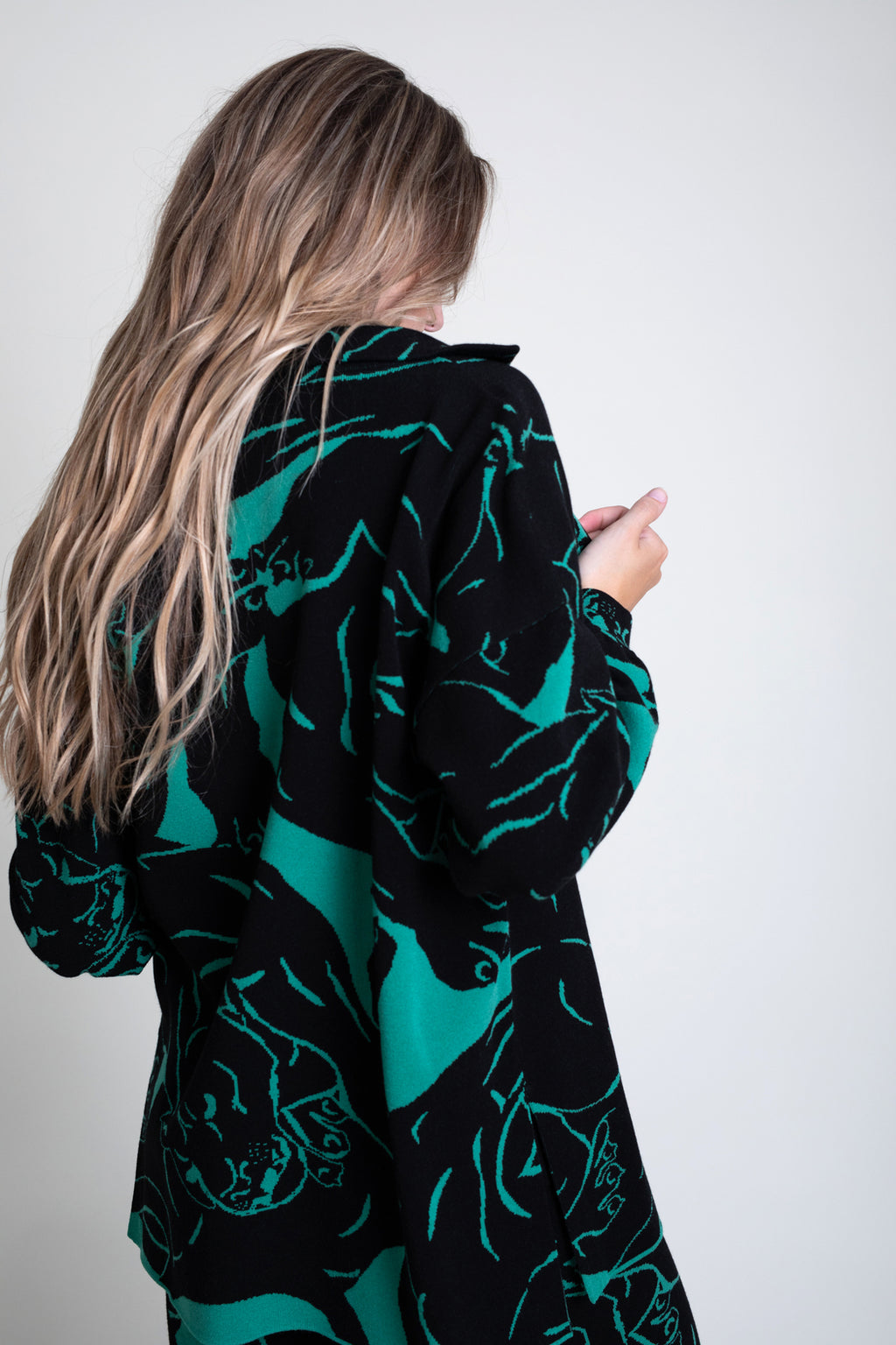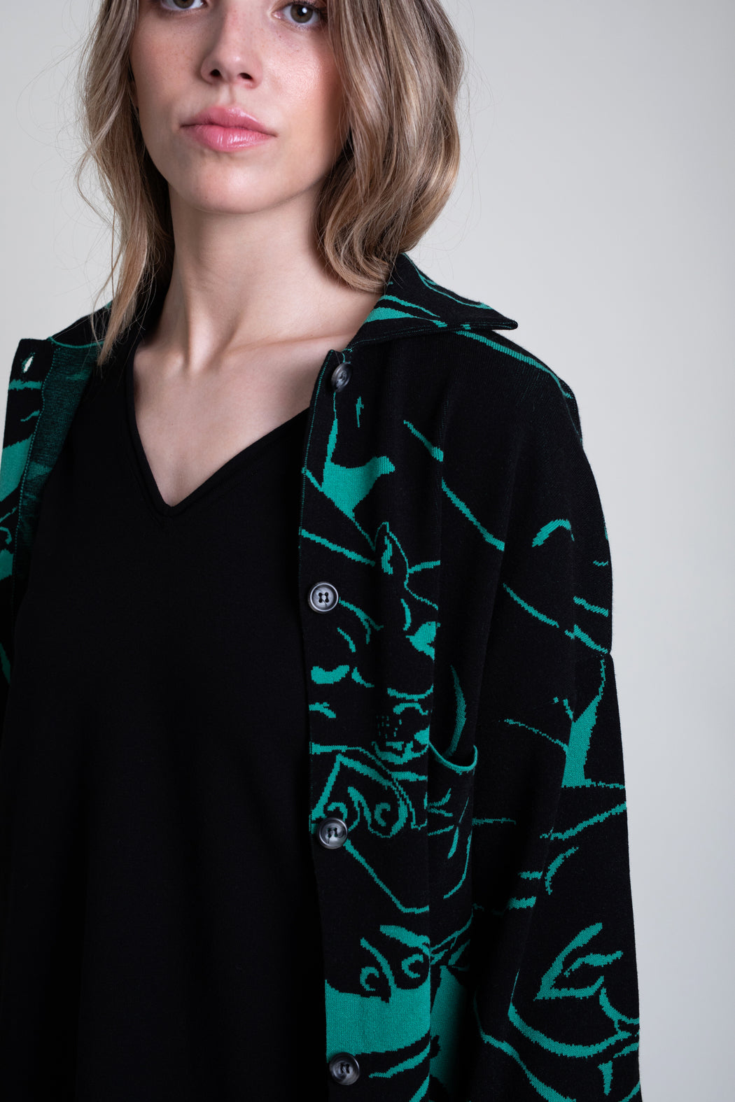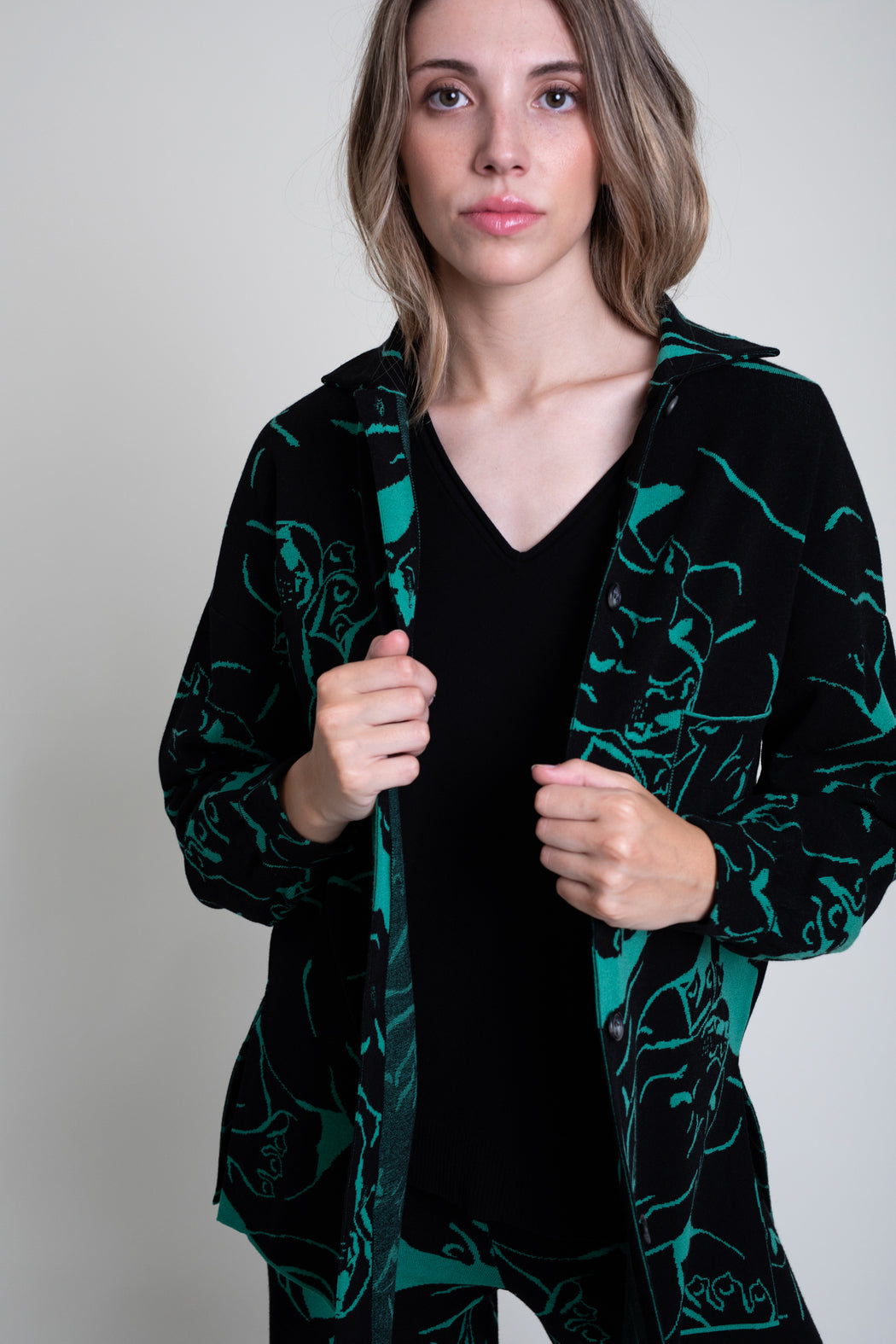 Chaqueta de punto en jacquard animal bicolor. Modelo de corte recto tipo sobrecamisa en manga larga caída con puños y cuello camisero. Cierre frontal con botones y bolsillo plastón