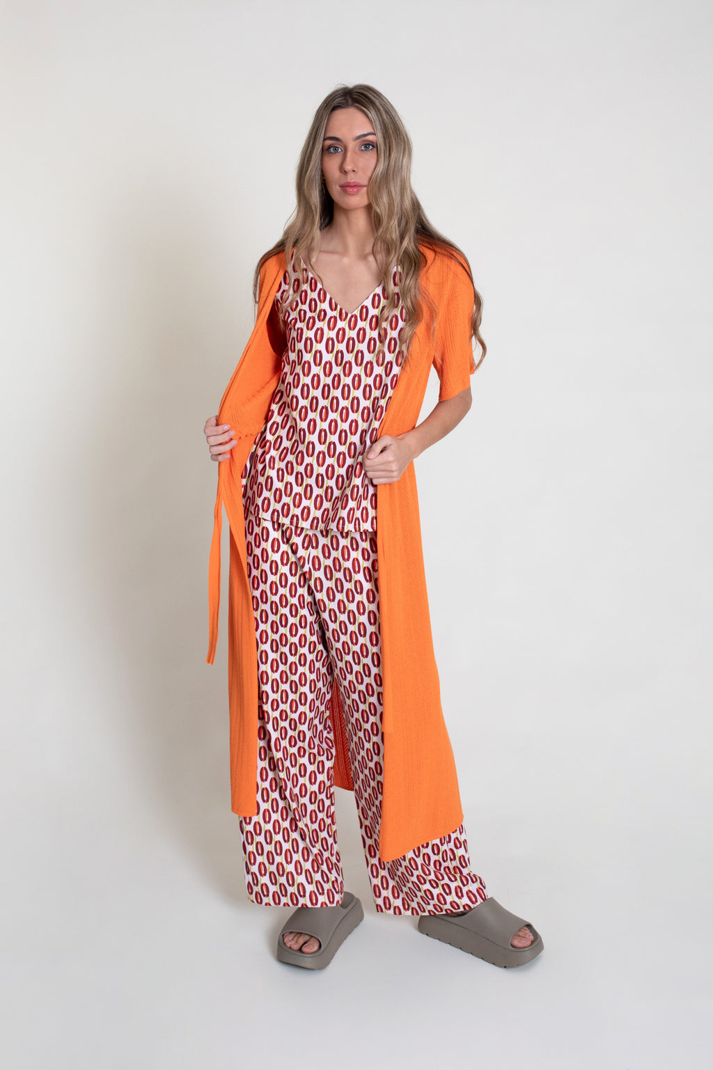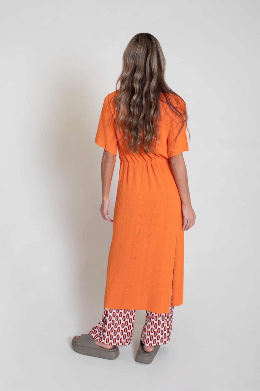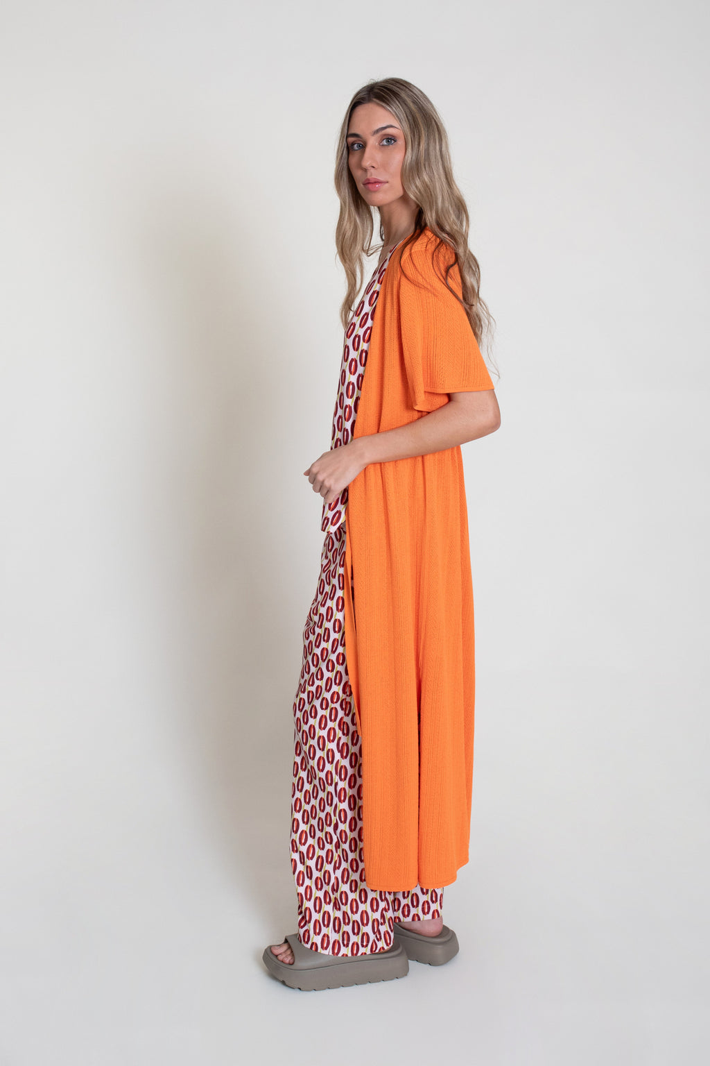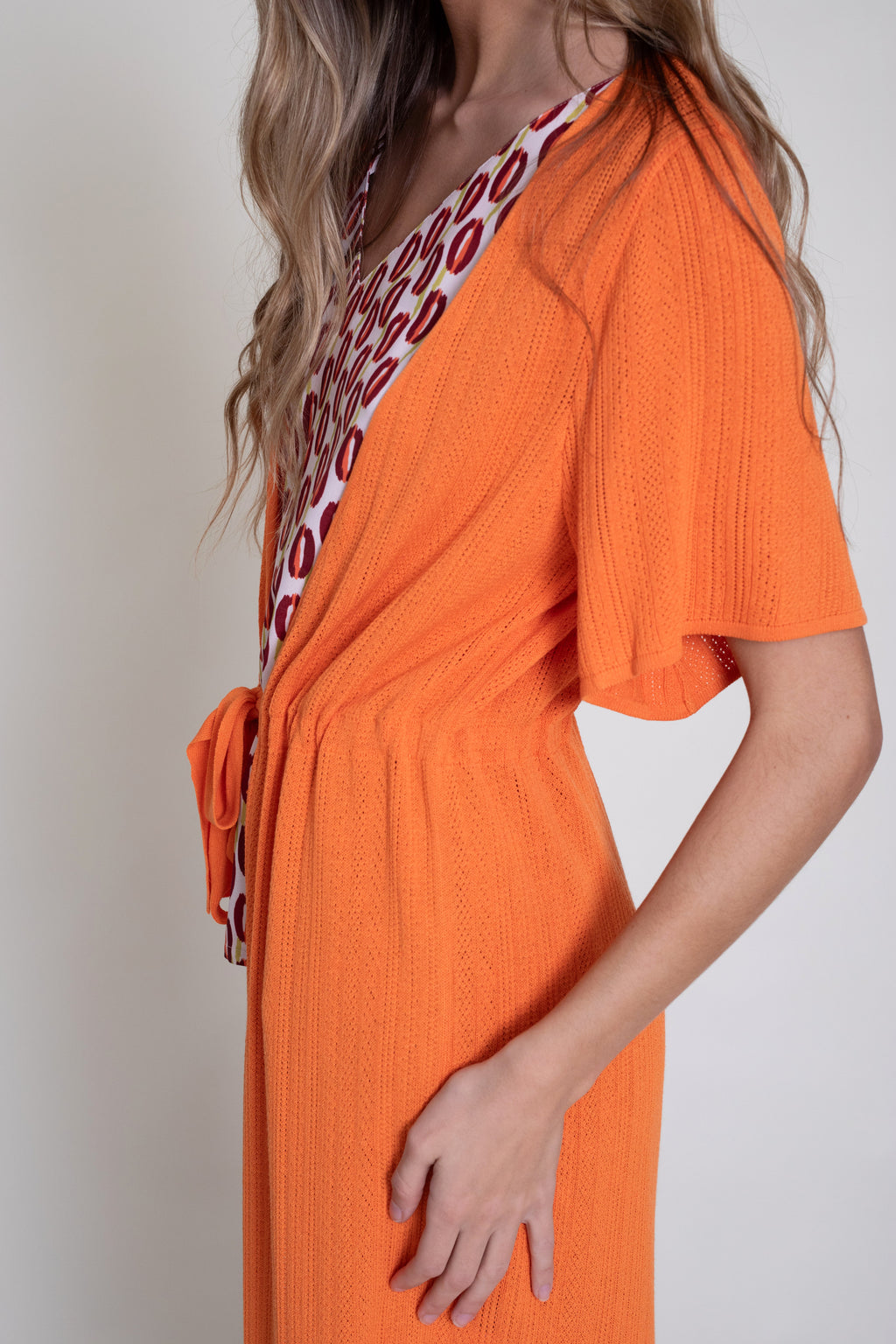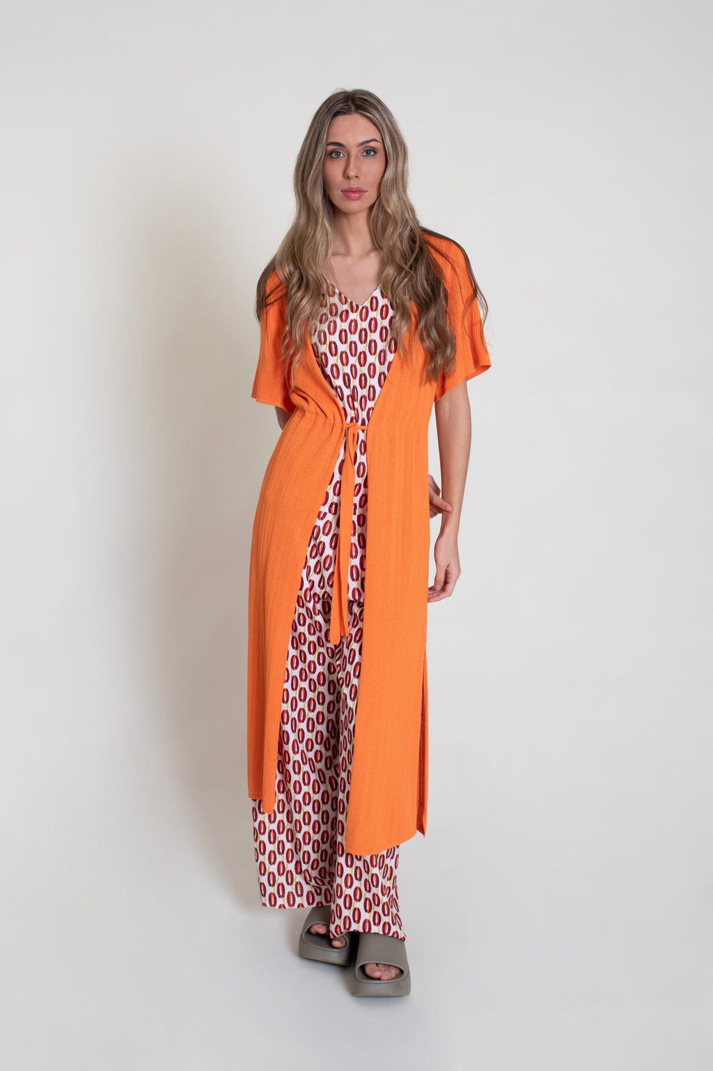 Chaqueta larga de punto tricot con relieve, escote pico y manga corta. Modelo con aberturas laterales y corte fruncido, cierre mediante tira de punto.