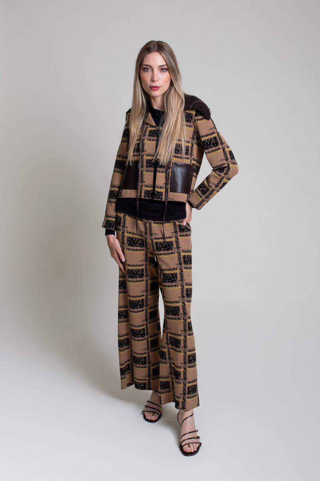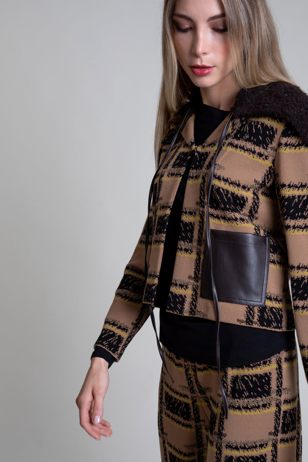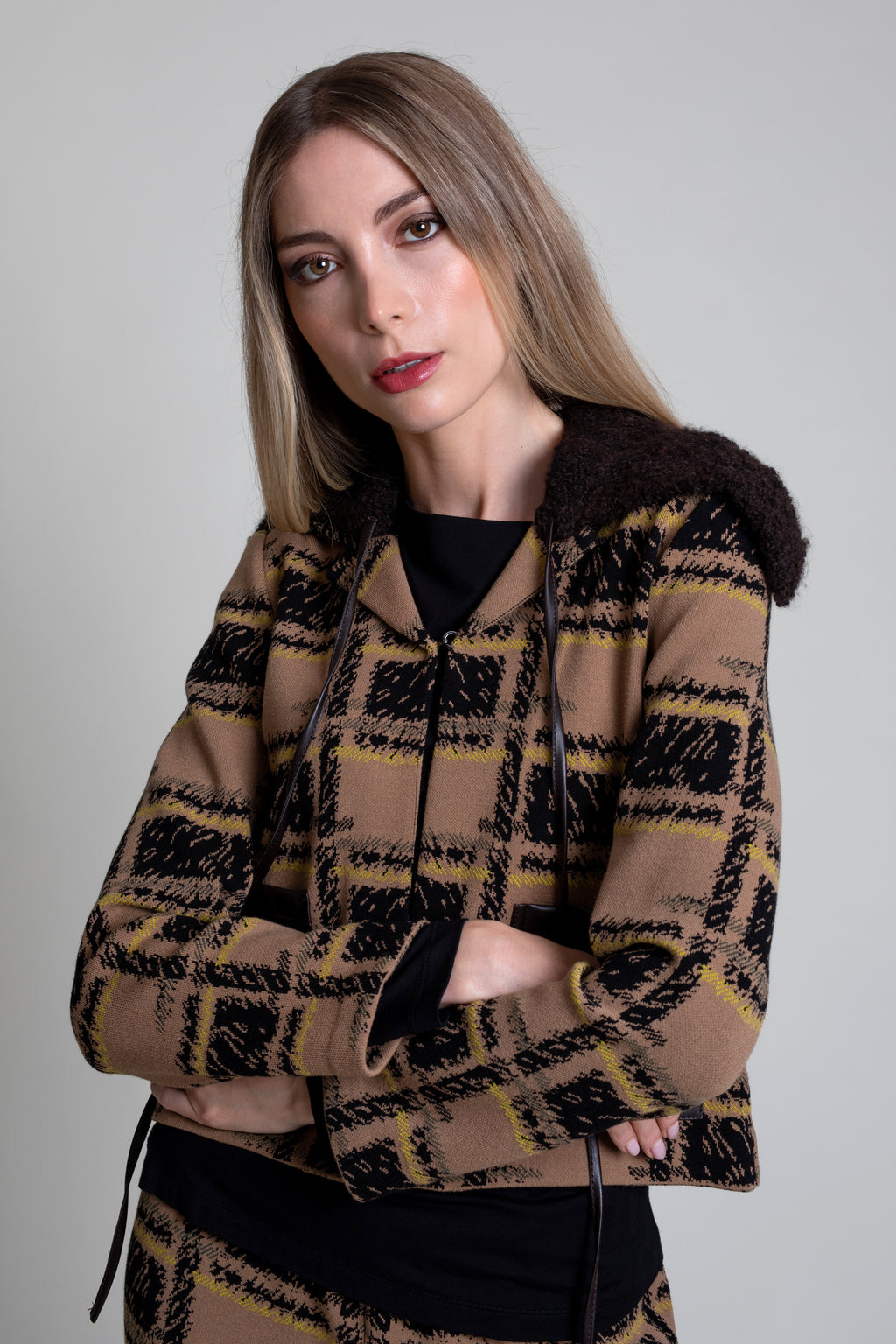 Chaqueta corta de punto tricot con intarsia de cuadros, cuello solapa y manga larga. Corte recto con bolsillos de polipiel en delantero y cuello extraíble en bouclé marrón