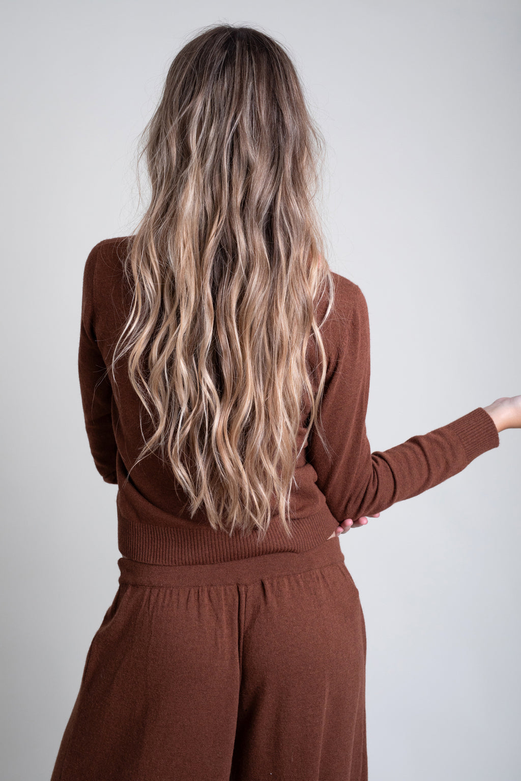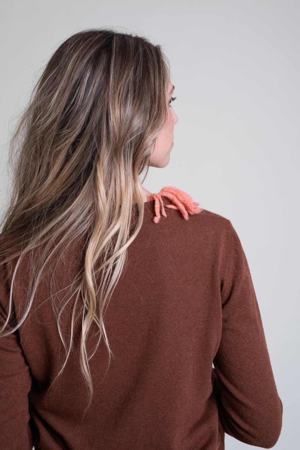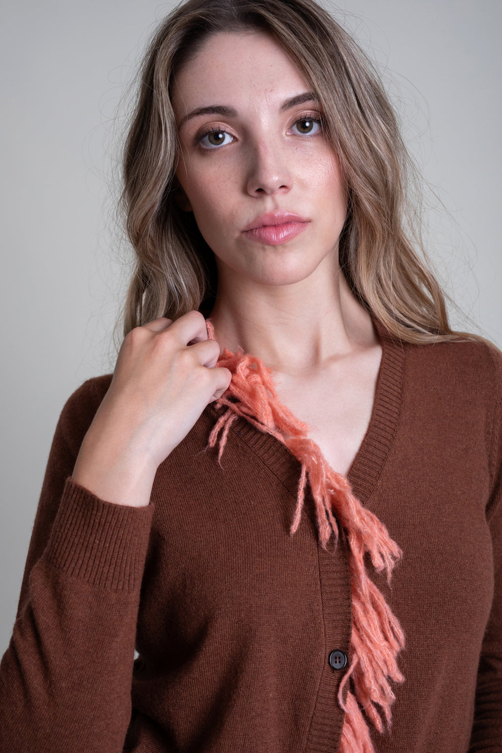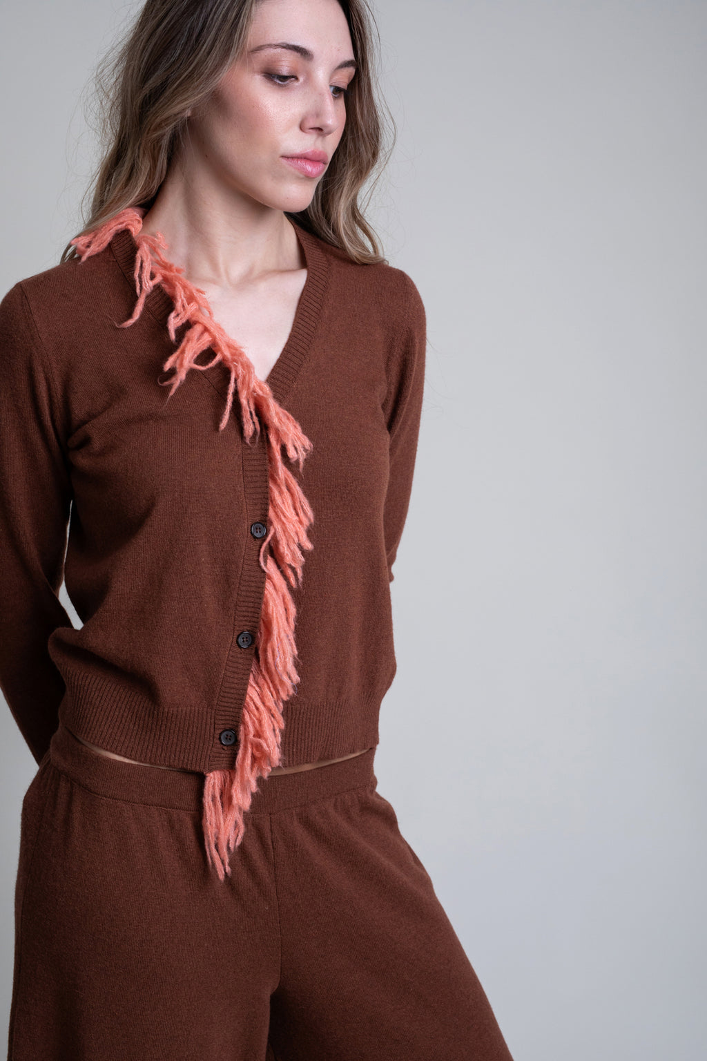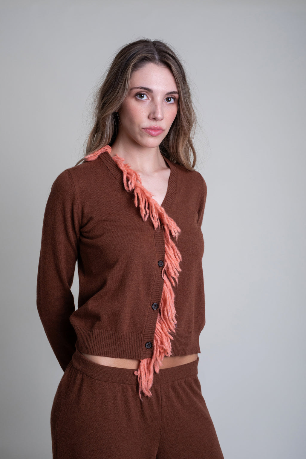 Chaqueta corta de punto con manga larga y cuello pico. Cierre frontal con botones y adorno de flecos a contraste