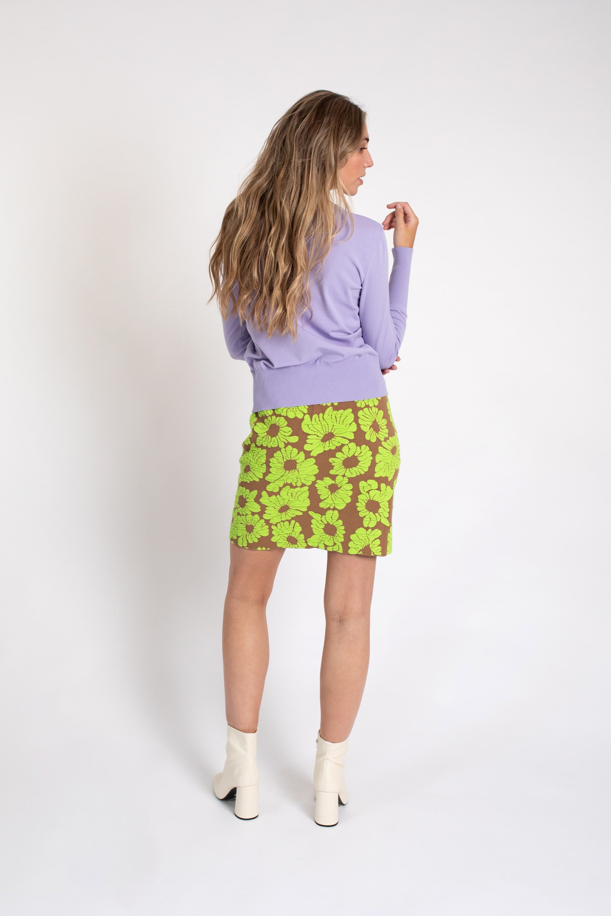 Falda mini en jacquard de punto con flores a contraste. Corte recto y cintura con goma