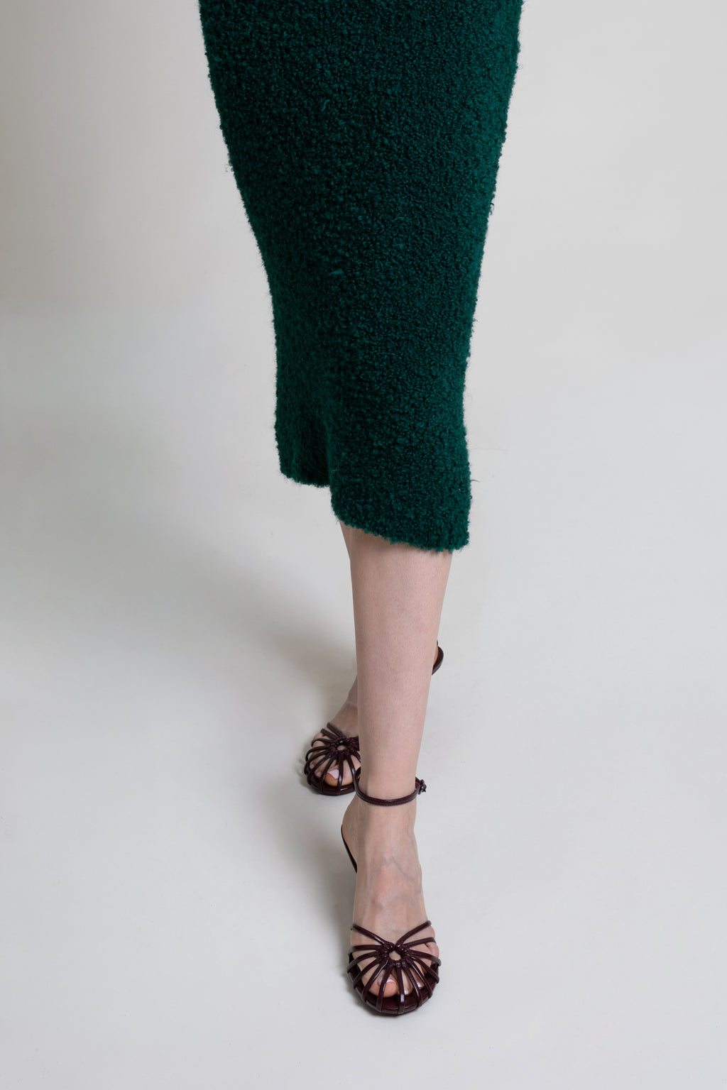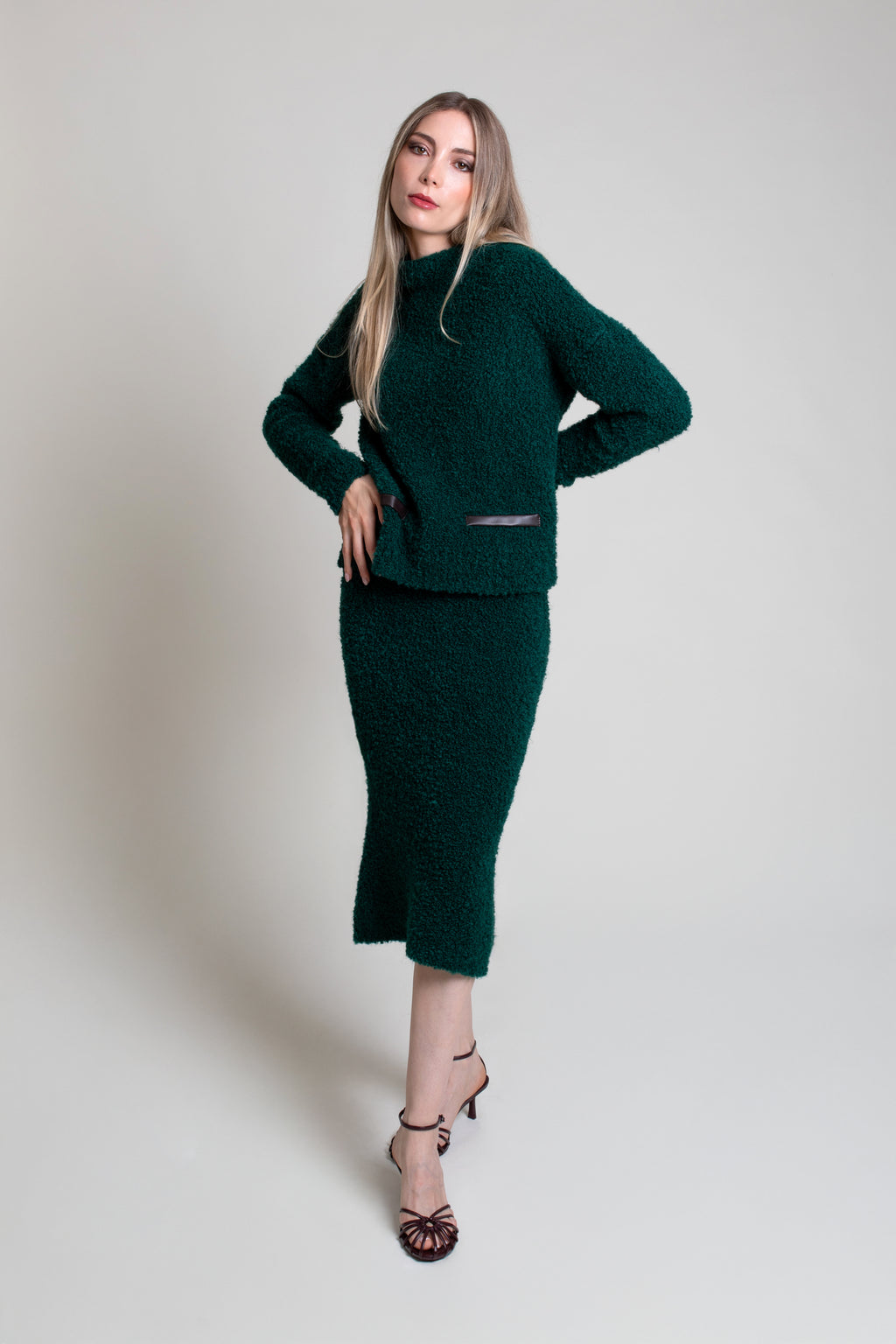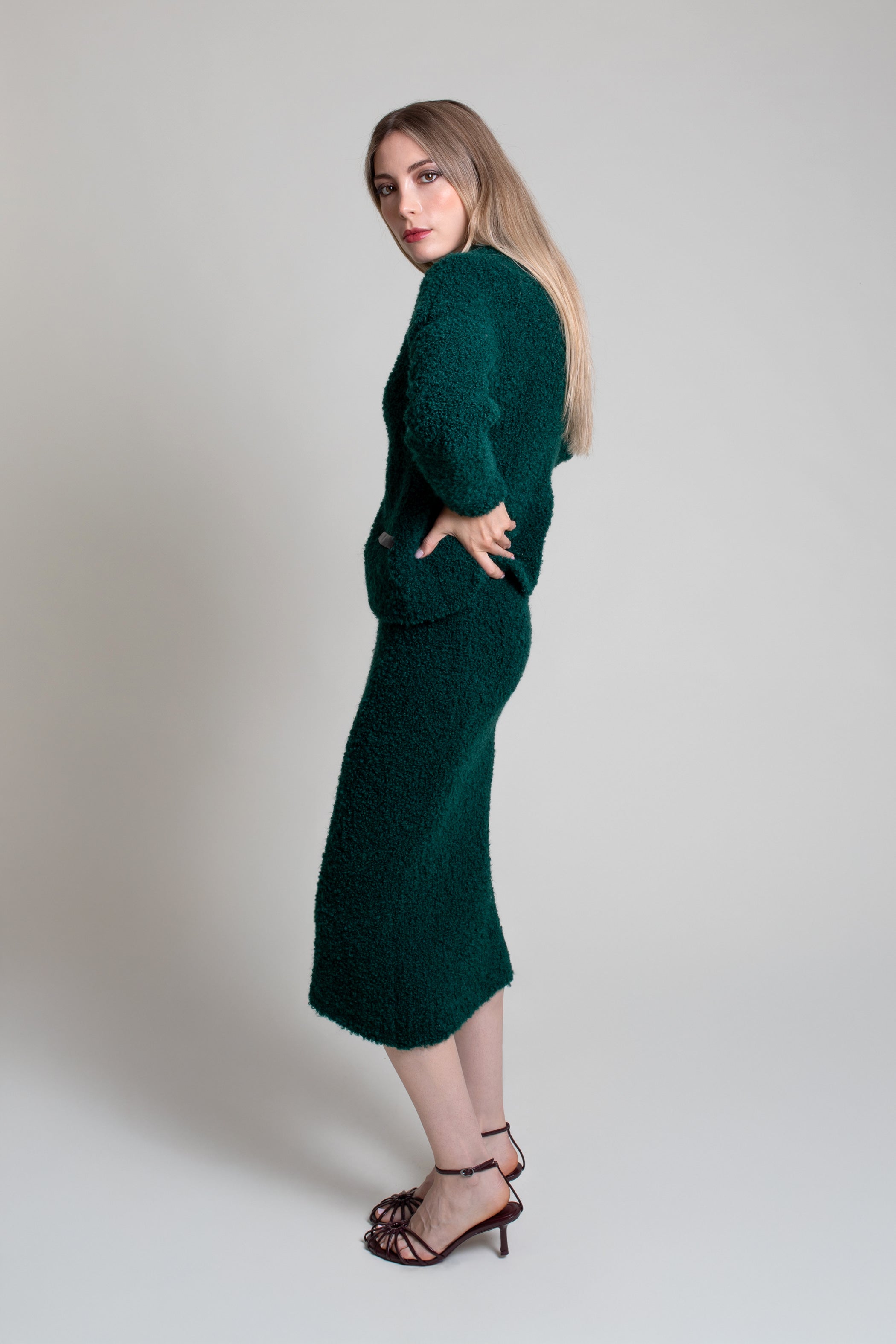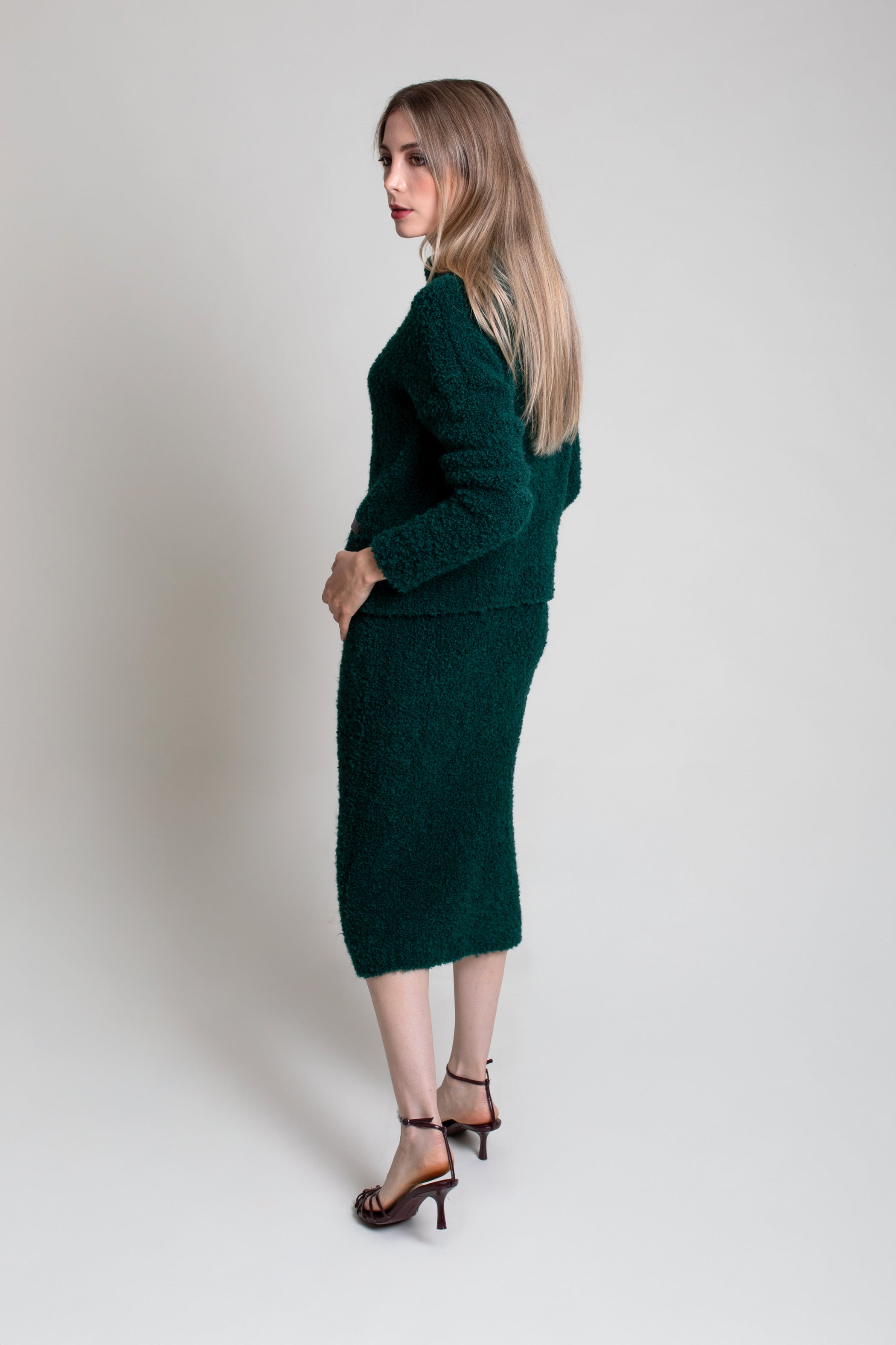 Falda midi corte sirena en buclé de punto. Cintura con goma