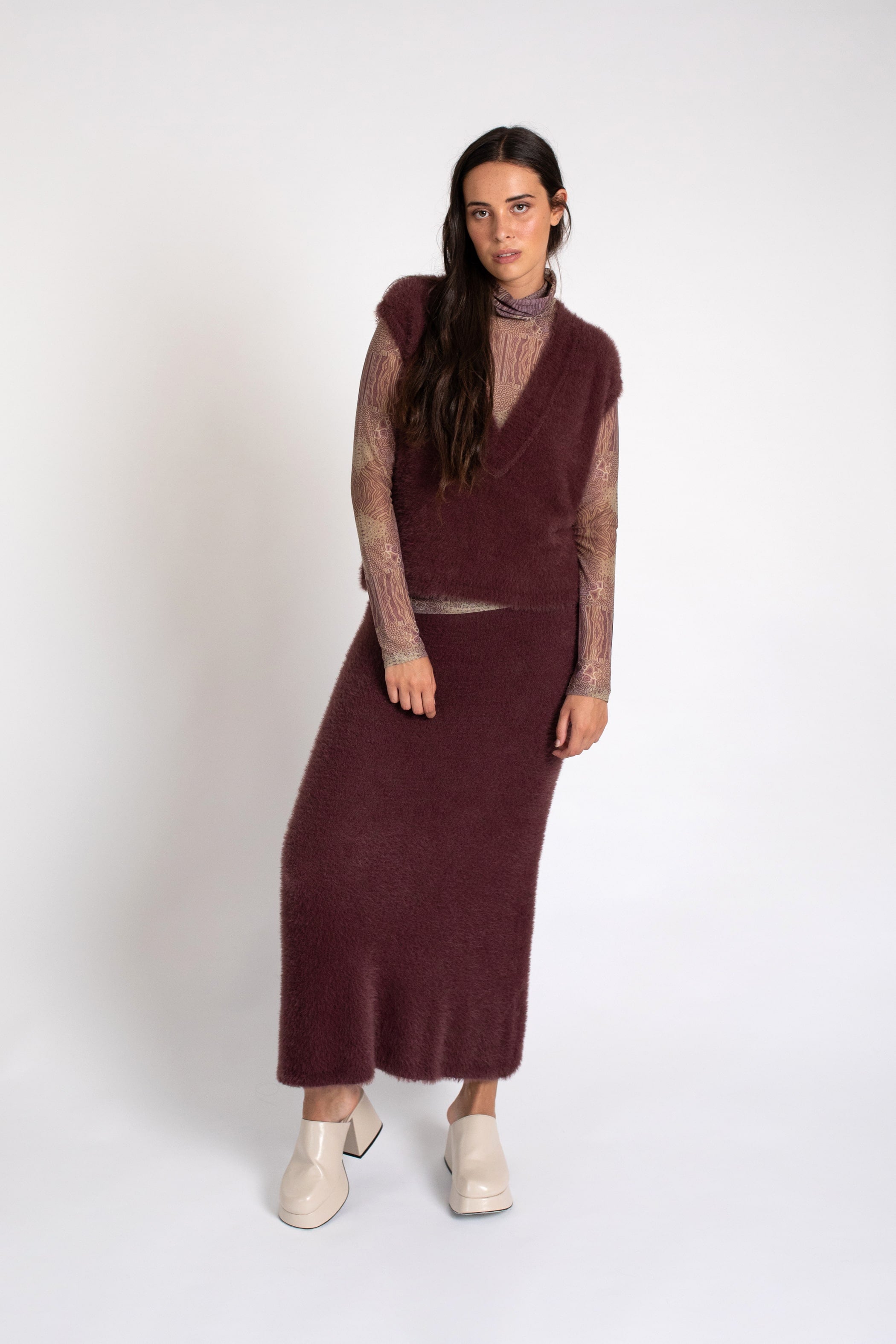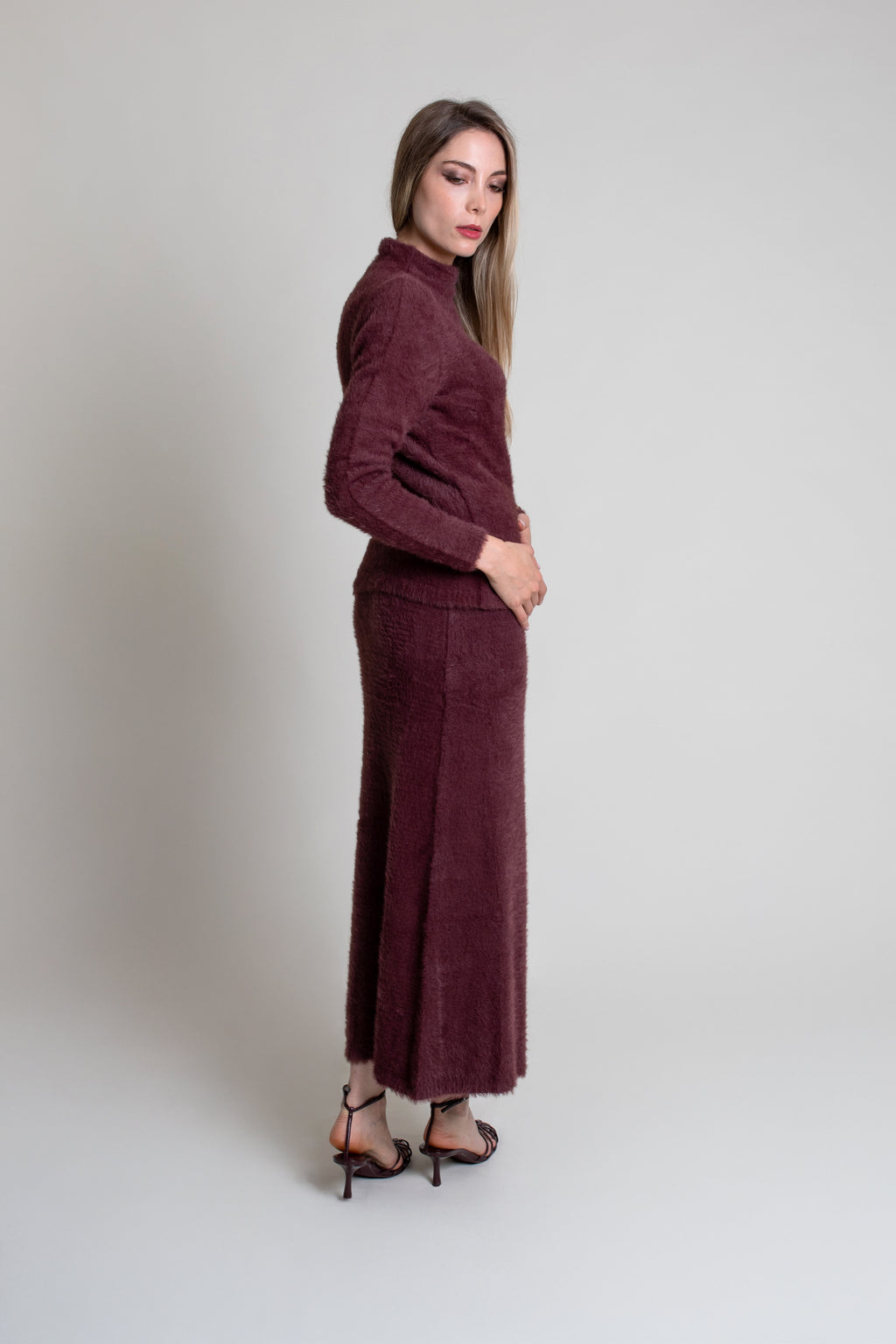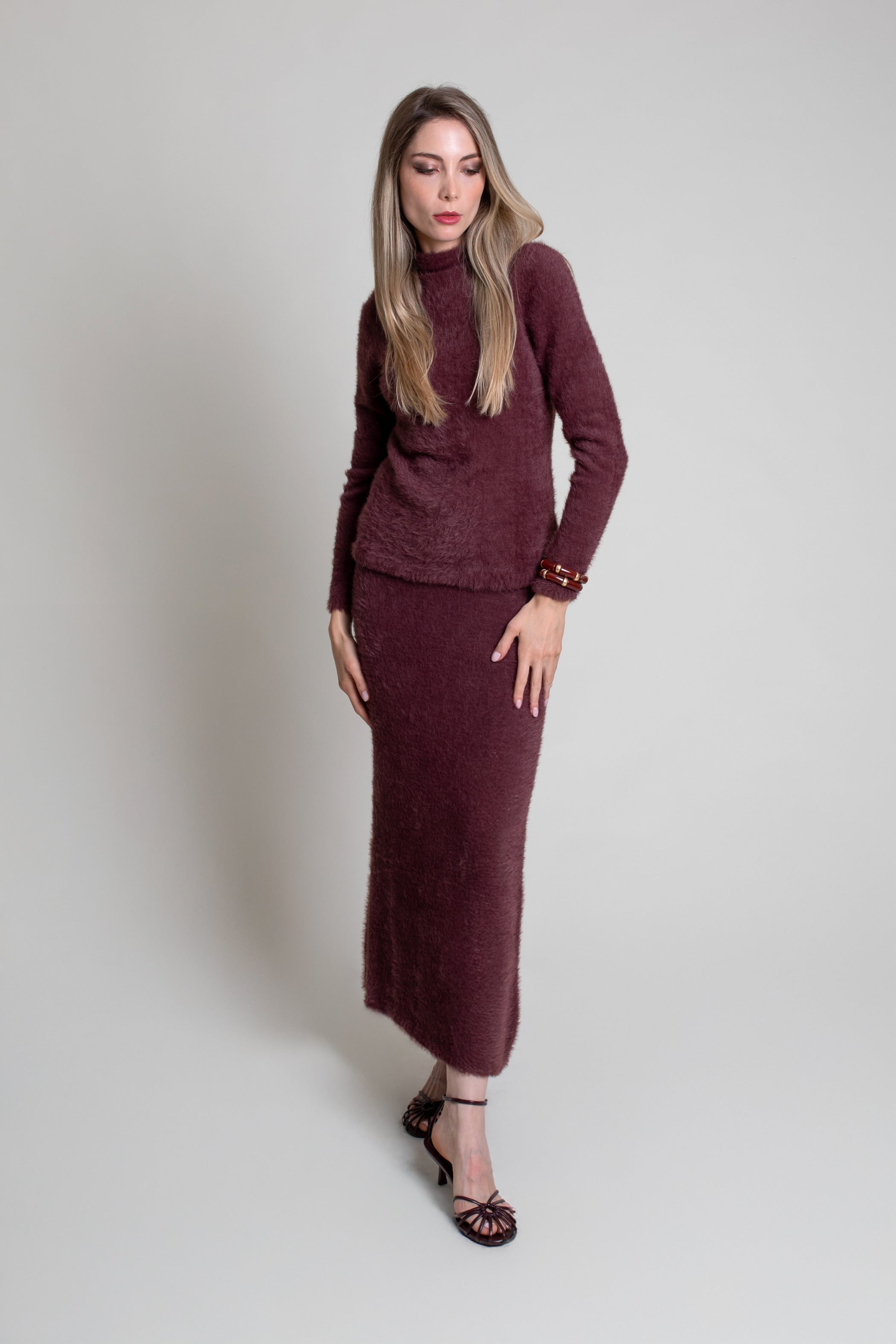 Falda de punto suave con textura de pelo, con corte recto y cintura con goma.