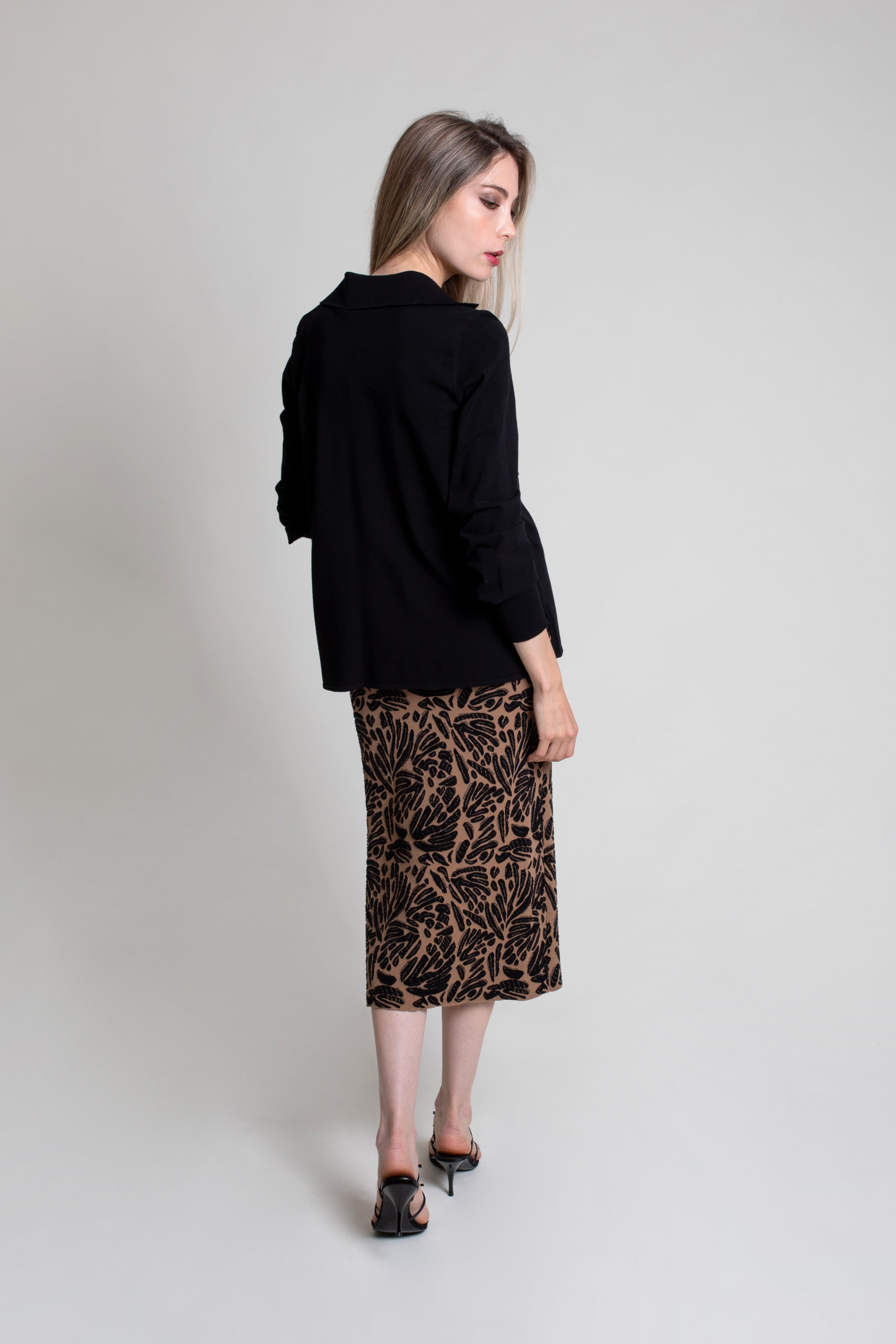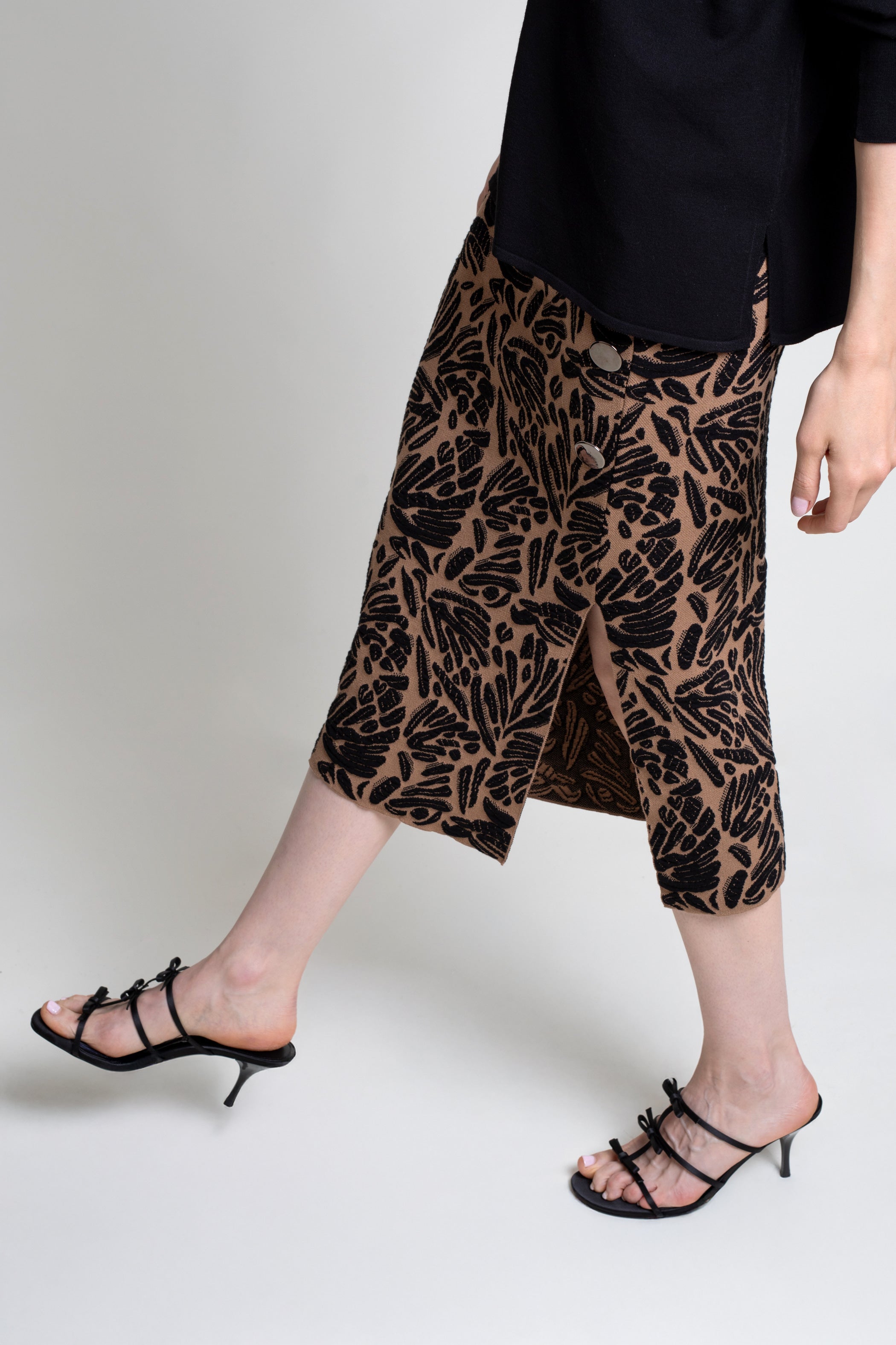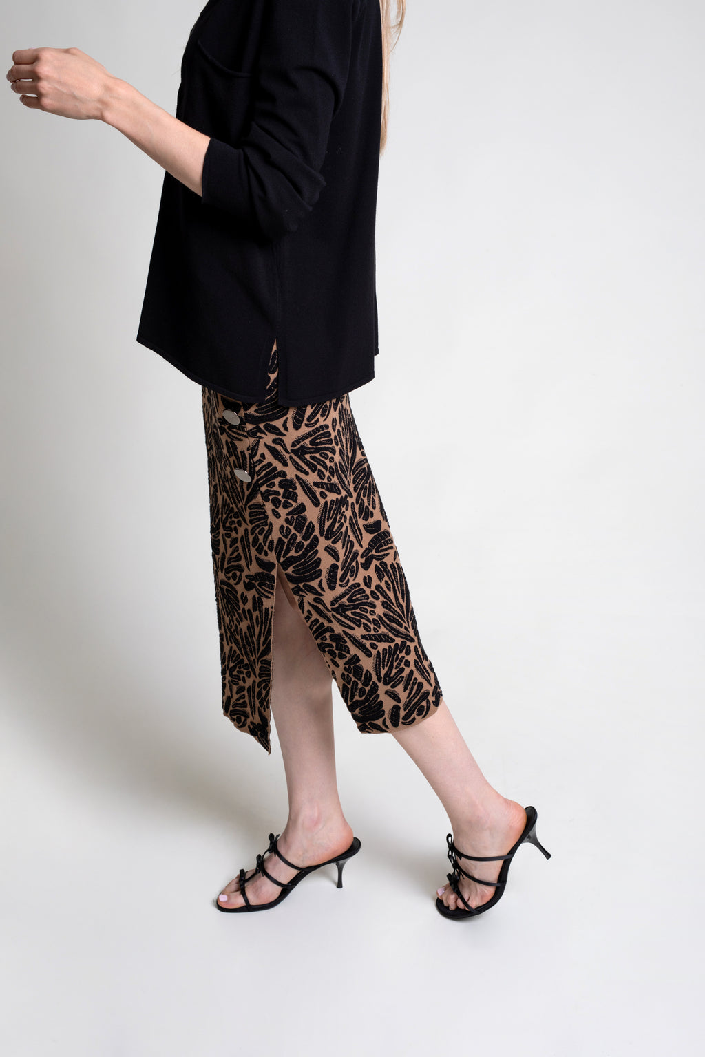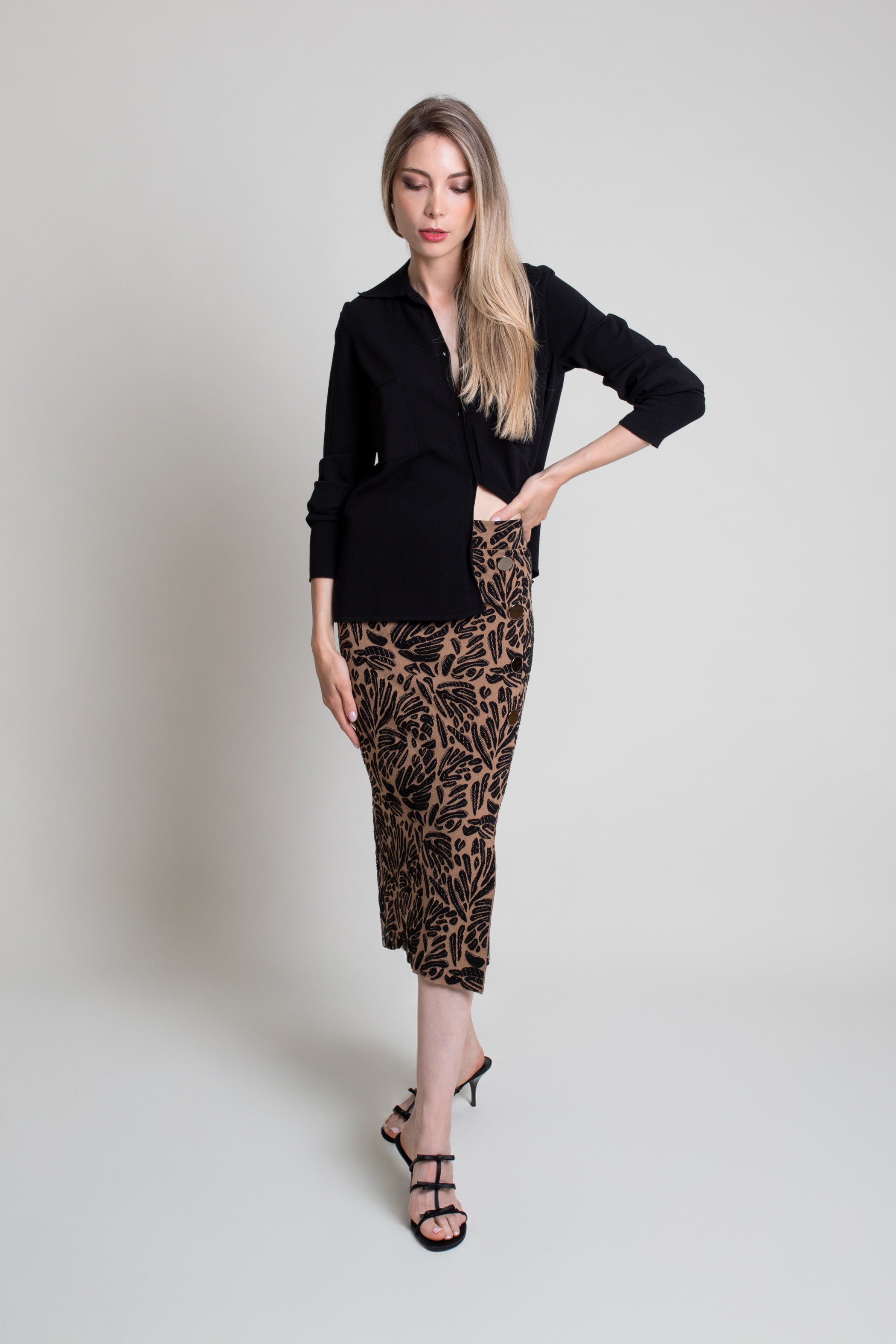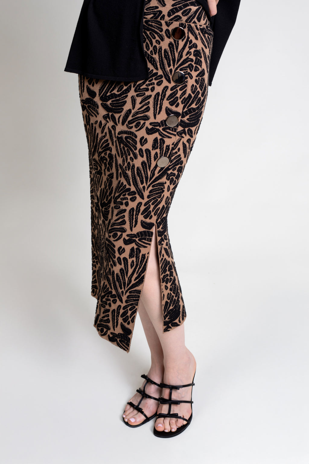 Falda midi en jacquard de punto bicolor. Modelo de corte entallado con abertura en centro pierna y botones metálicos a modo de adorno. Cintura con goma