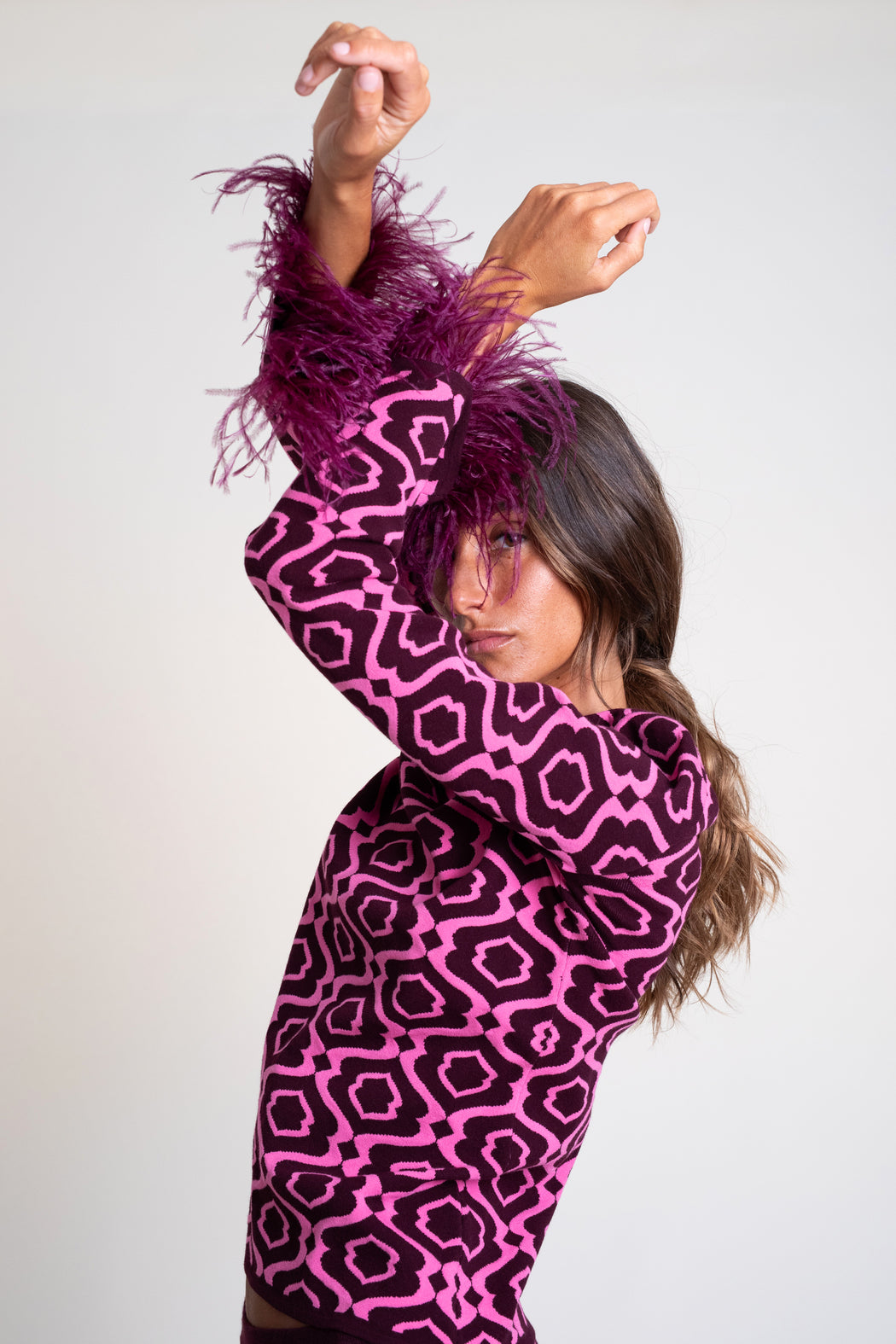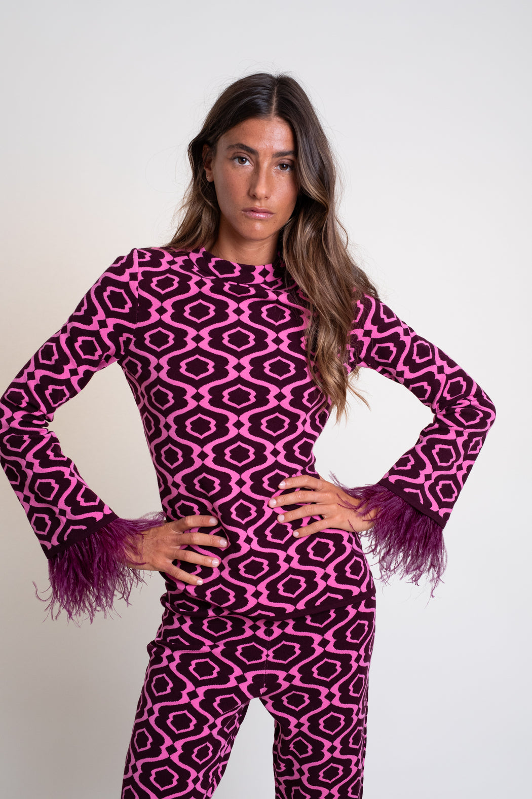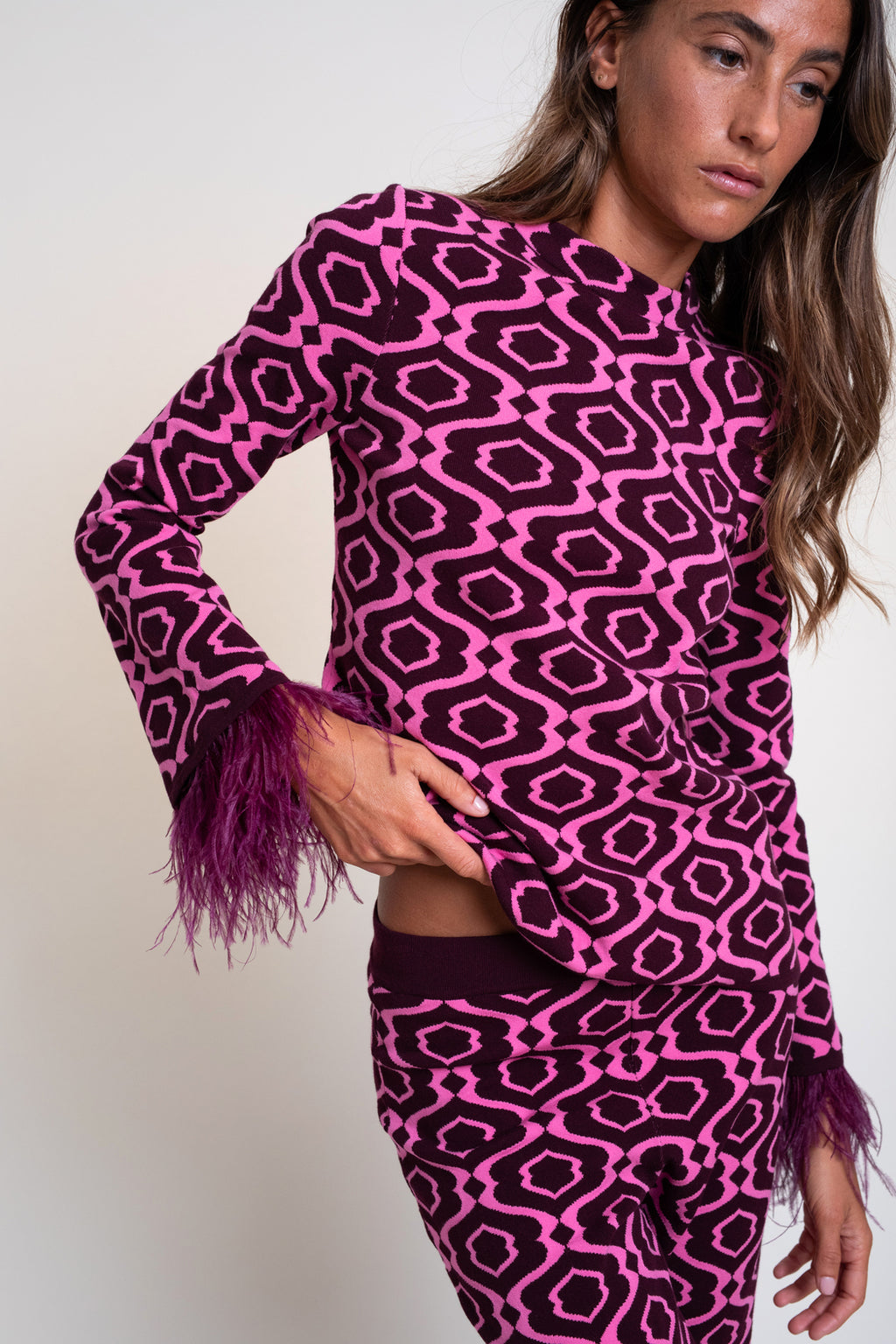 Jersey de punto tricot en jacquard bicolor. Modelo de corte recto, manga larga y cuello perkins. Puño con adorno de plumas desmontable