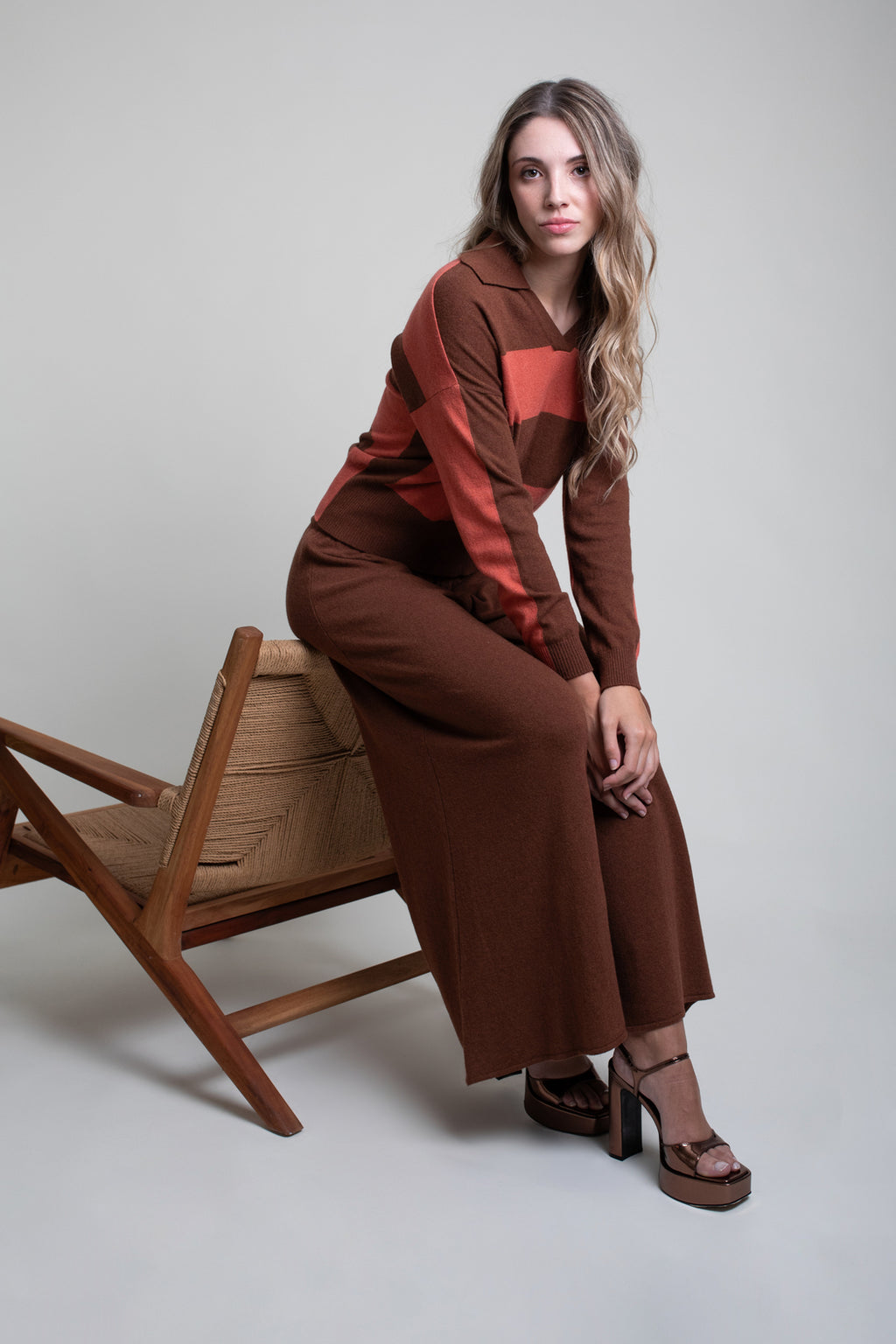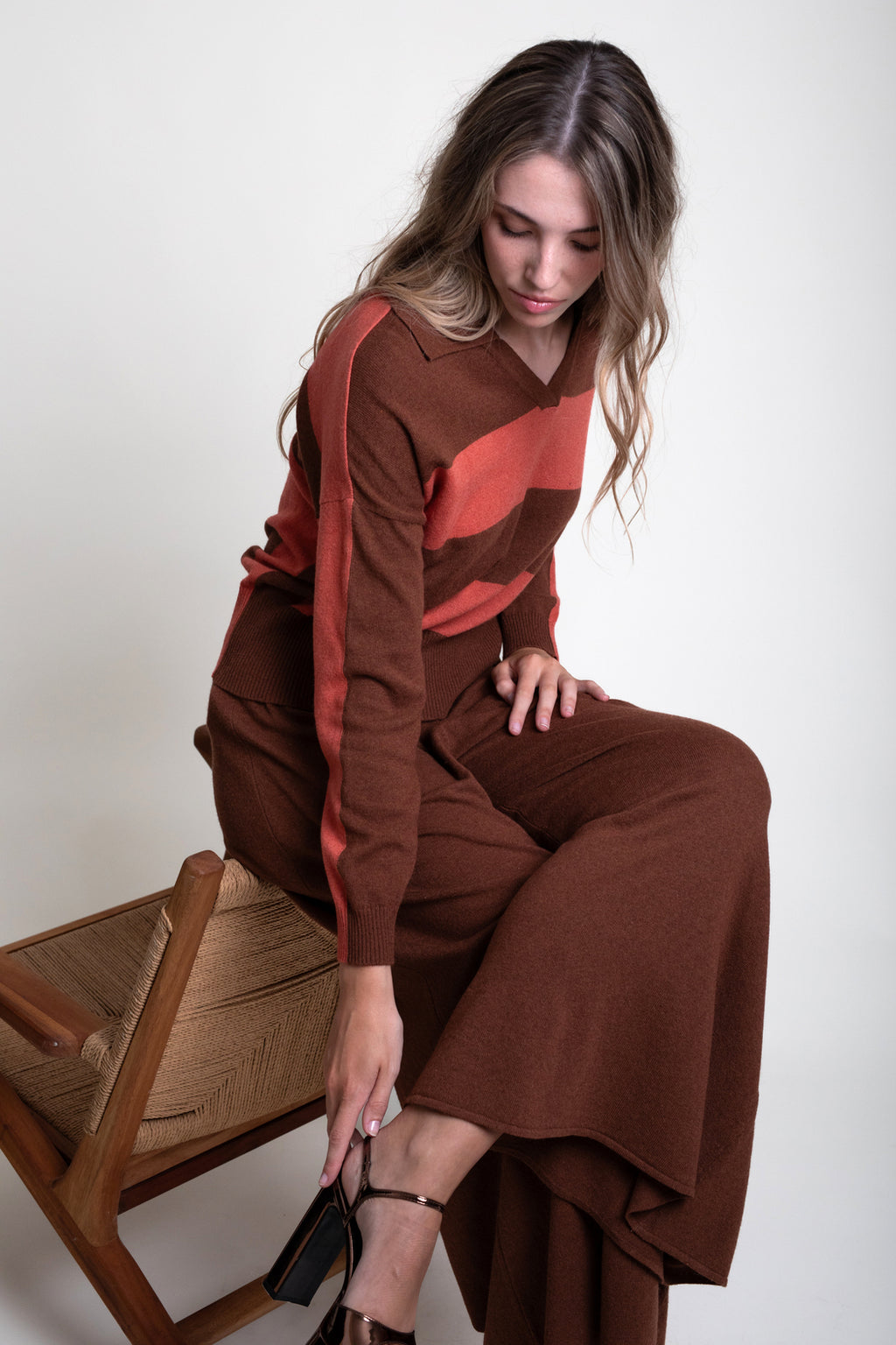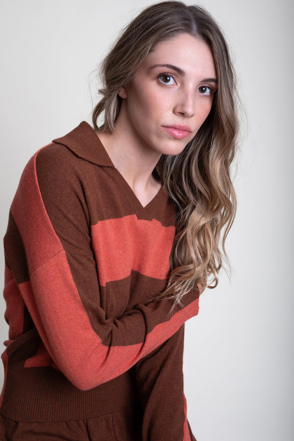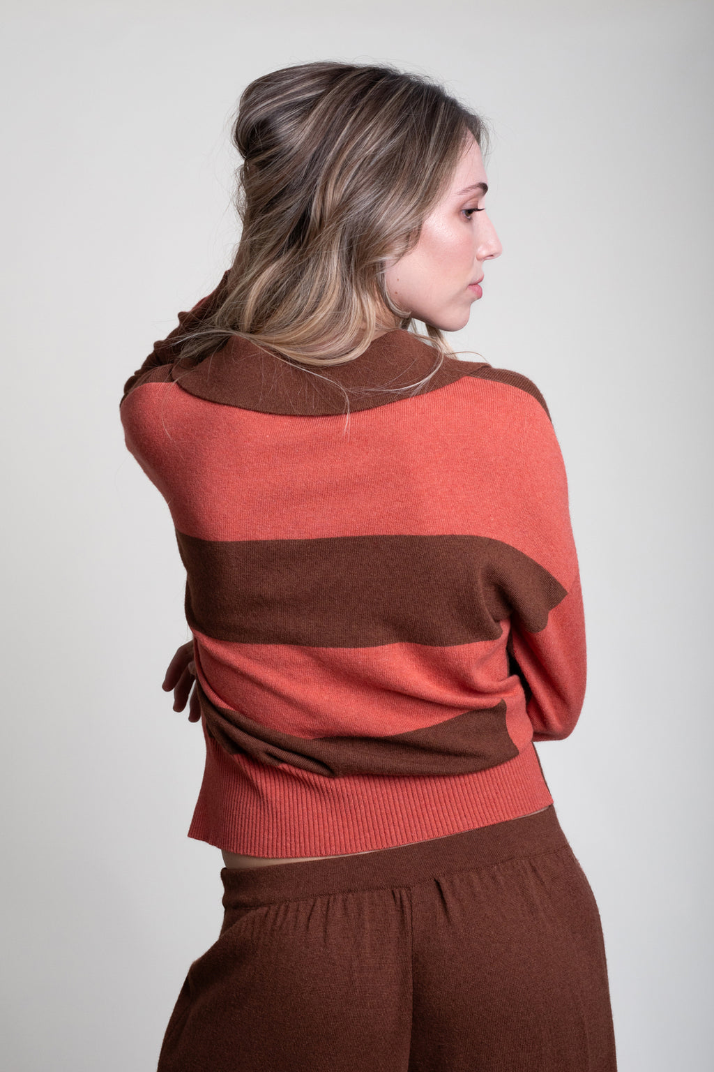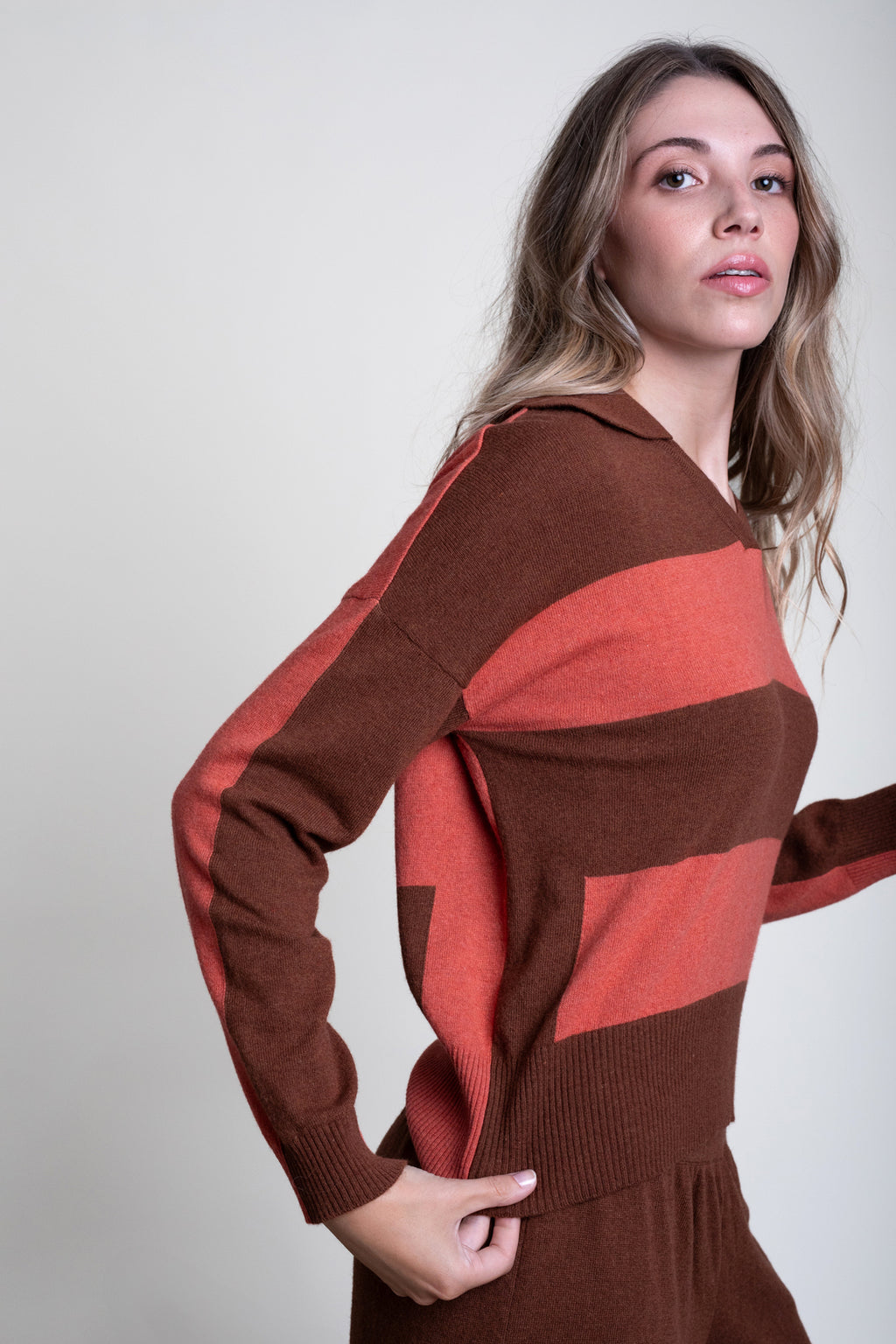 Jersey de punto tricot de rayas. Modelo de corte ligeramente oversize con cuello camisero y manga caída.