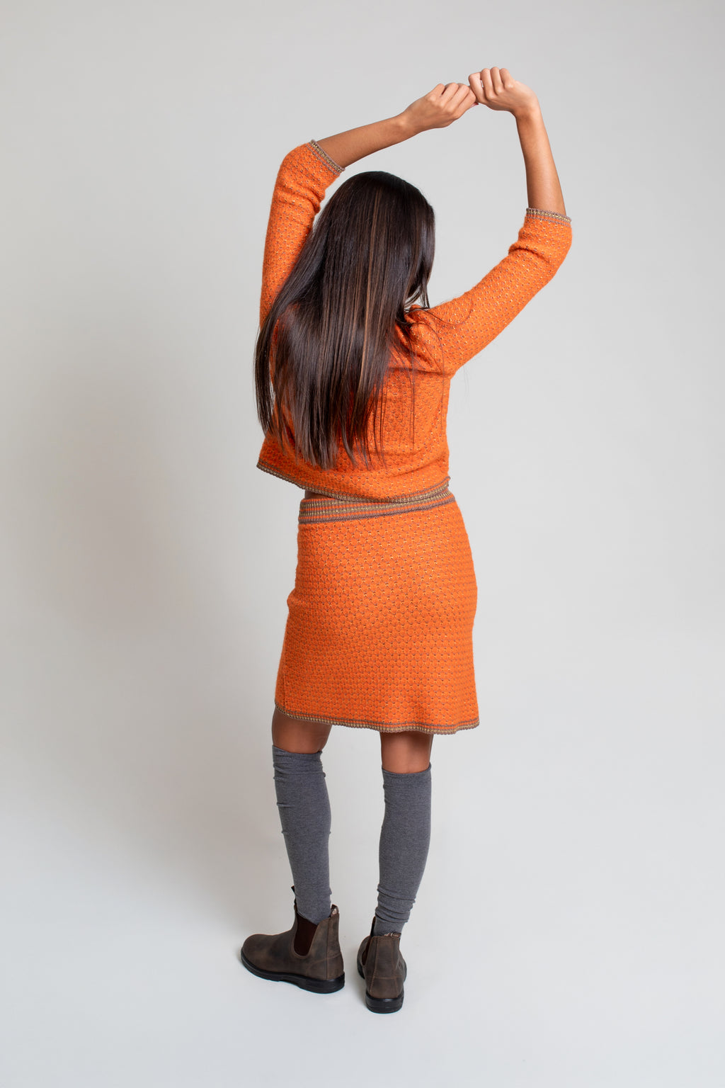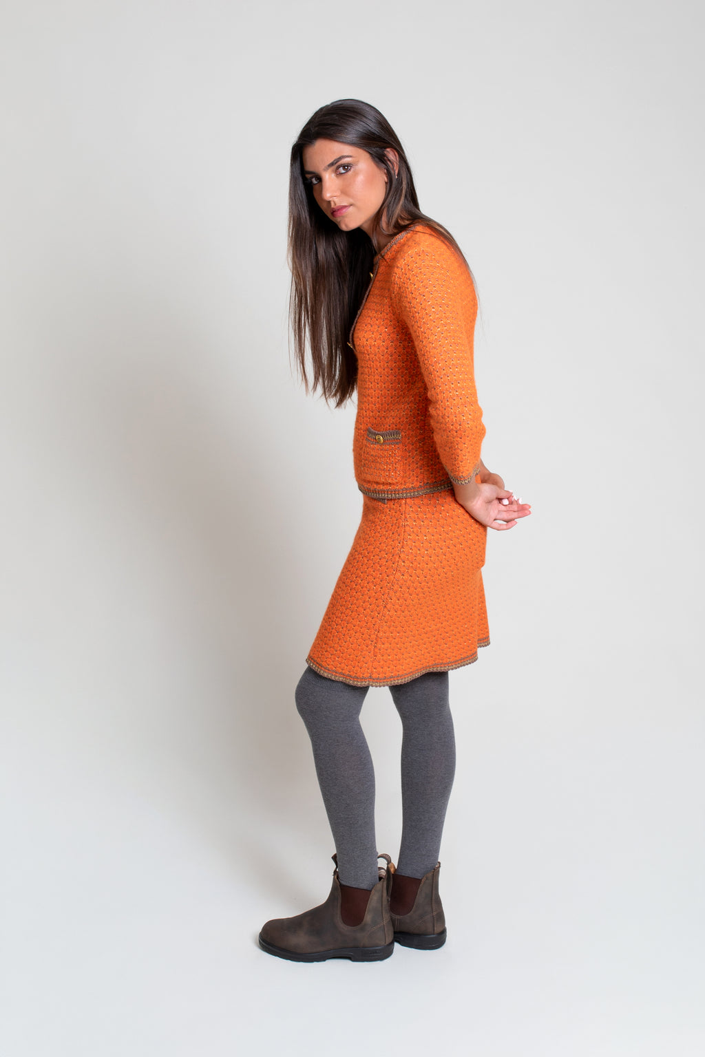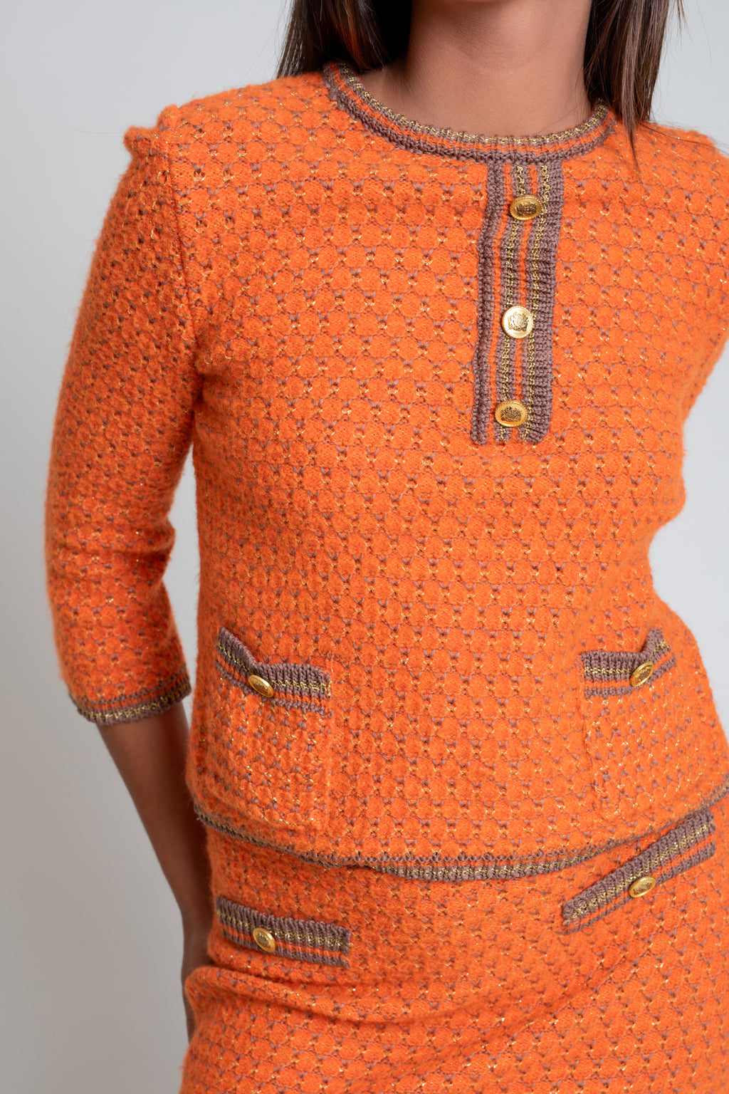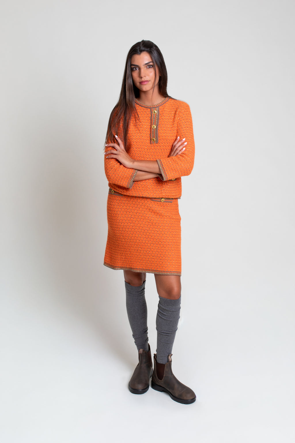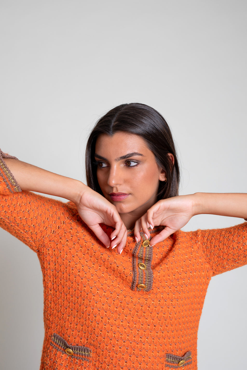 Jersey de punto tricot tipo tweed en color naranja con cuello caja. Modelo de corte recto con manga 3/4, bolsillos y tapeta de adorno en delantero