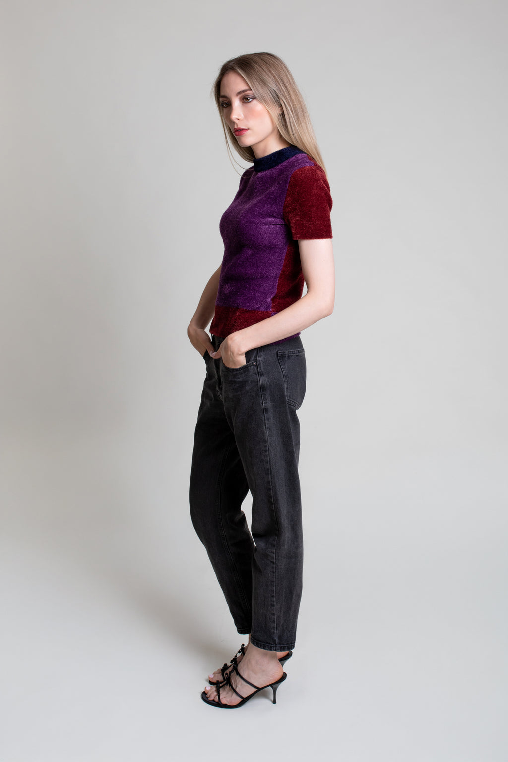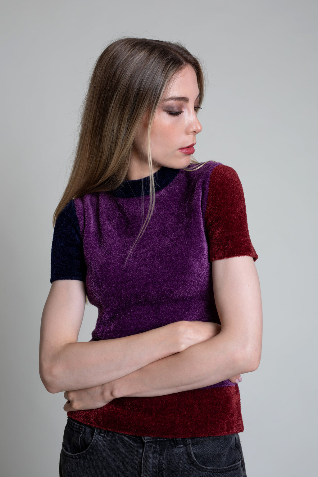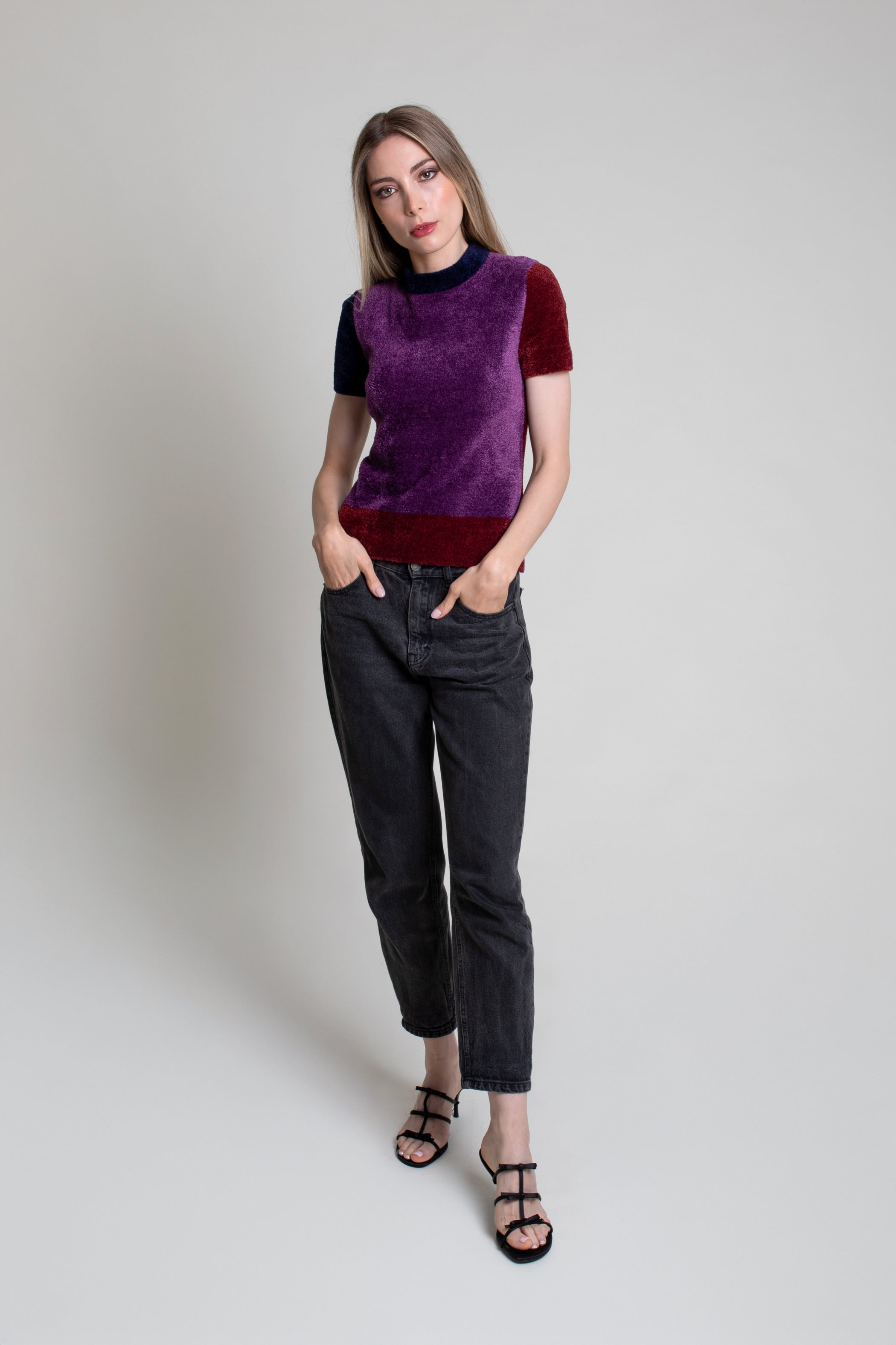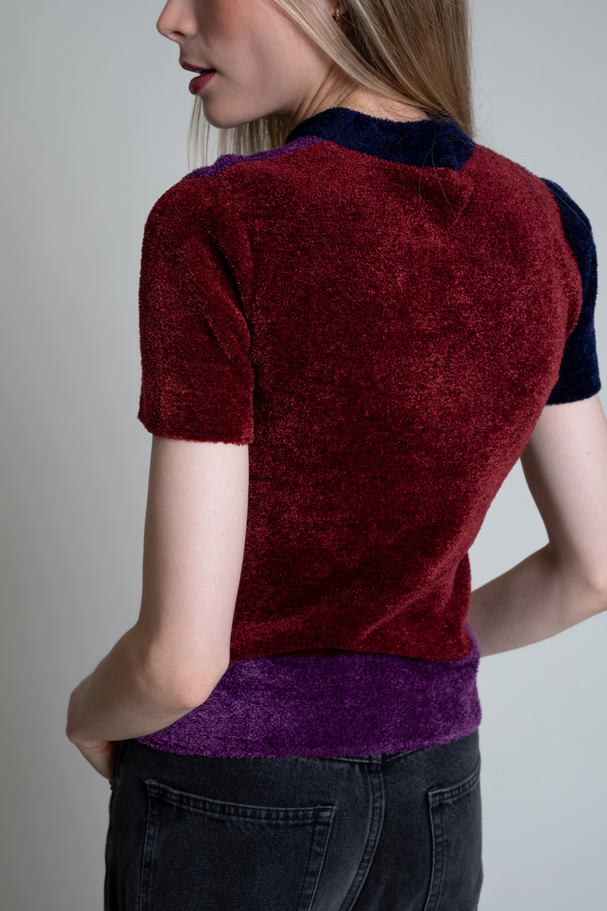 Jersey de punto tricot con bloques de color en textura suave tipo terciopelo. Modelo de corte ajustado con cuello perkins y manga corta