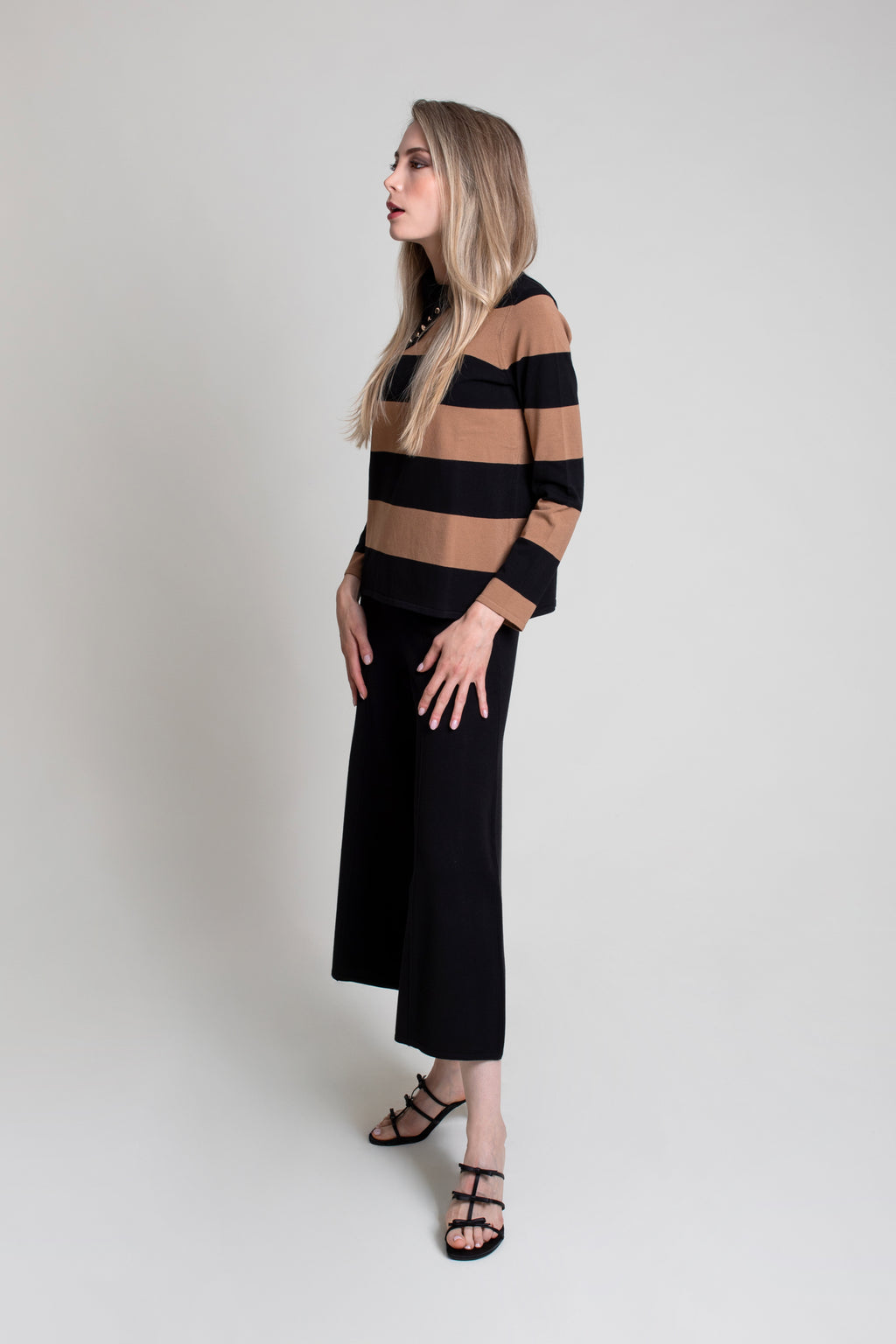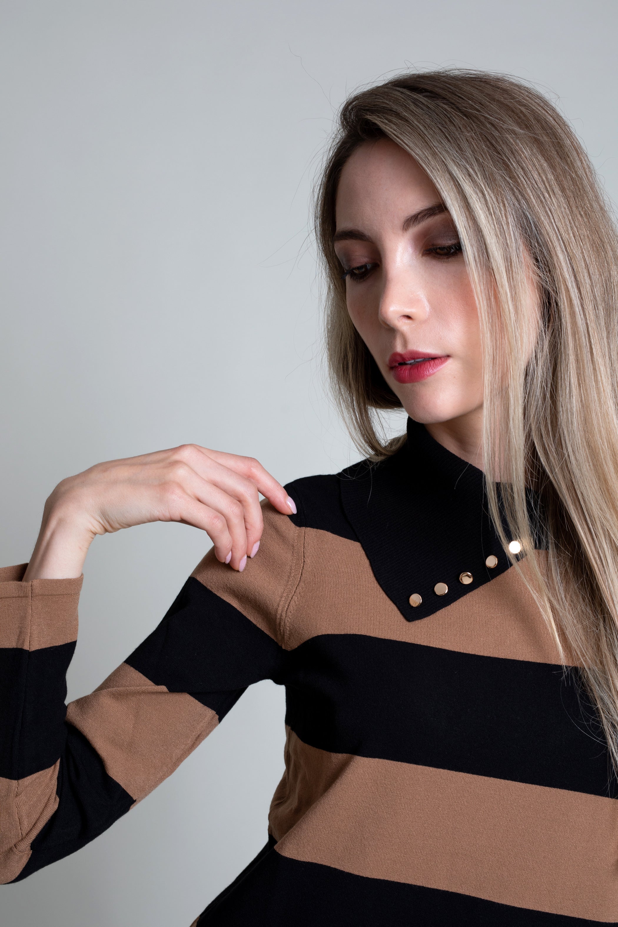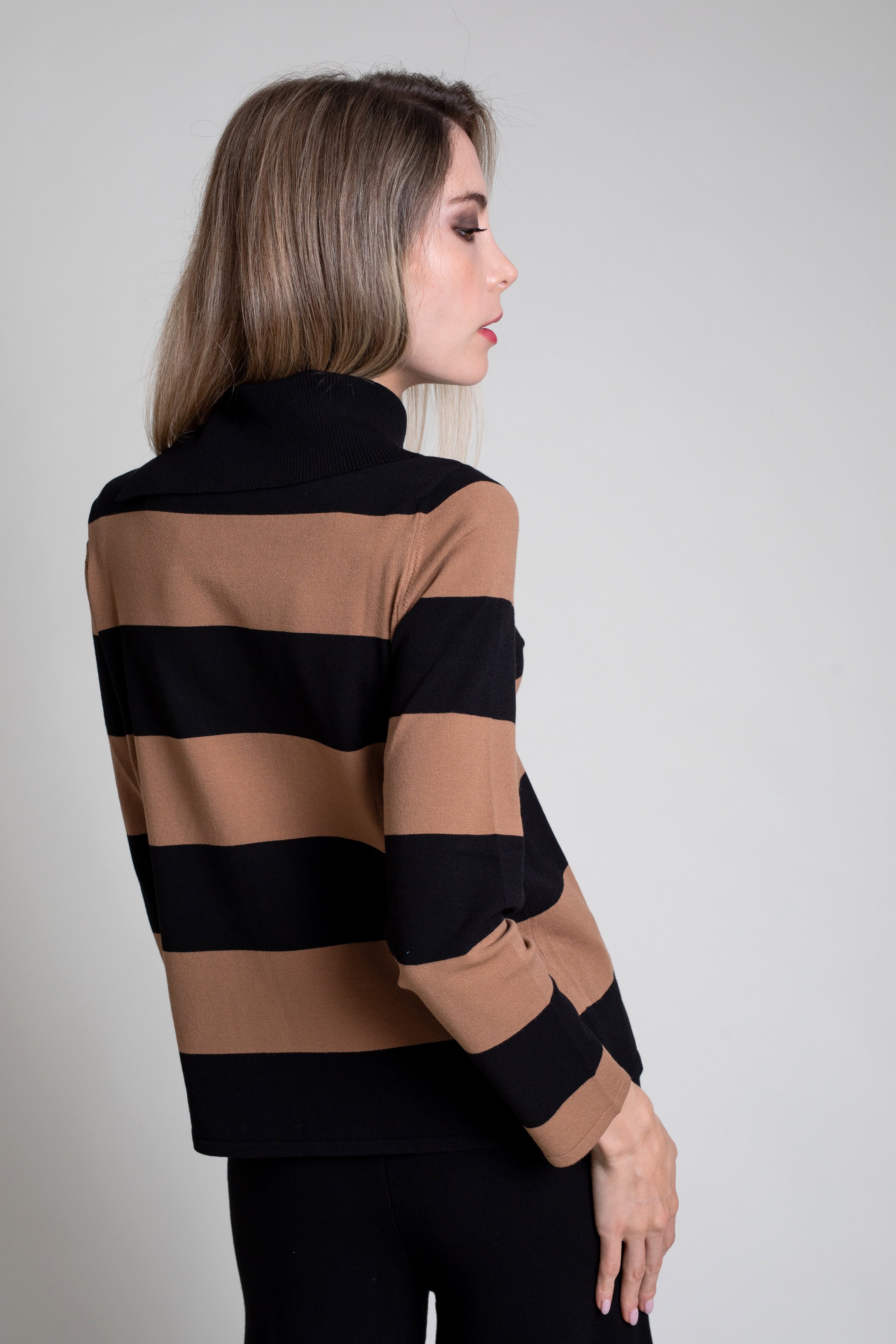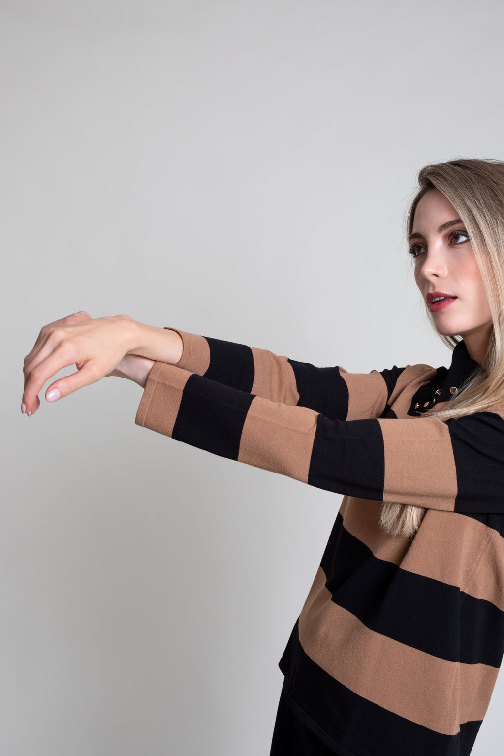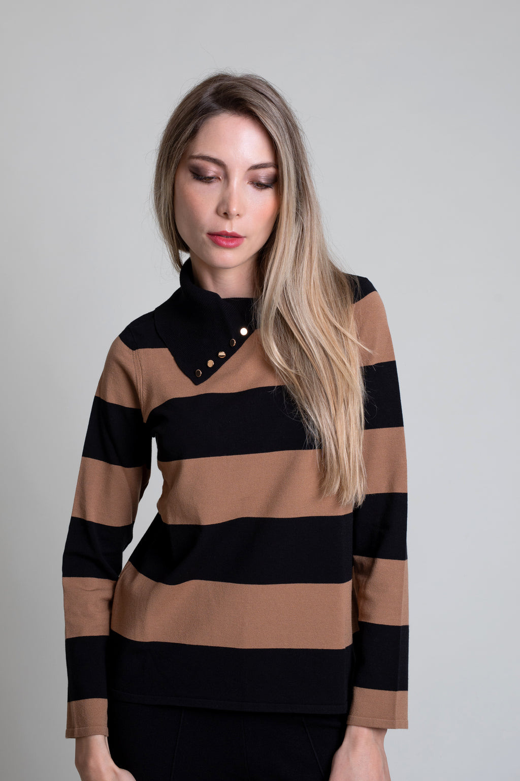 Jersey de punto tricot con rayas anchas bicolor. Modelo de corte recto con manga larga y falso cuello vuelto con adorno de botones metálicos.