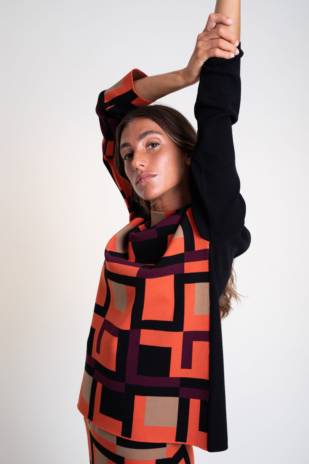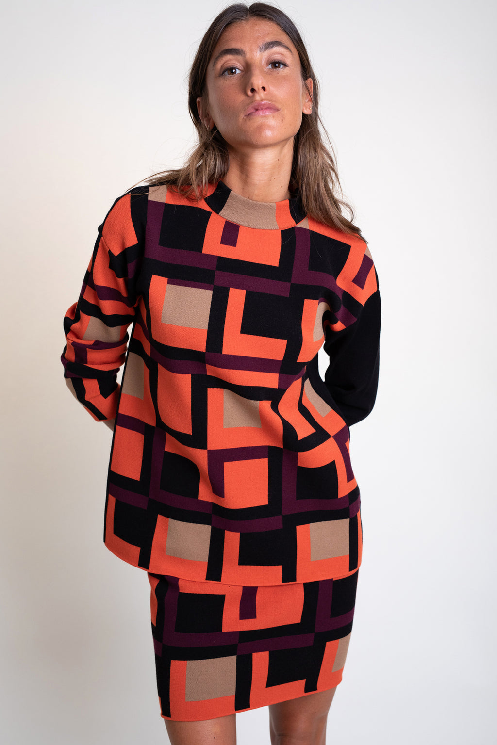Jersey de punto tricot en jacquard de colores con espalda y manga lisa. Modelo de corte ligeramente oversize con cuello perkins y manda caída