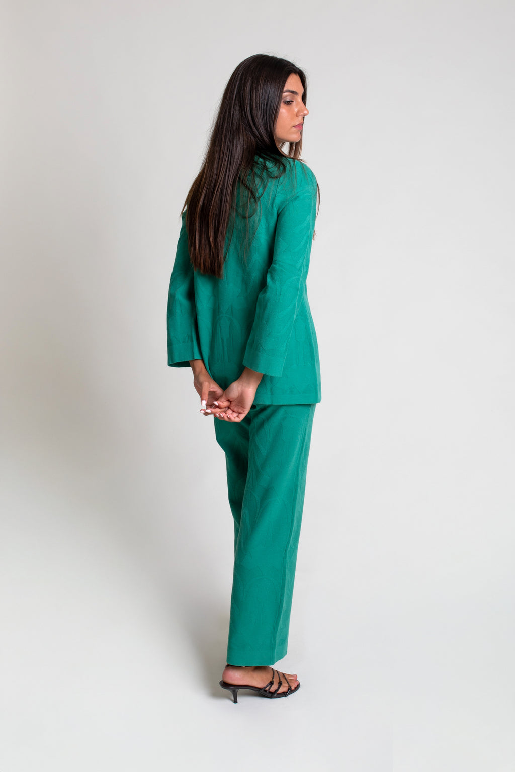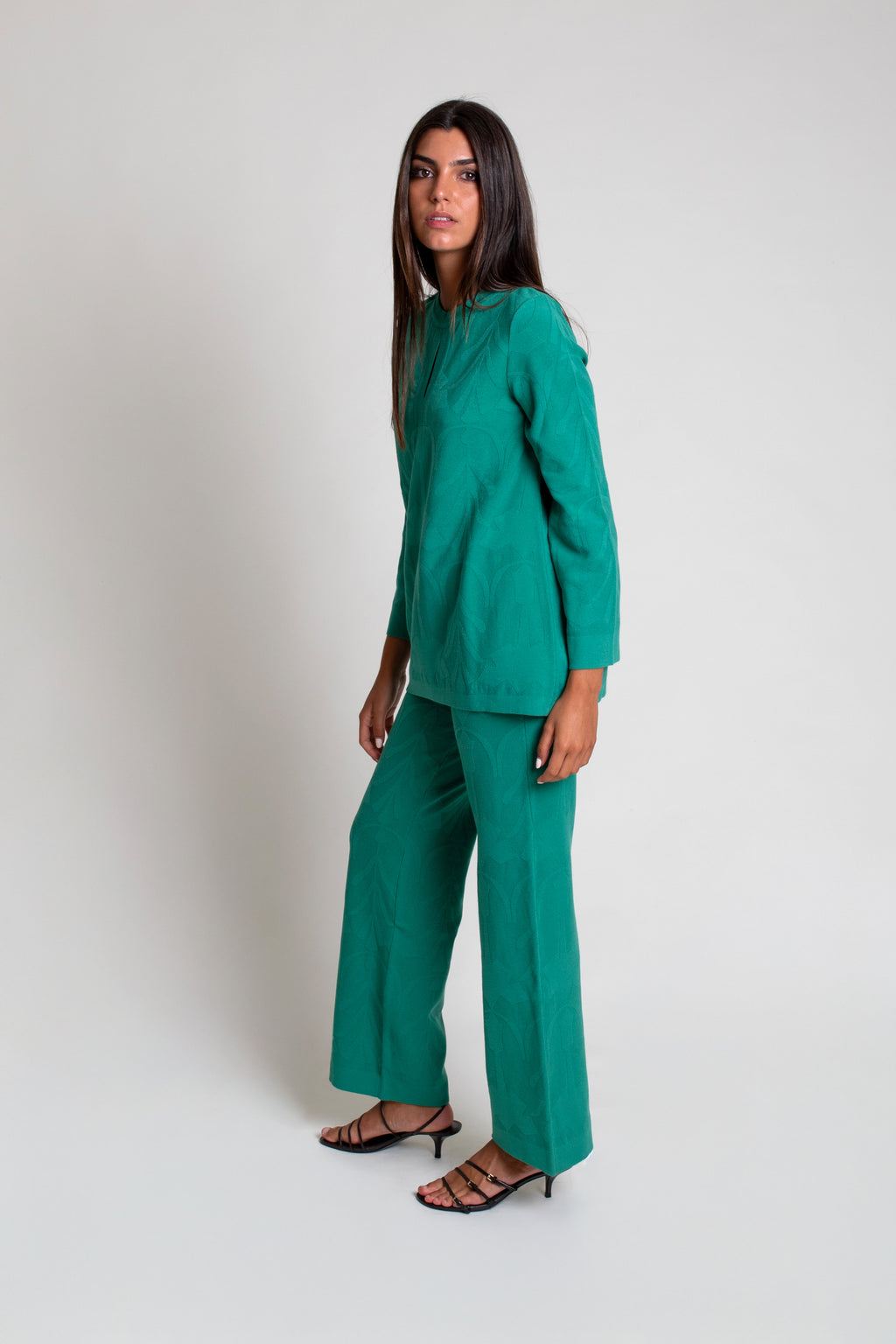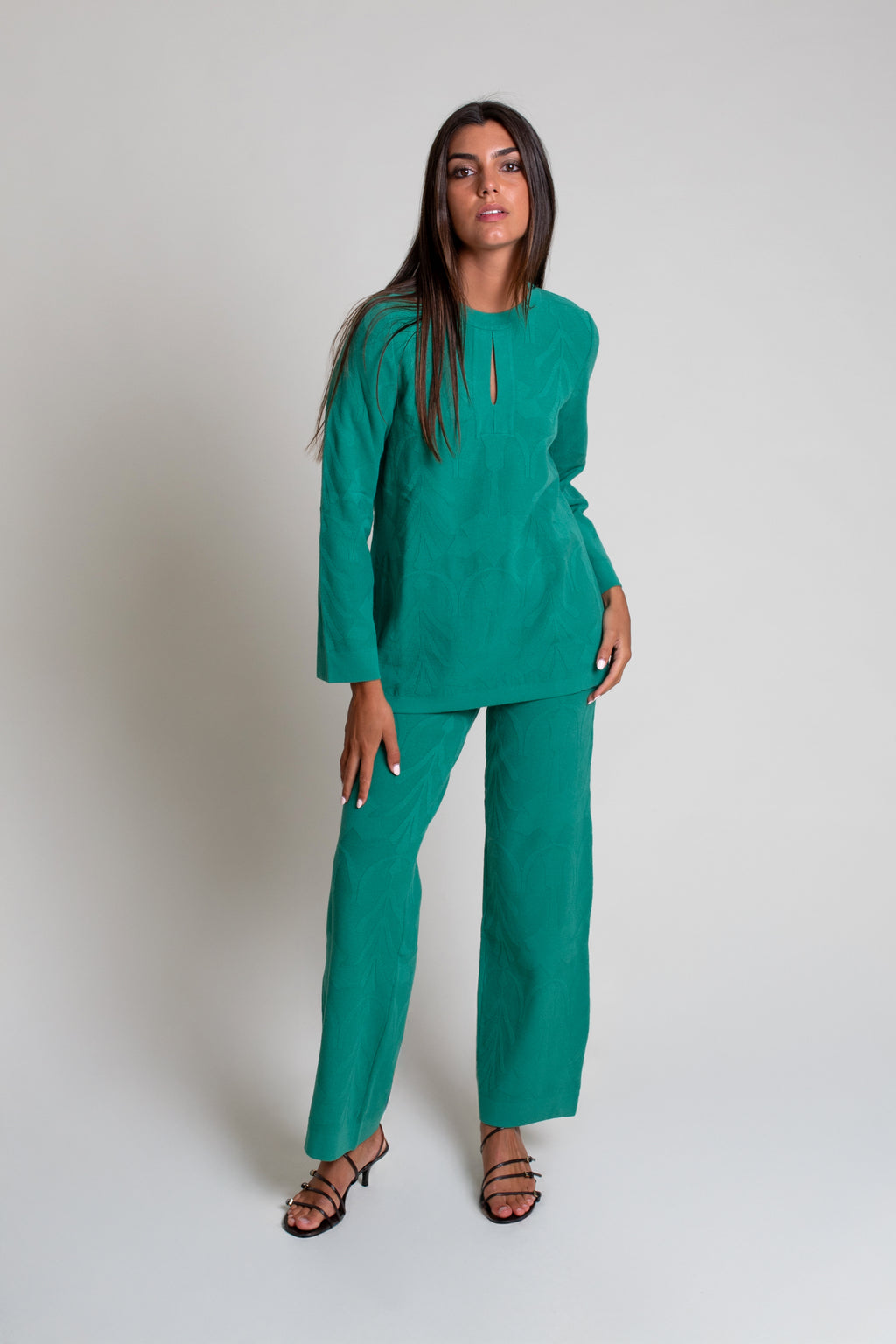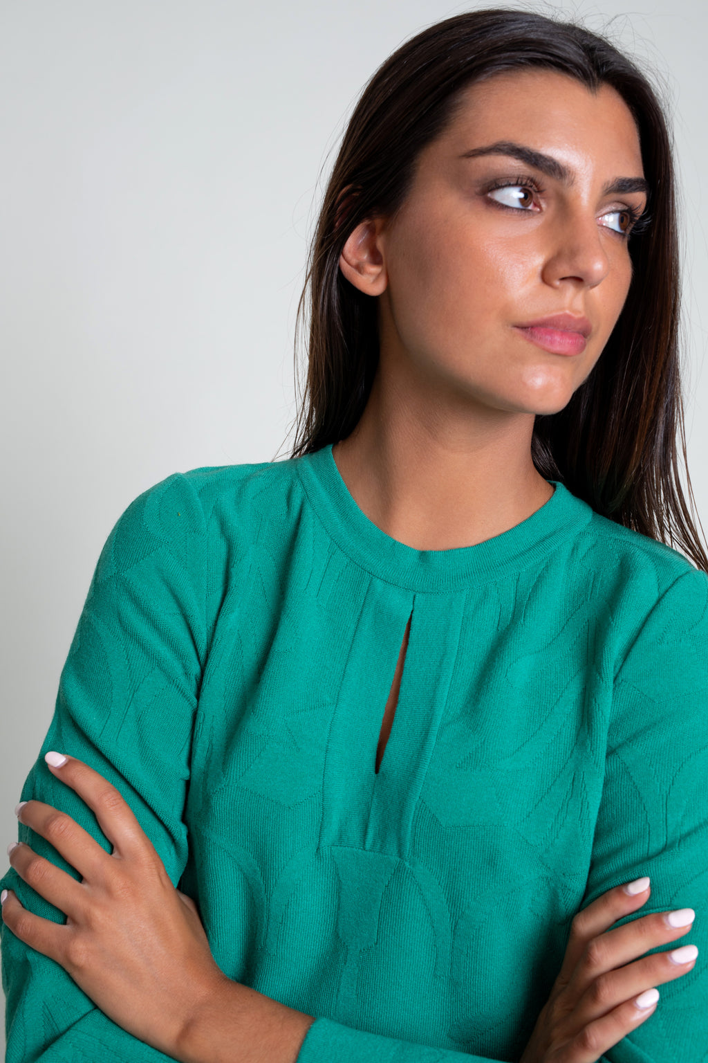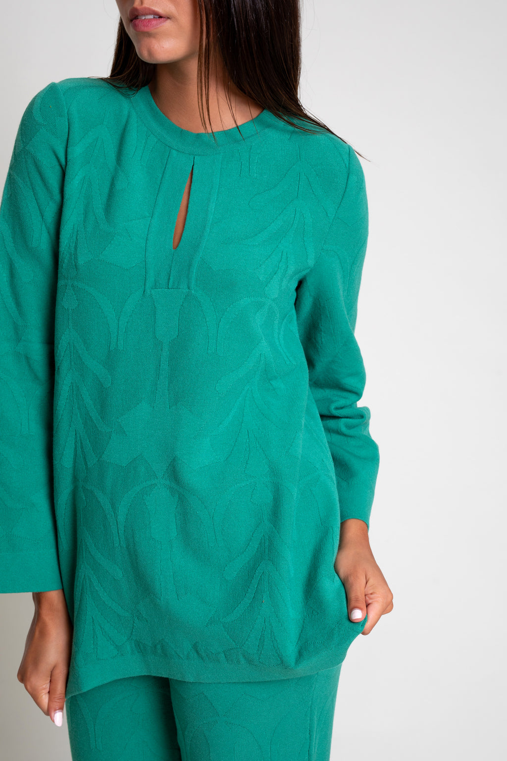 Jersey de punto tricot con textura efecto brocado. Modelo de corte recto con cuello caja y abertura en escote.