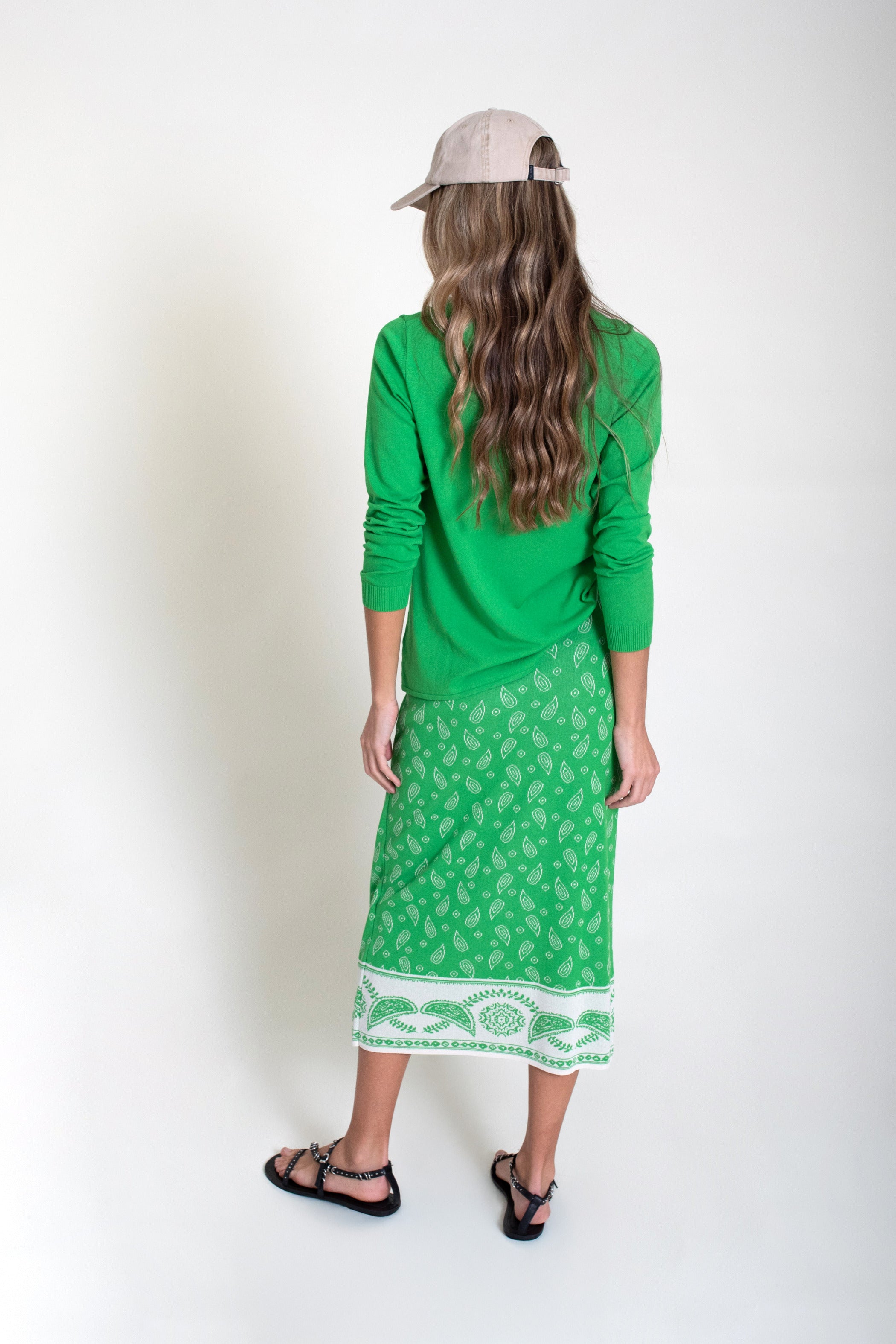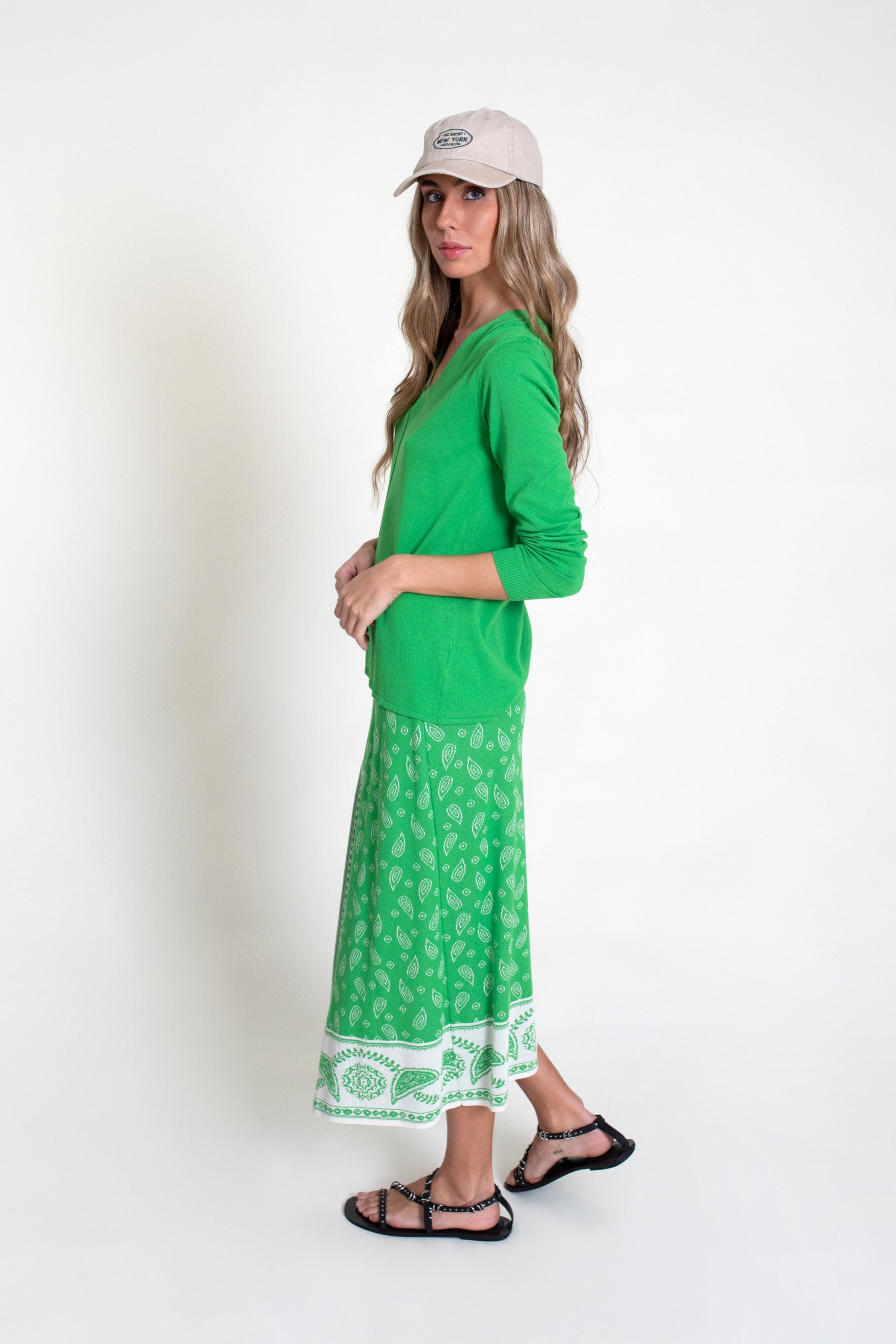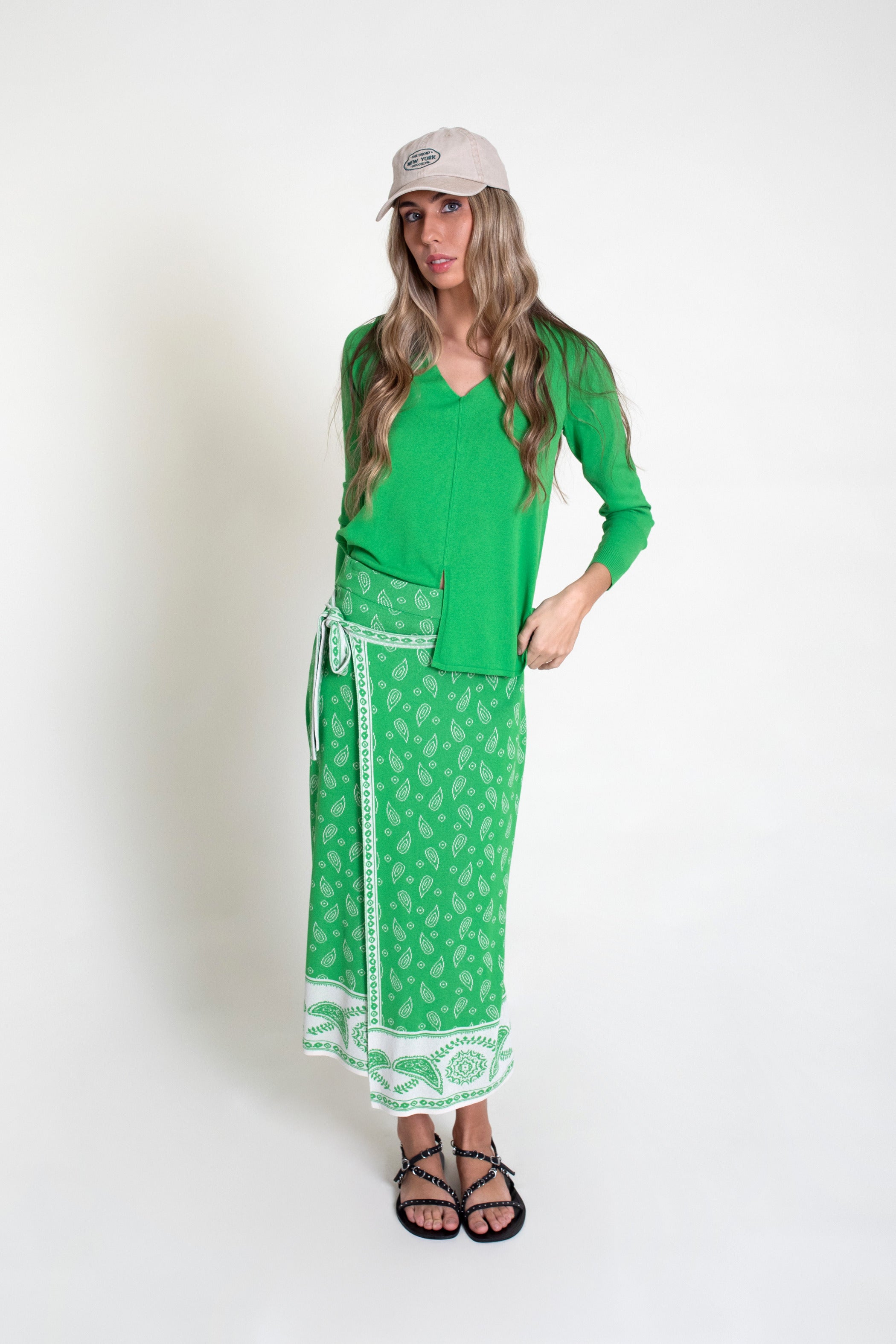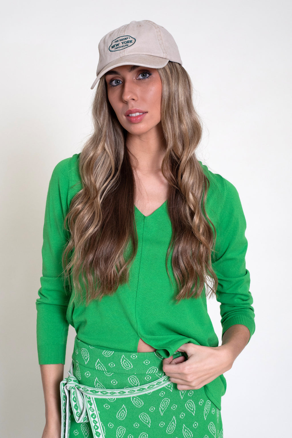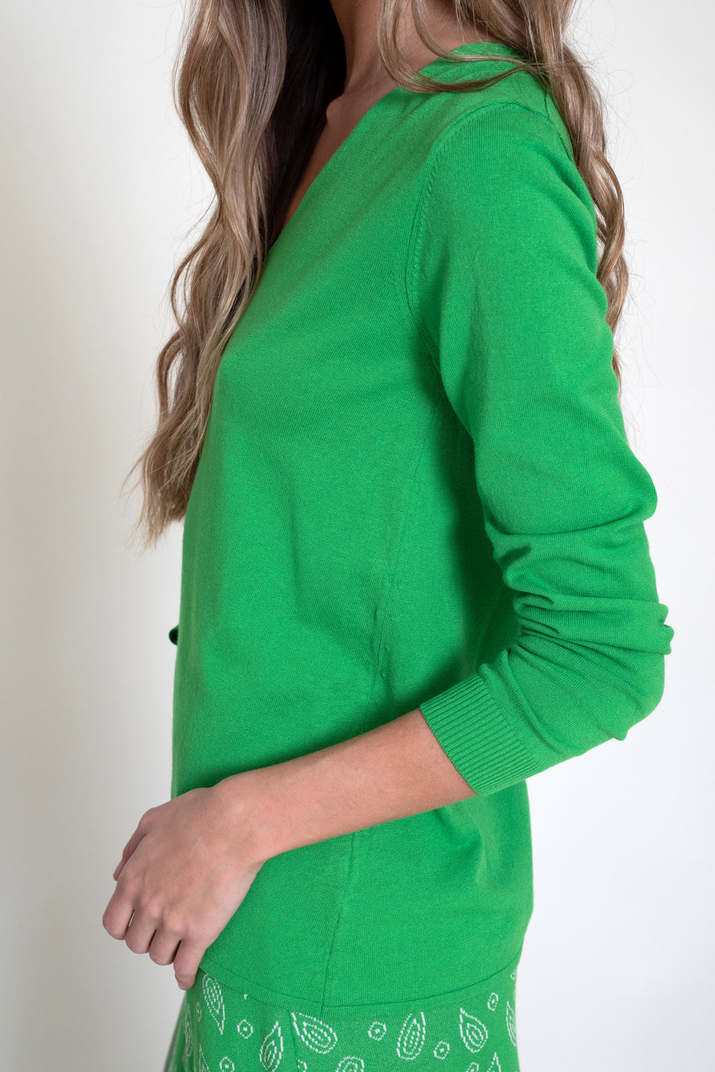 Jersey de punto tricot con escote pico y corte central con abertura. Modelo ligeramente evasé