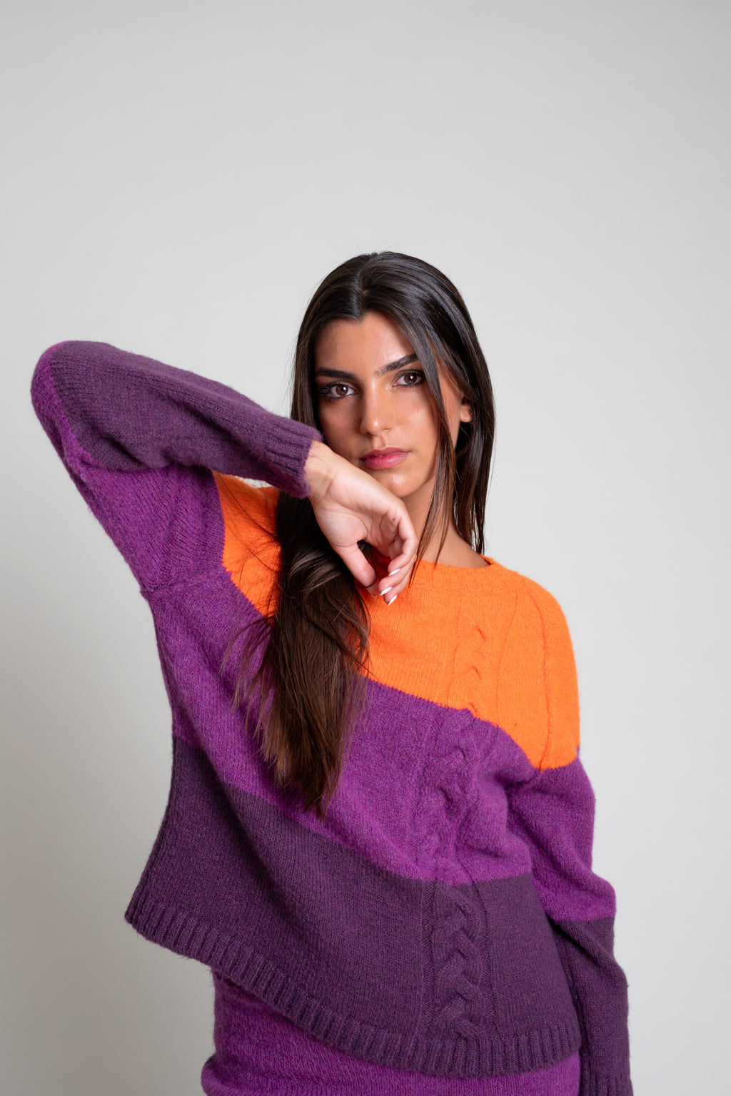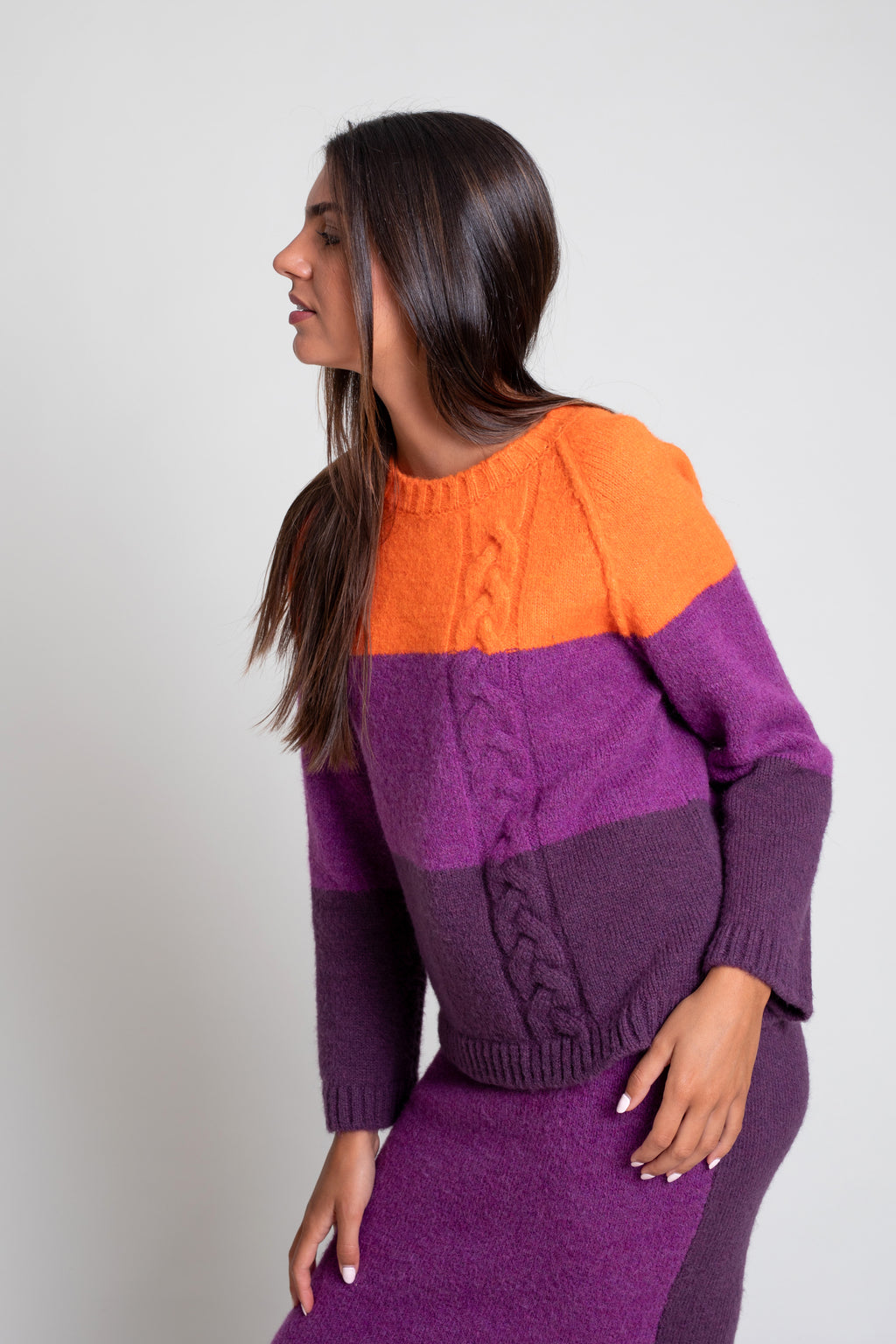 Jersey de puntro tricot con bloques de color y detalle de ocho en delantero. Modelo de corte recto, cuello caja y manga ranglan larga