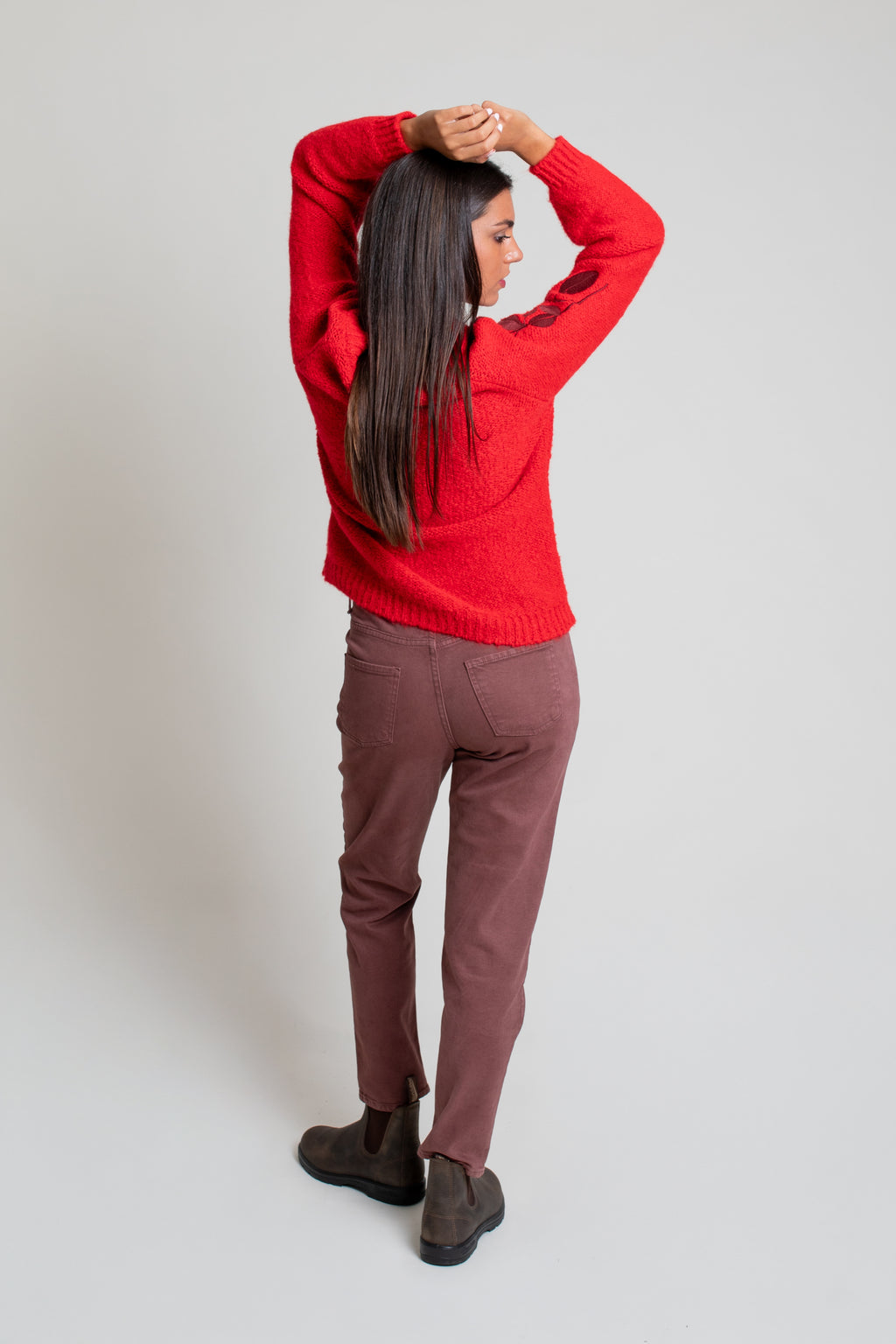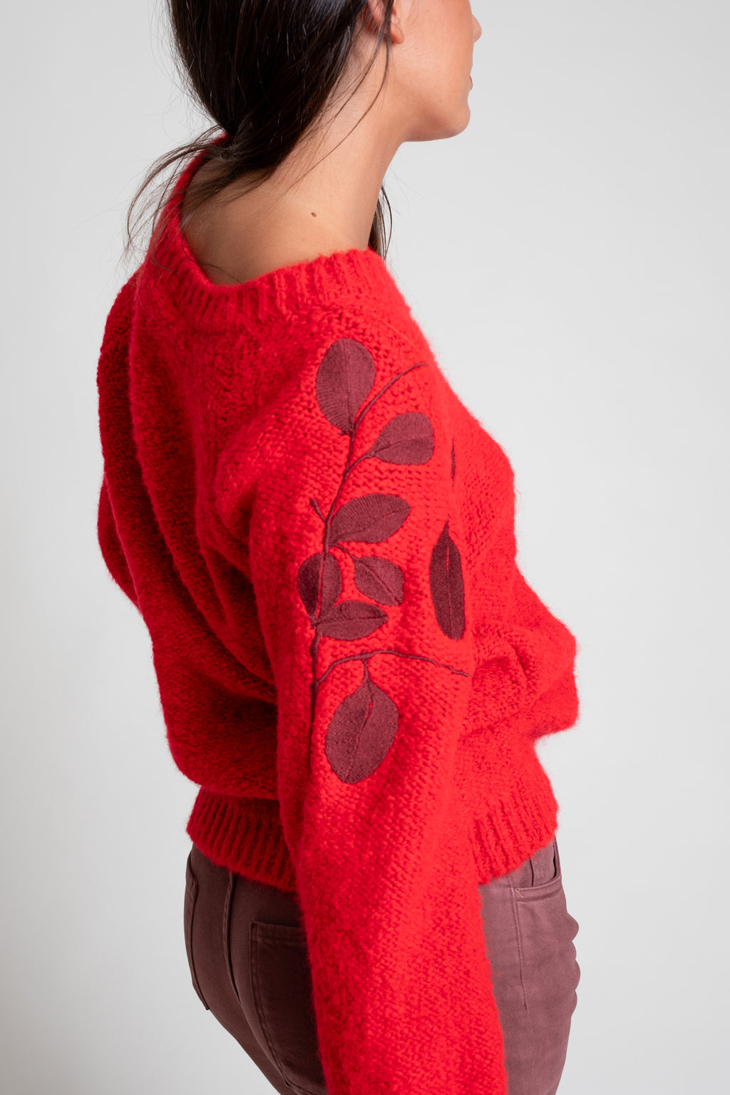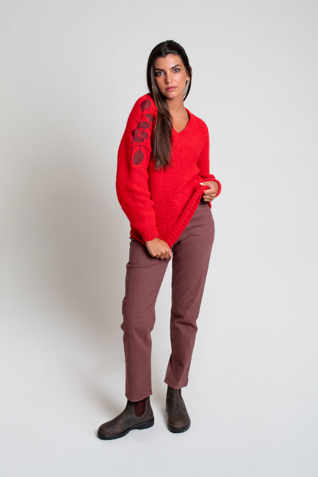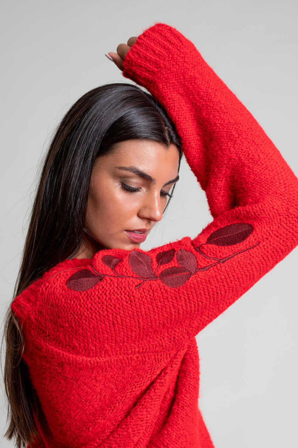 Jersey de punto grueso con manga ranglan larga bordada y cuello pico