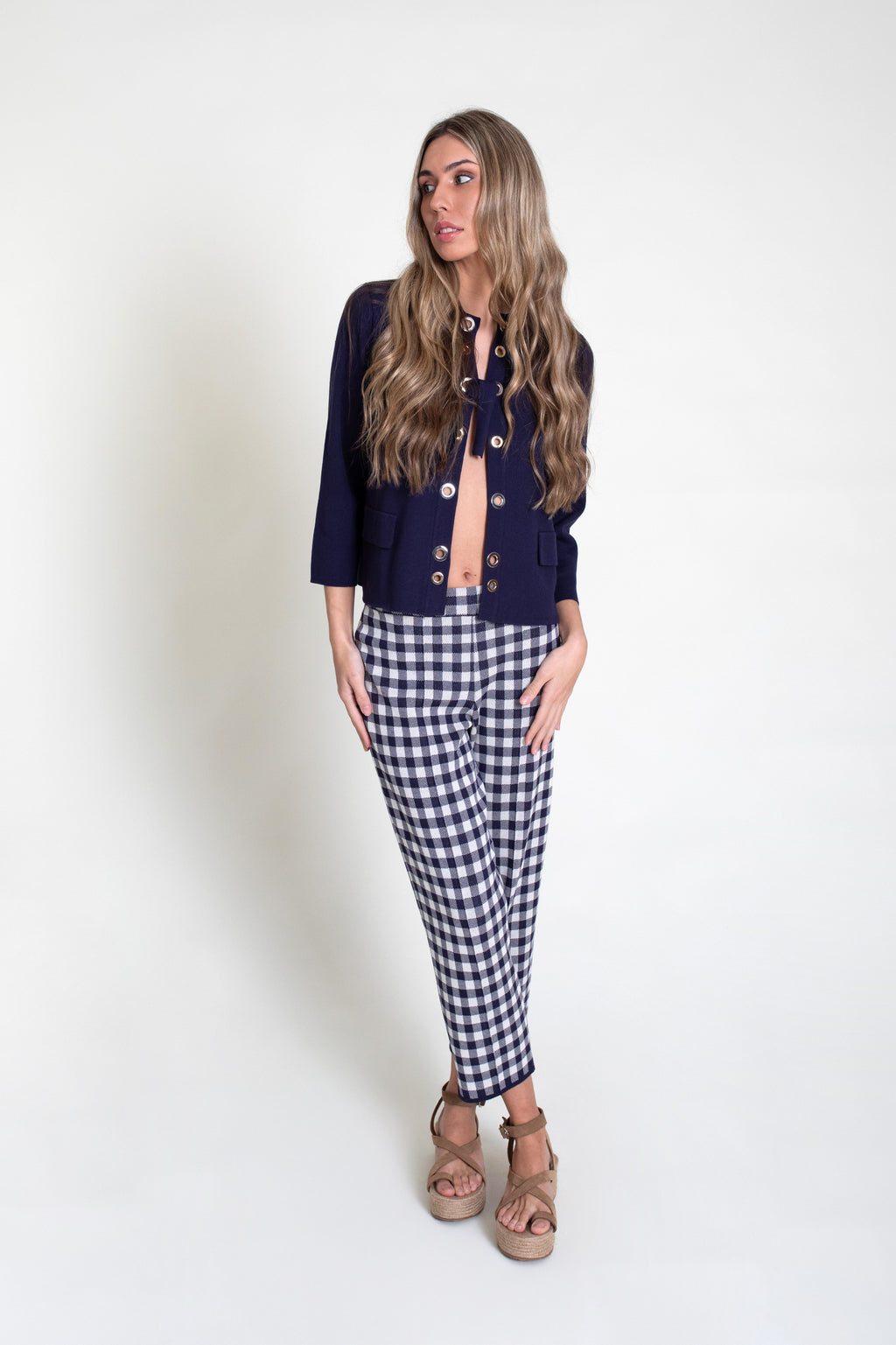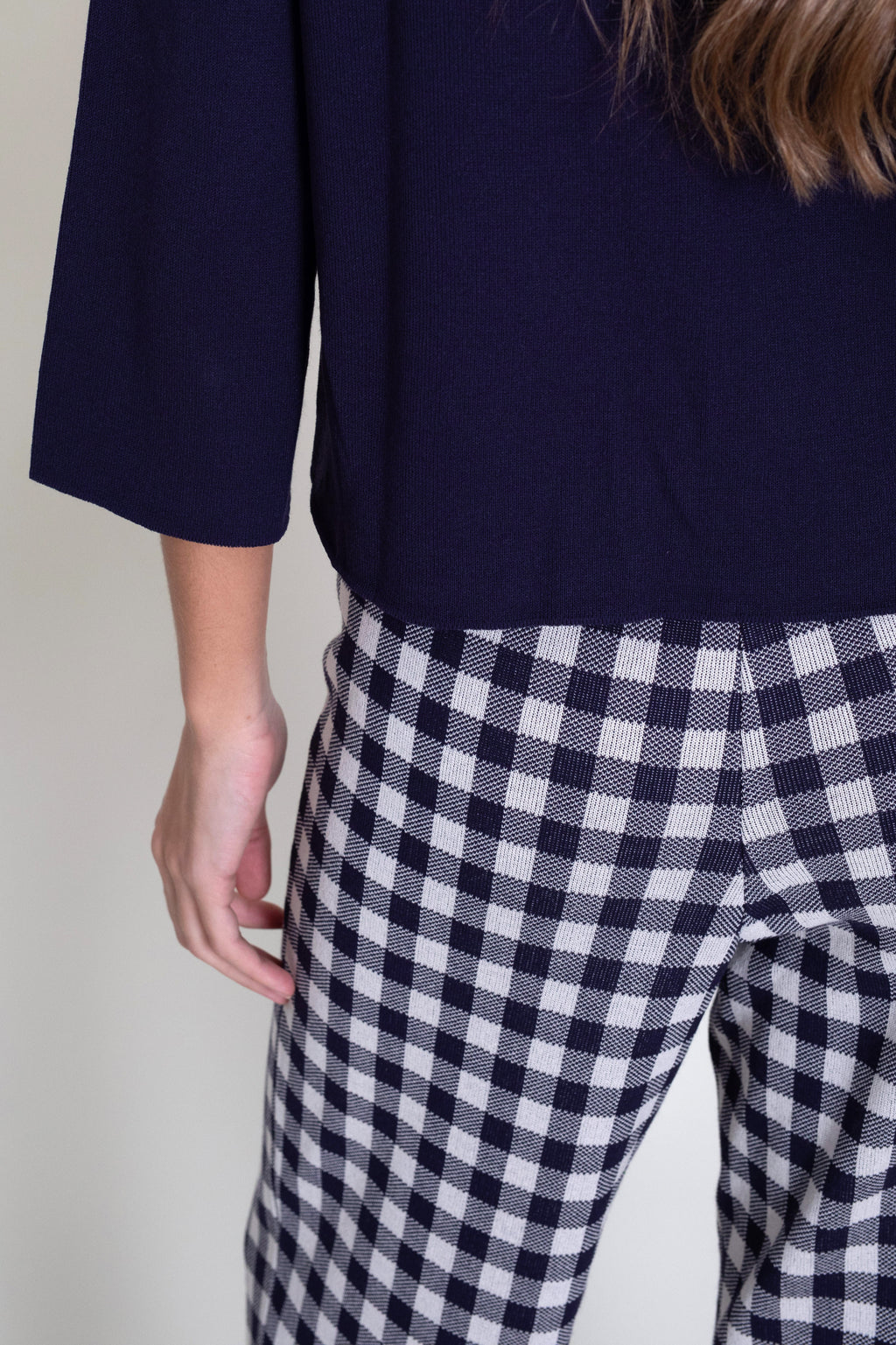 Pantalón de punto tricot en vichy. Modelo estilo capri con pespunte central y cintura con goma