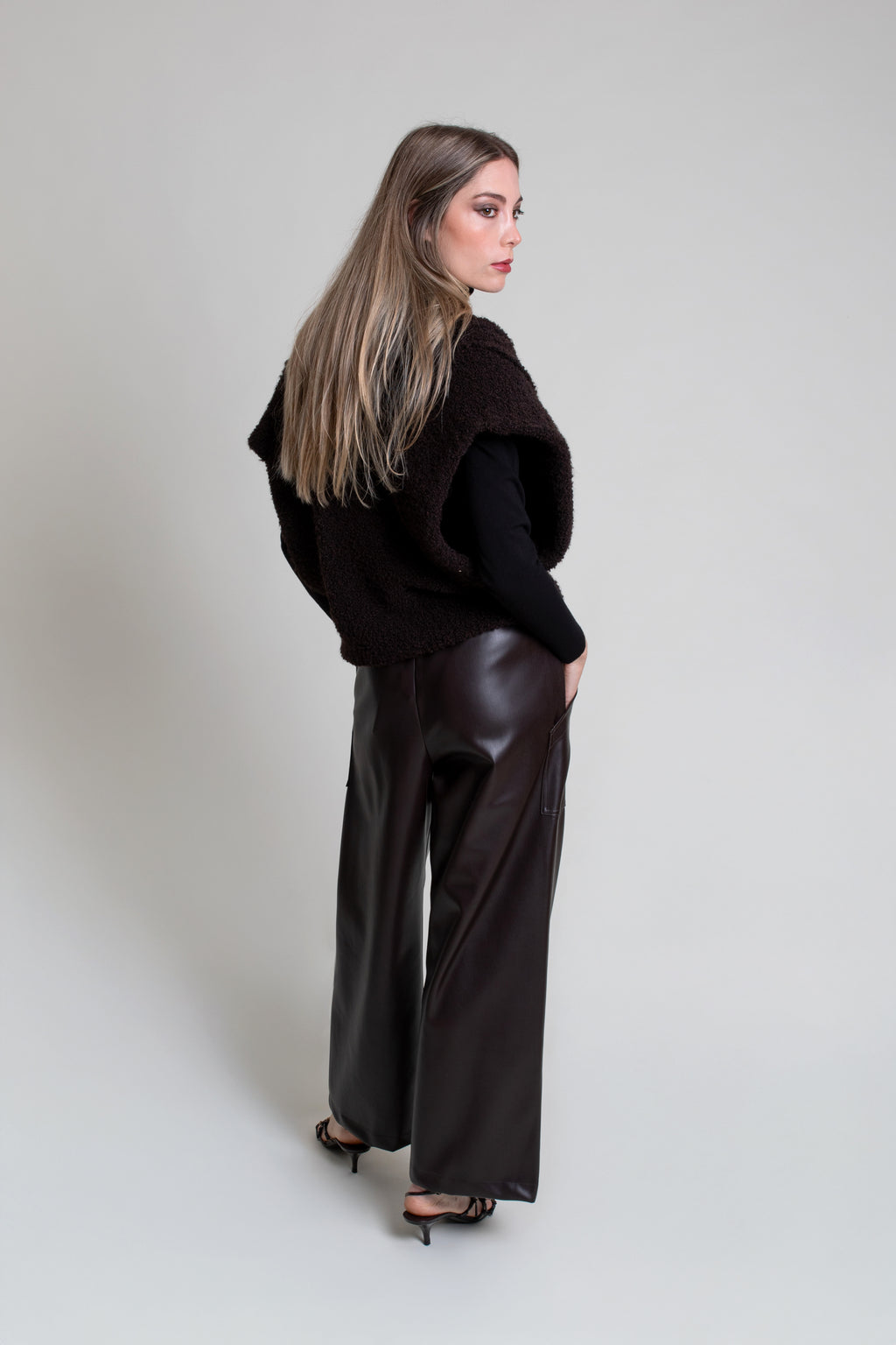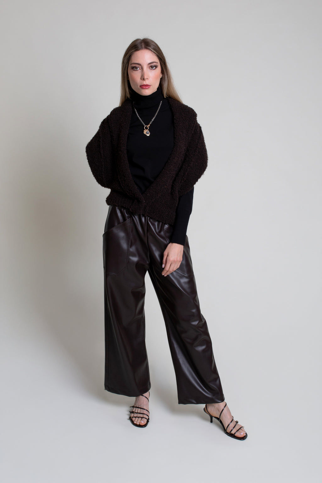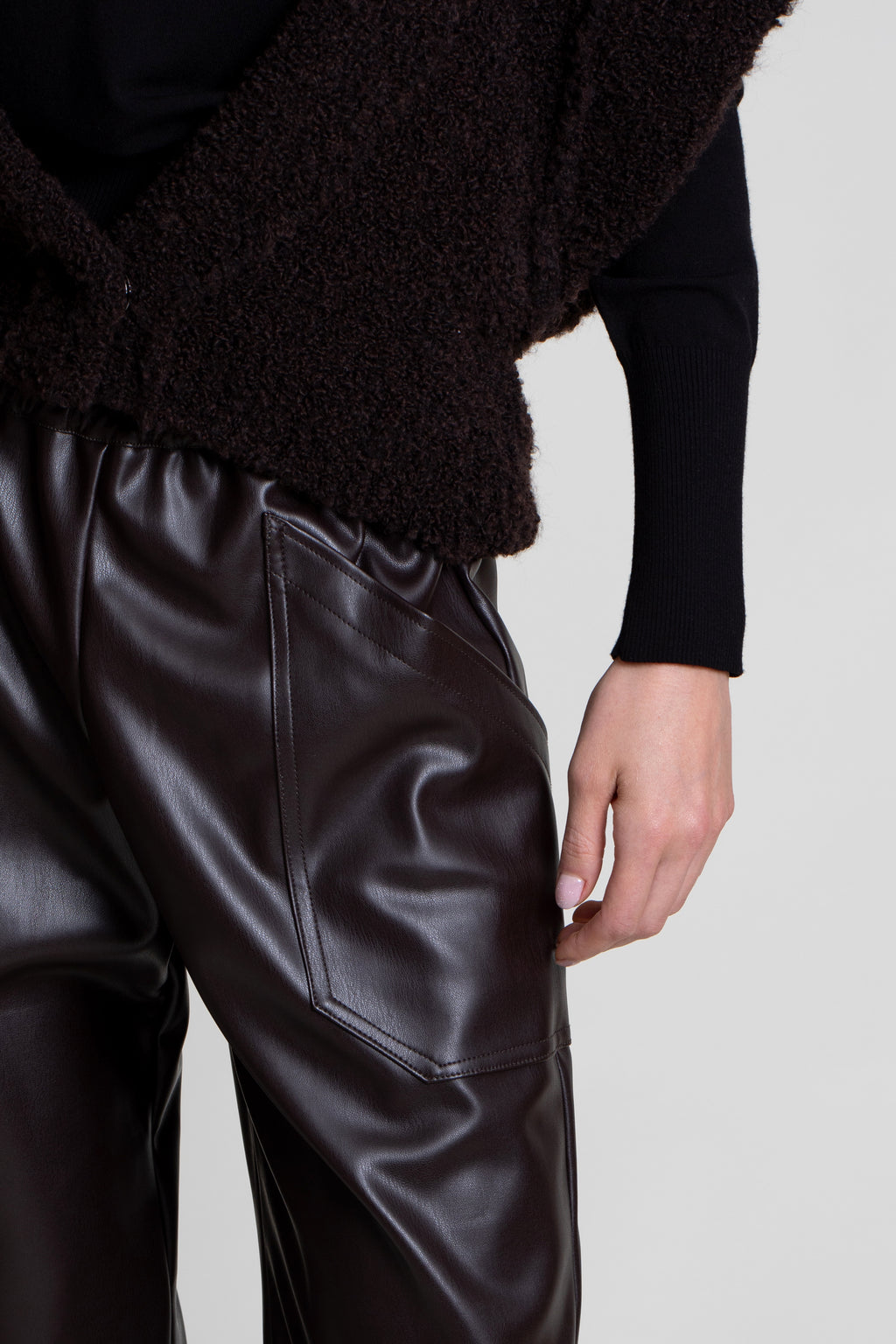Pantalón  marrón en tejido efecto cuero. Modelo de corte recto con bolsillos de plastrón en delantero y cintura con goma