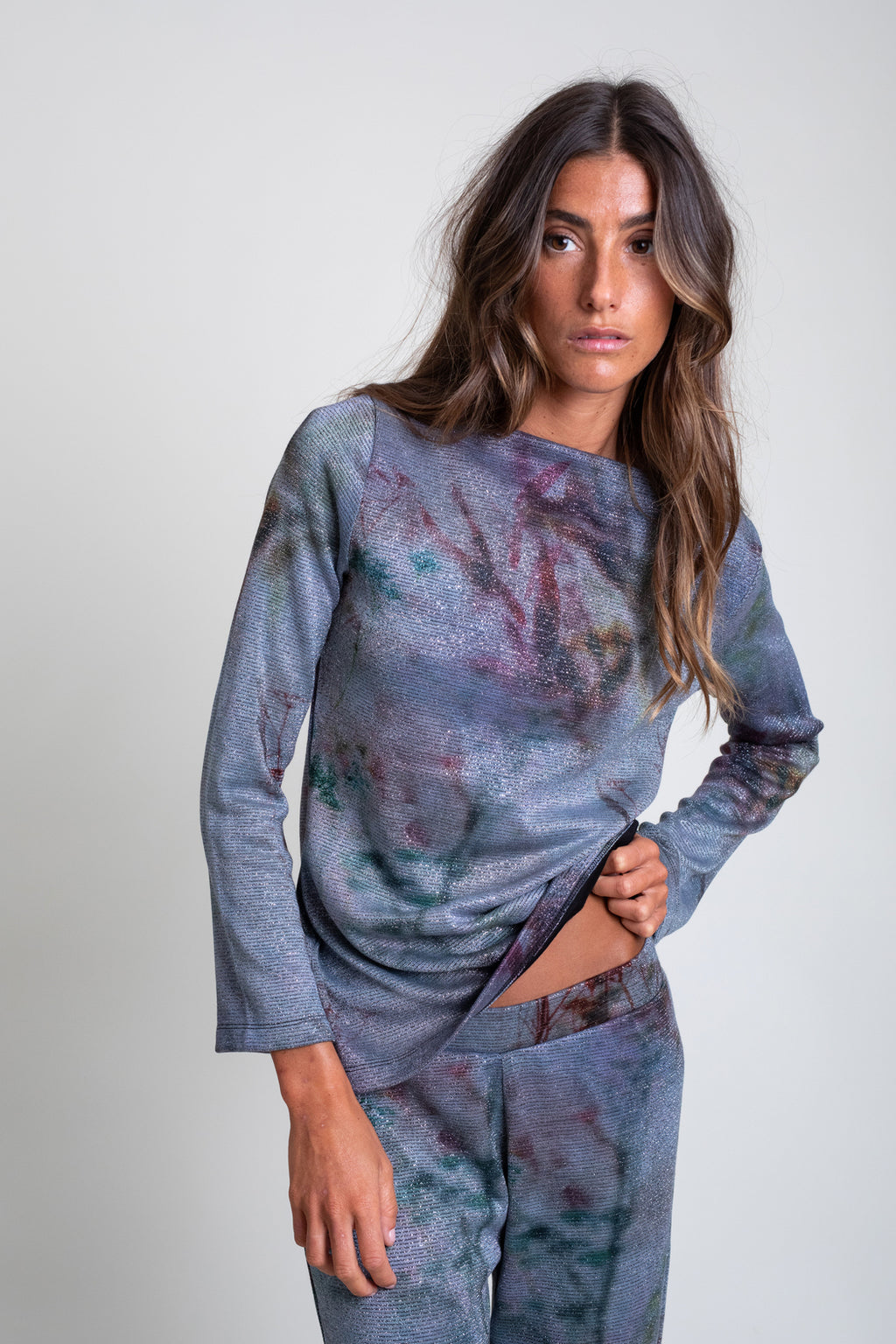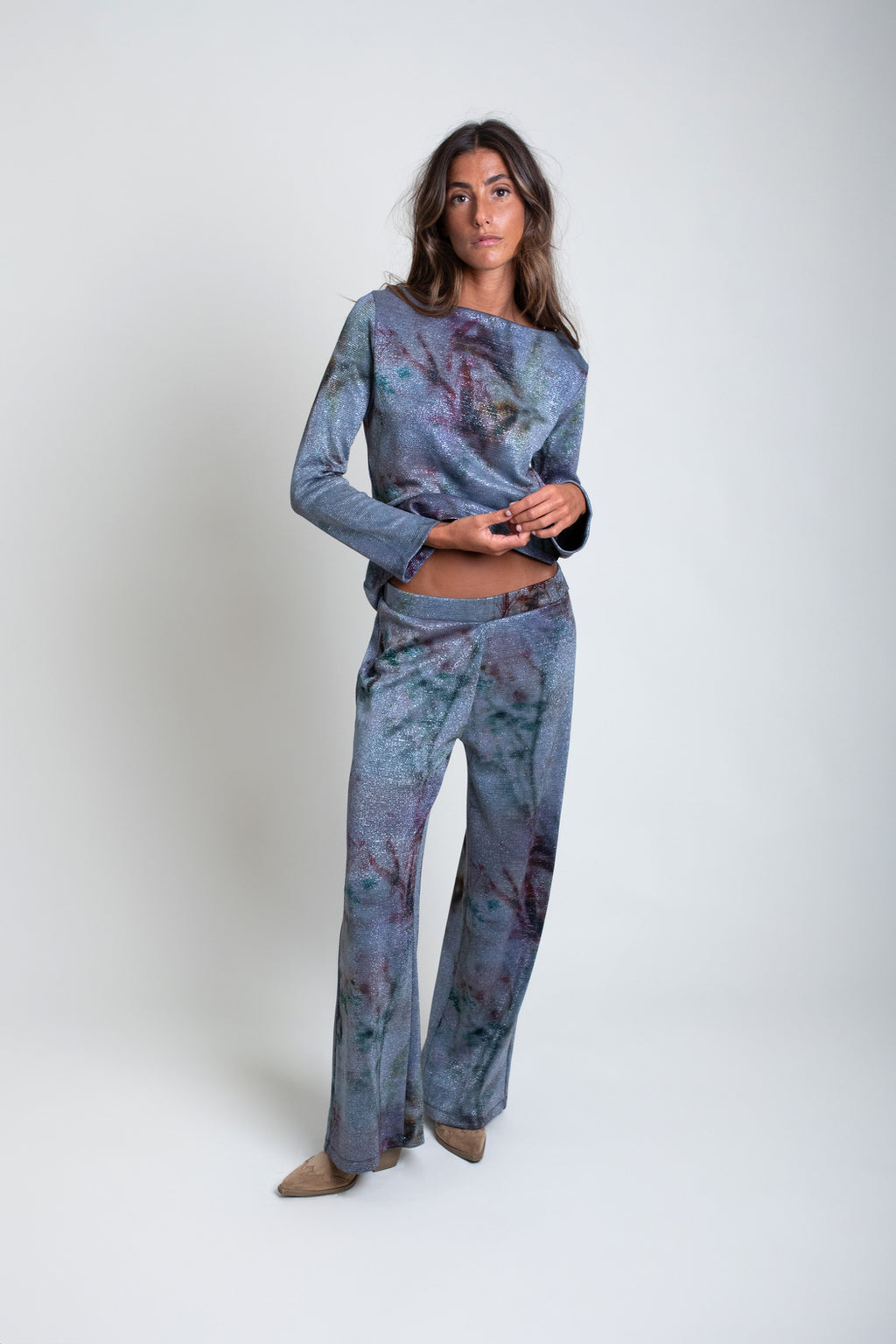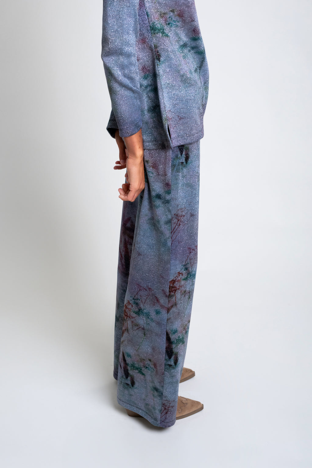 Pantalón estampado en tejido elástico de brillo. Modelo de corte recto con cintura con goma