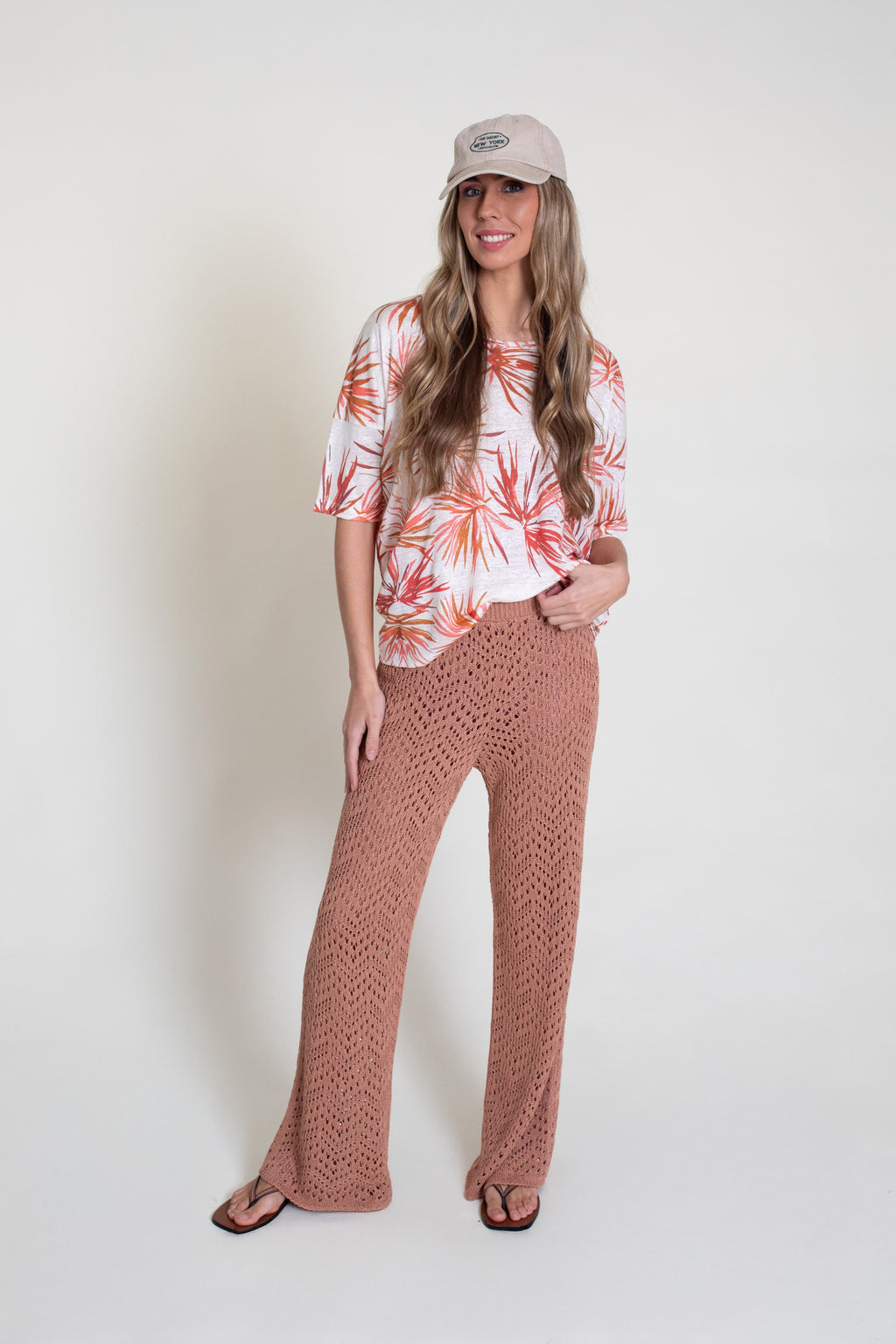 Pantalón de punto tricot con calados tipo ganchillo. Modelo de corte recto y cintura con goma
