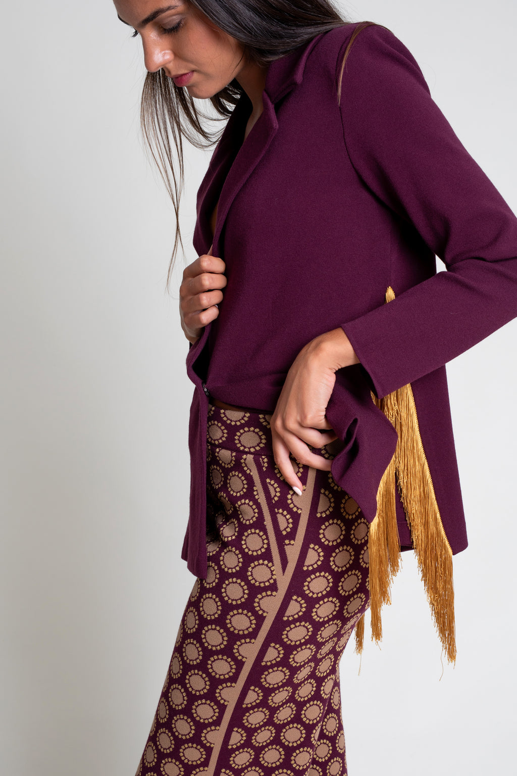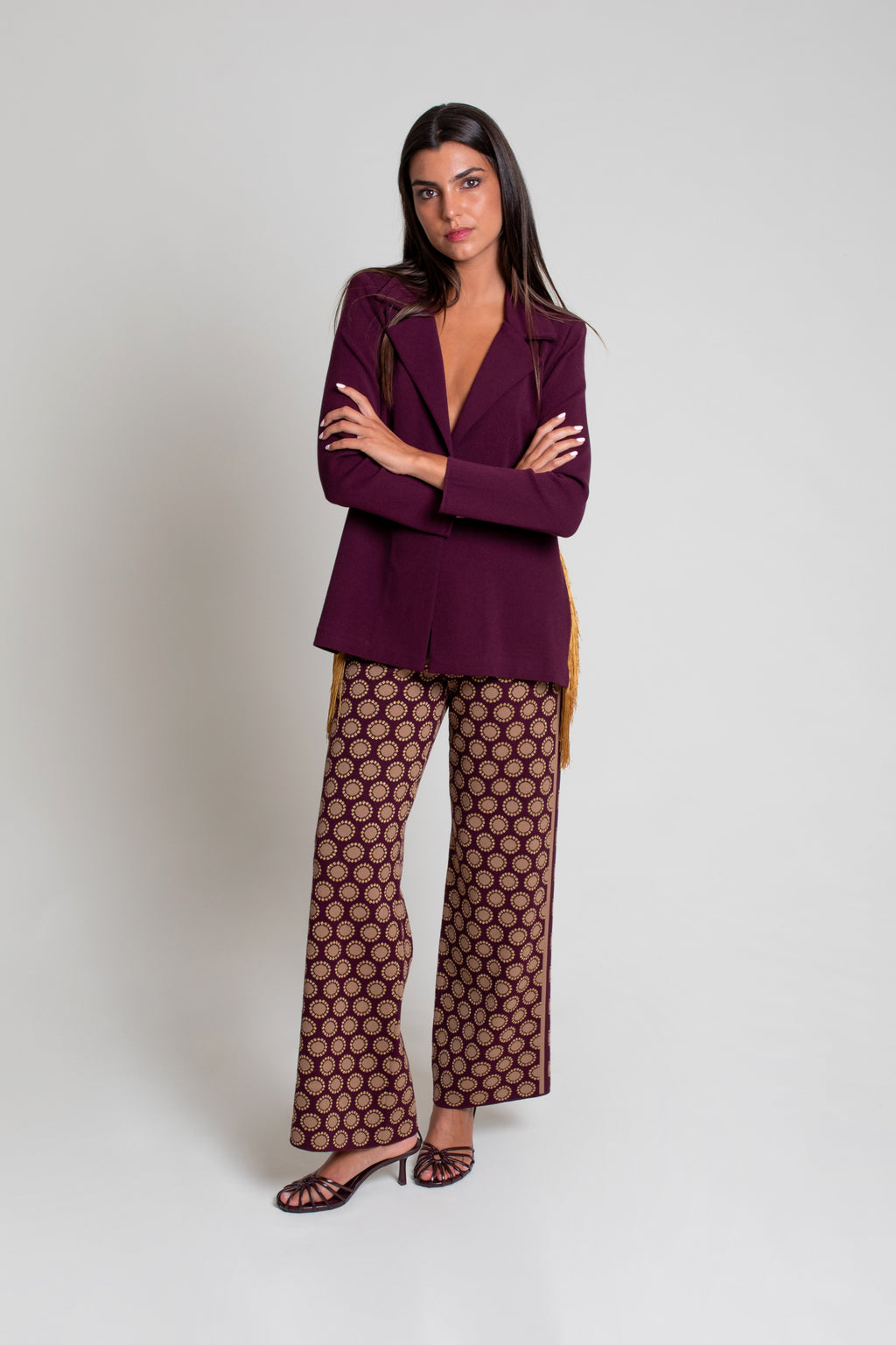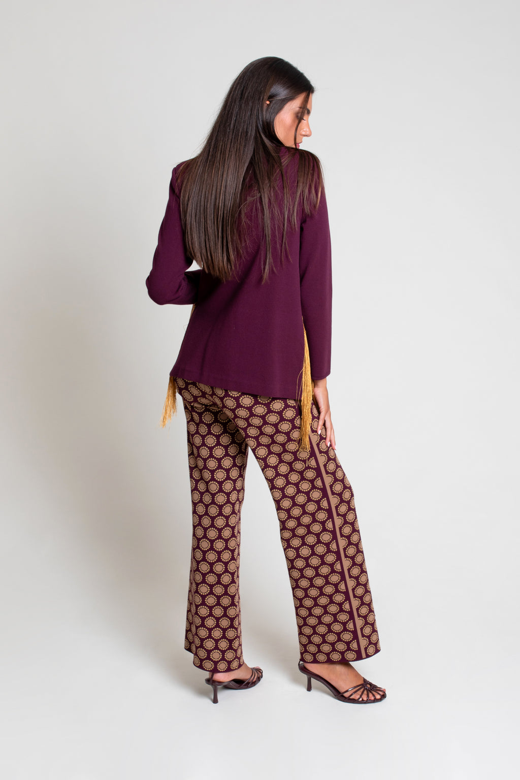 Pantalón recto en jacquard de color con ligero brillo. Contrastes laterales y de falso bolsillo en delantero. Cintura con goma