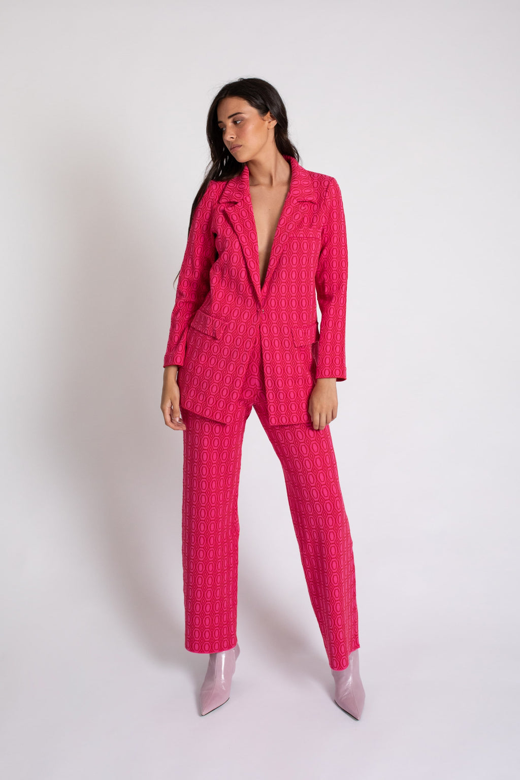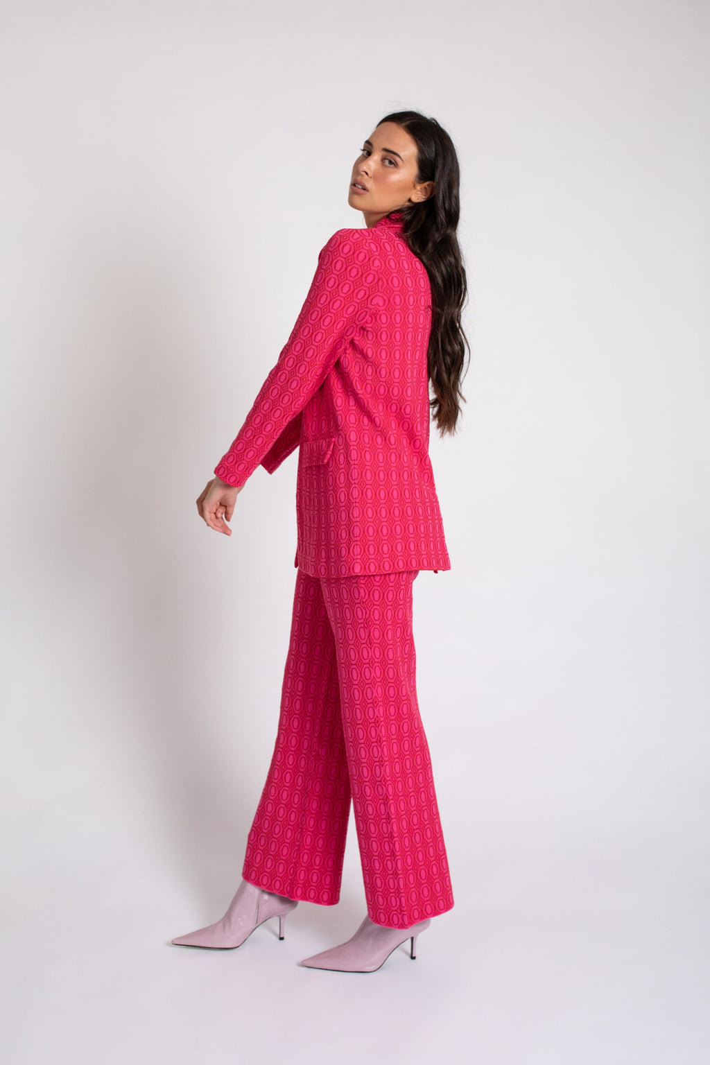 Pantalón de corte recto en jacquard de punto bicolor con cintura y tapeta a combinada. Cintura con goma