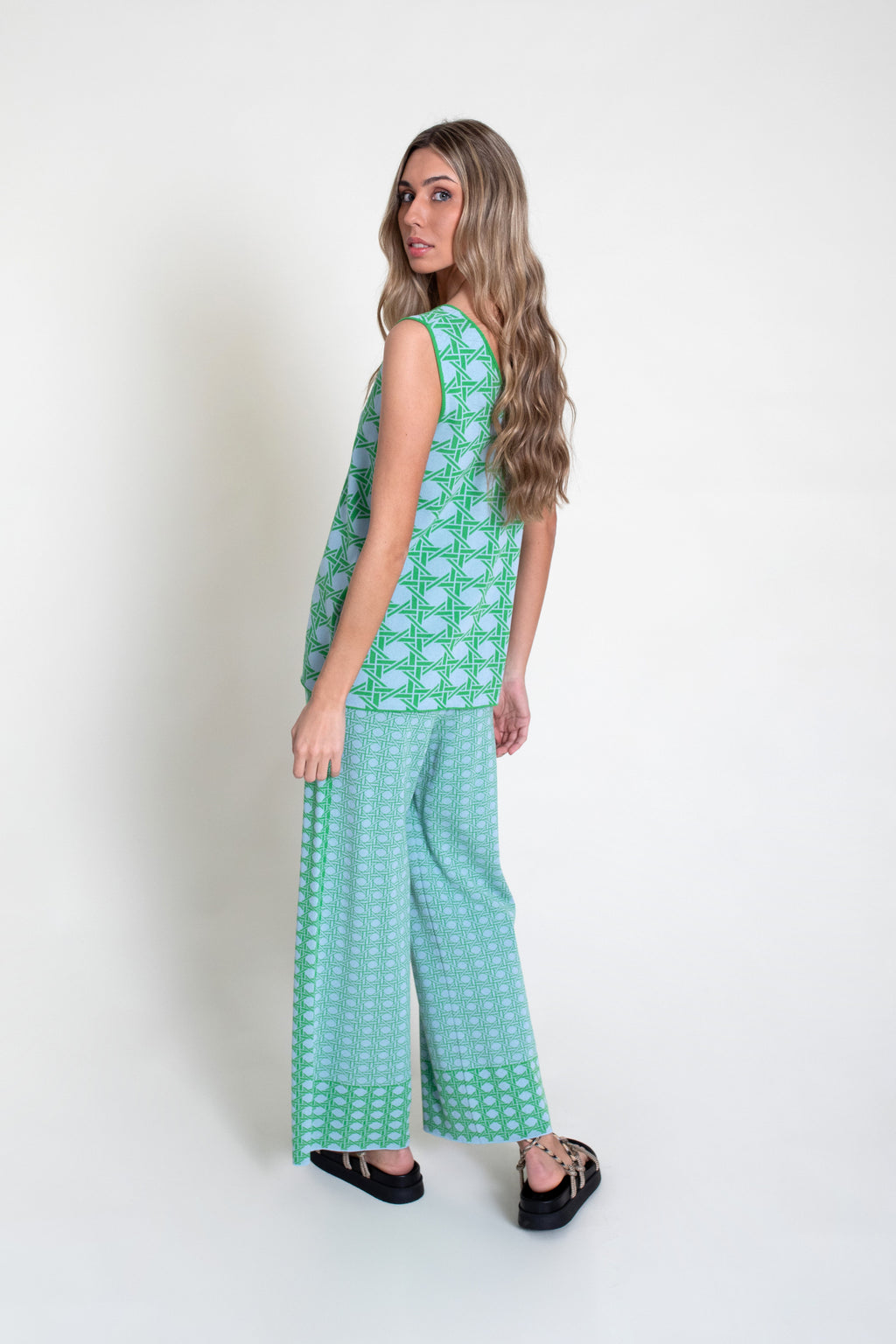 Pantalón recto de punto tricot con dibujo verde y azul. Cintura con goma