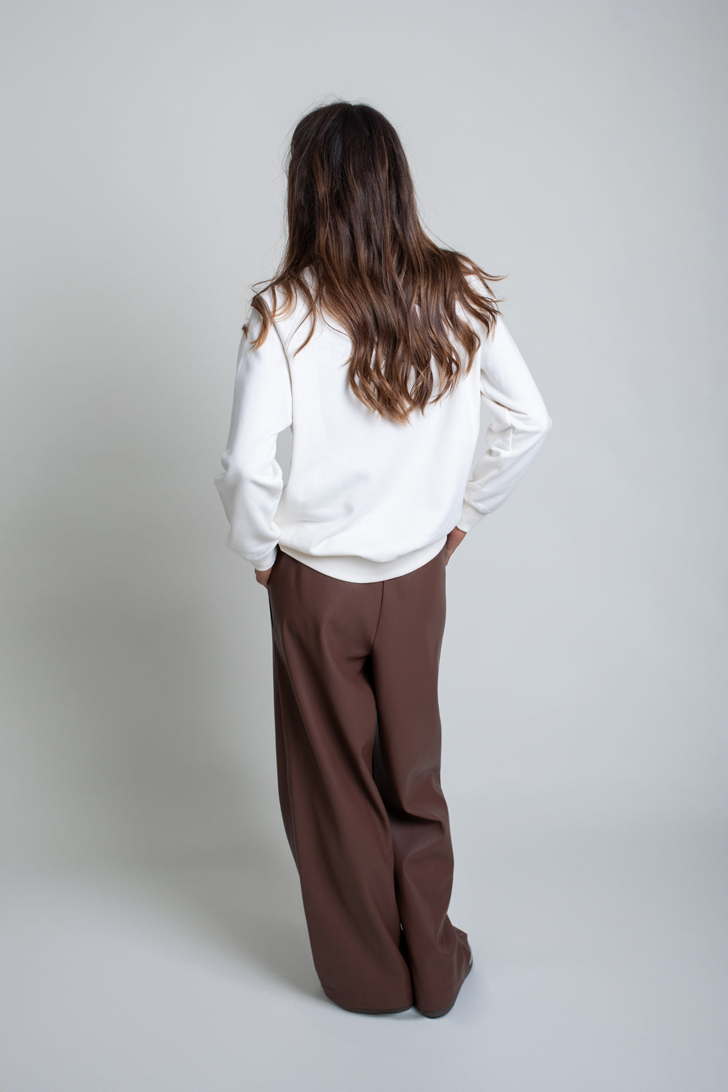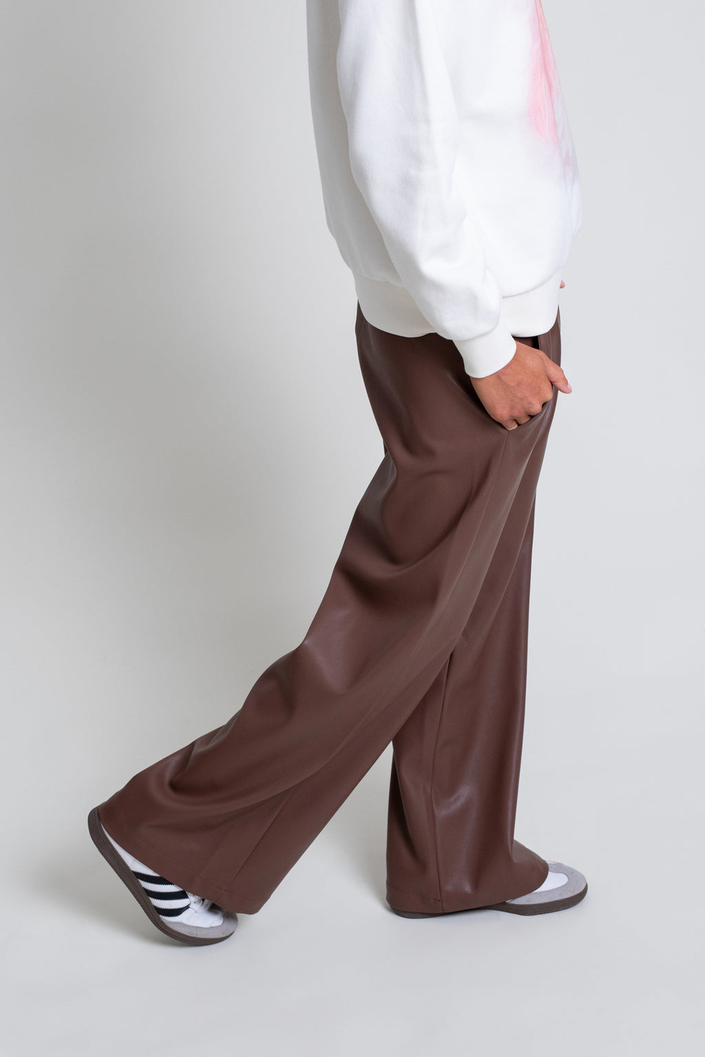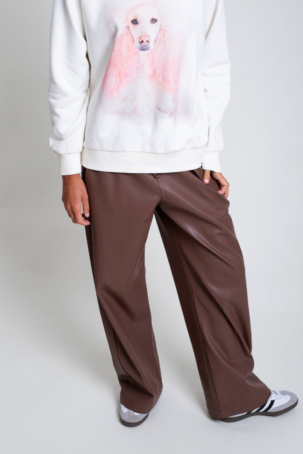Pantalón marrón en tejido efecto cuero. Modelo de corte recto con bolsillos y cintura con goma ajustable con cordón.