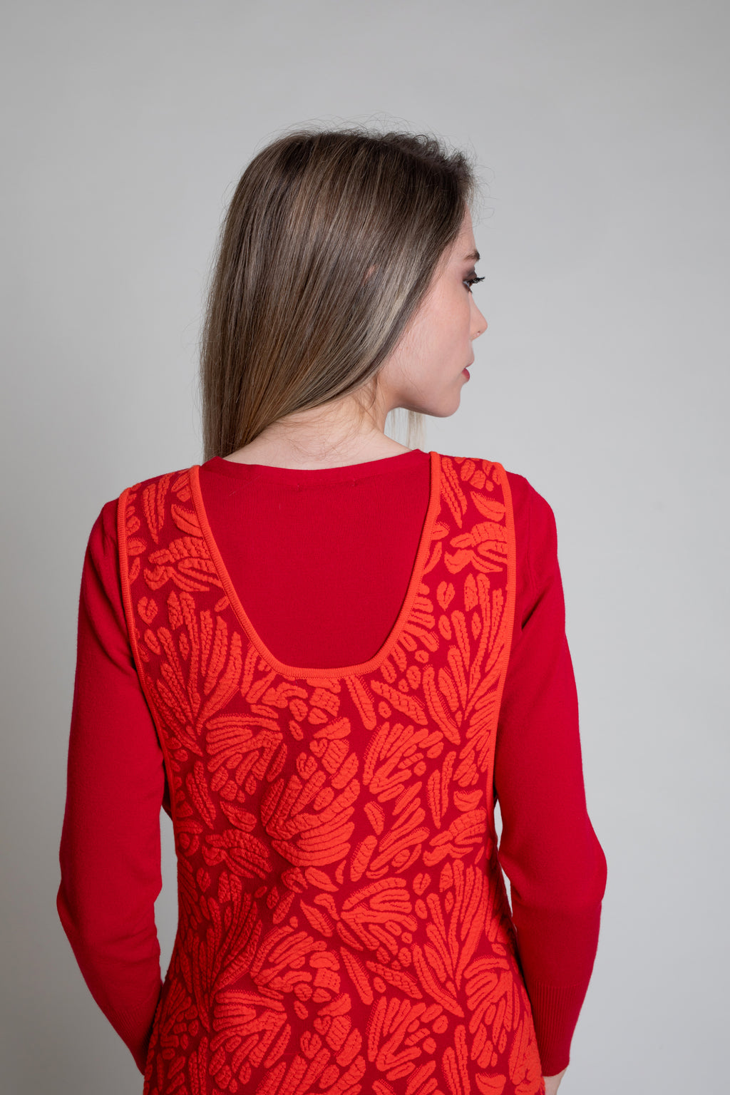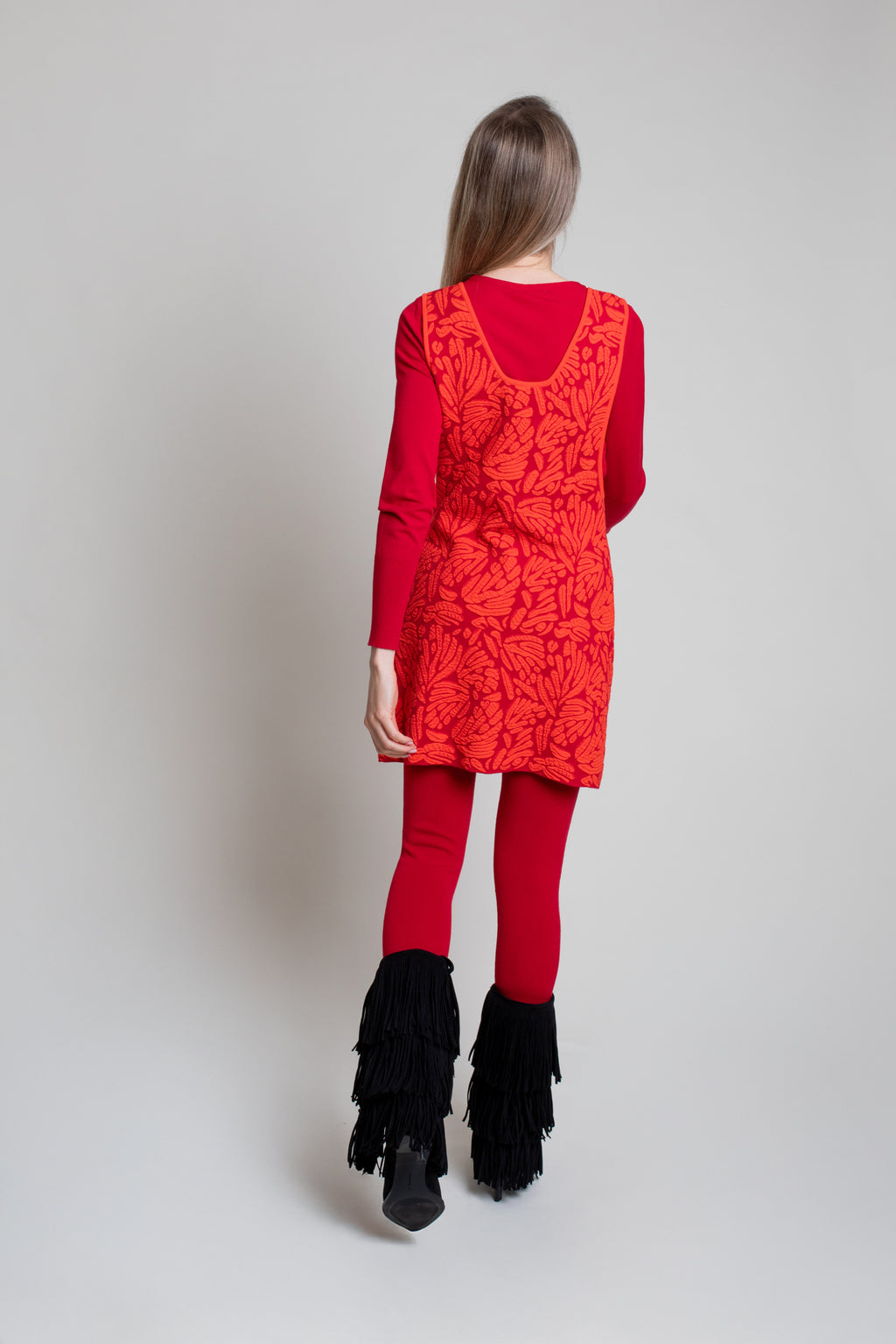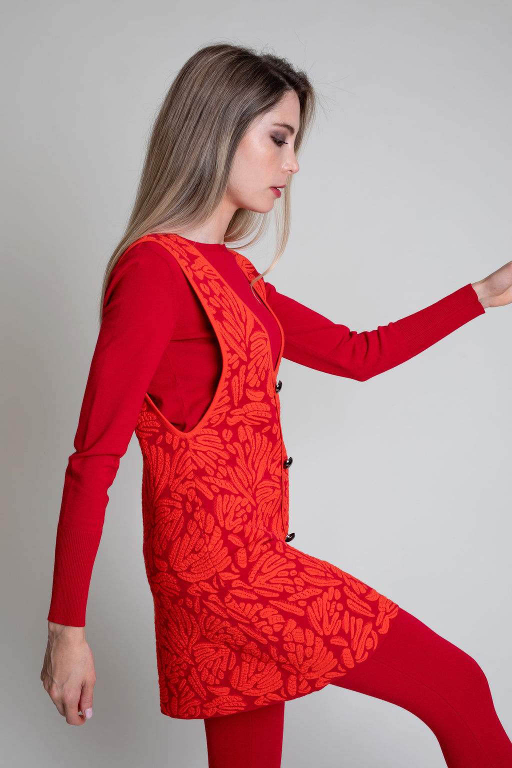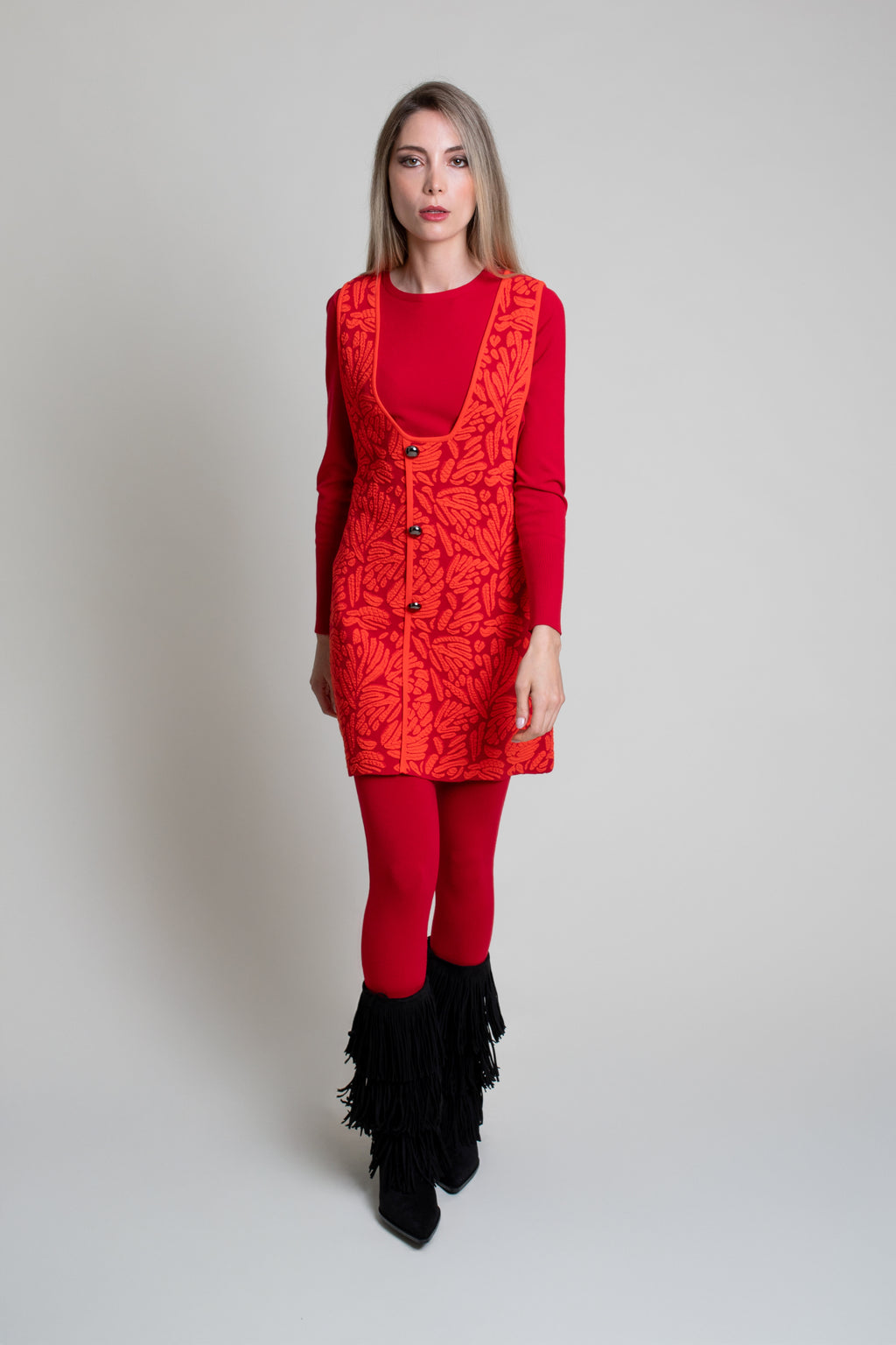 Vestido de punto tricot en jacquard bicolor. Modelo de corte evasé con escote en V y sin magas. Adorno de botones metálicos en centro delantero.