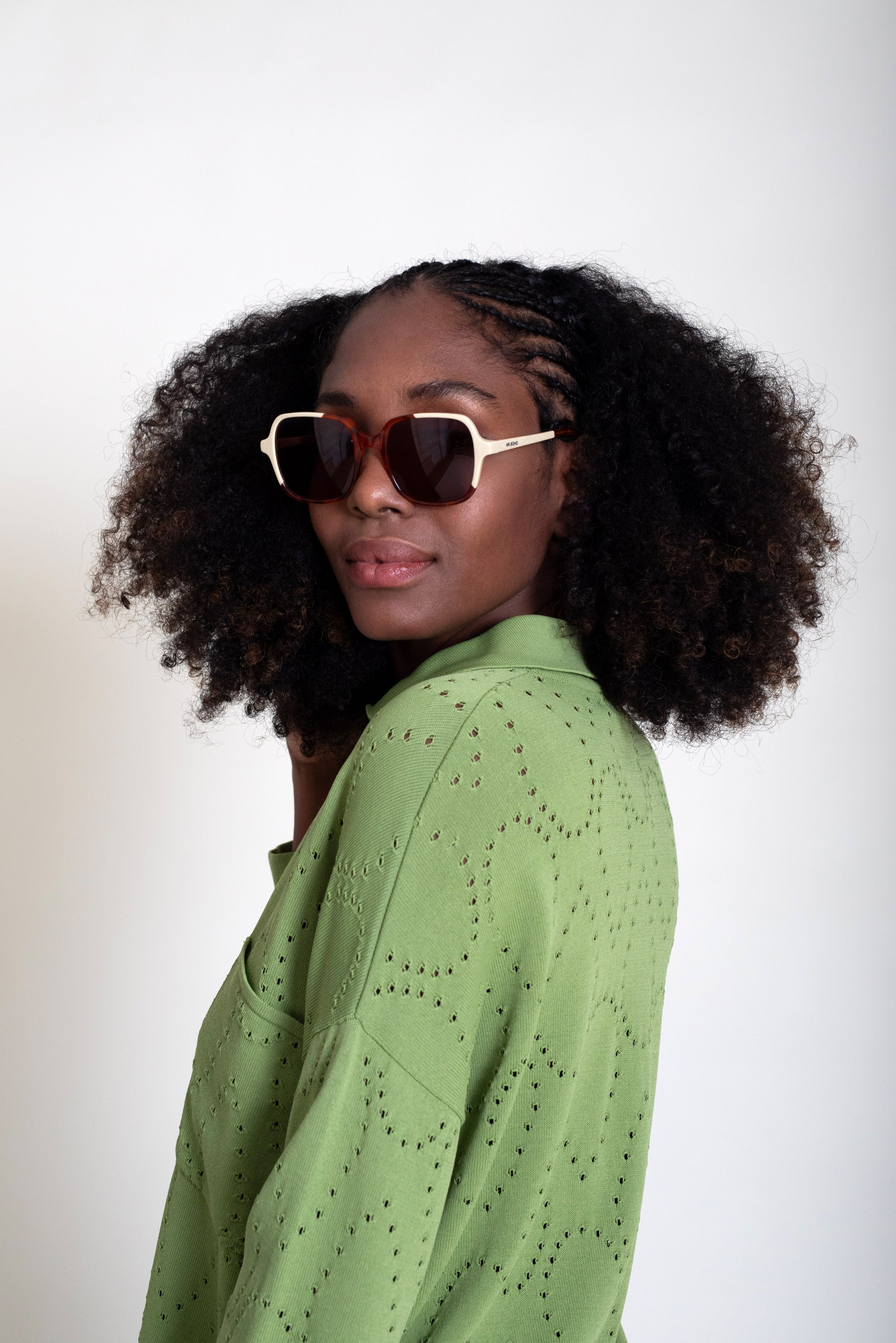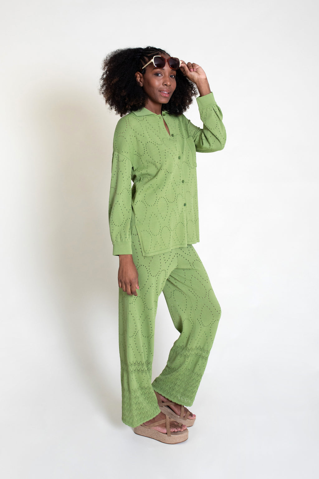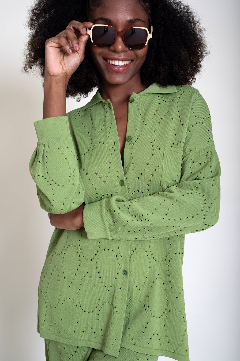 Chaqueta sobrecamisa de punto tricot con calados. Modelo ligeramente oversize con cuello camisero, manga larga con puño y aberturas laterales. Delantero con bolsillo y cierre central con botones.