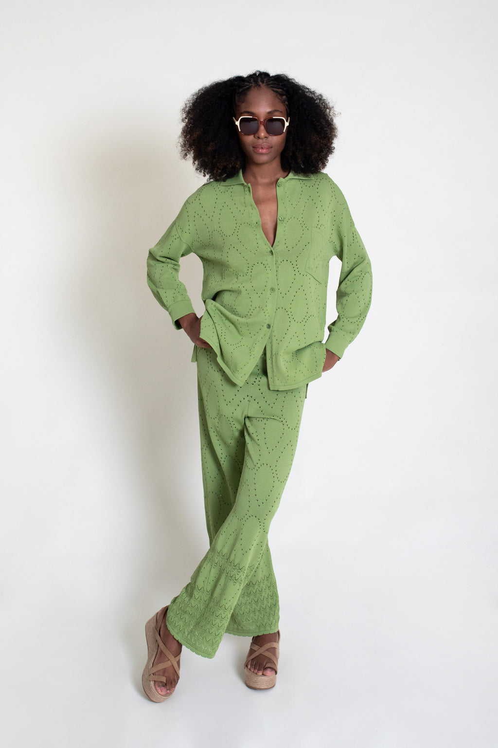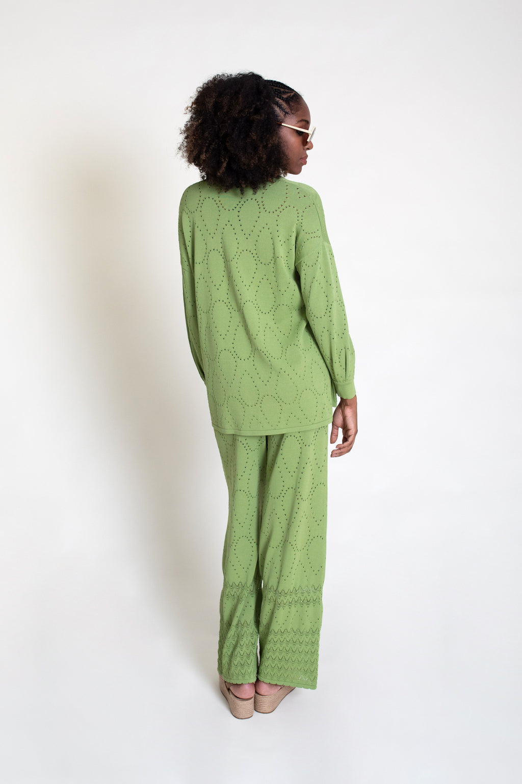 Chaqueta sobrecamisa de punto tricot con calados. Modelo ligeramente oversize con cuello camisero, manga larga con puño y aberturas laterales. Delantero con bolsillo y cierre central con botones.