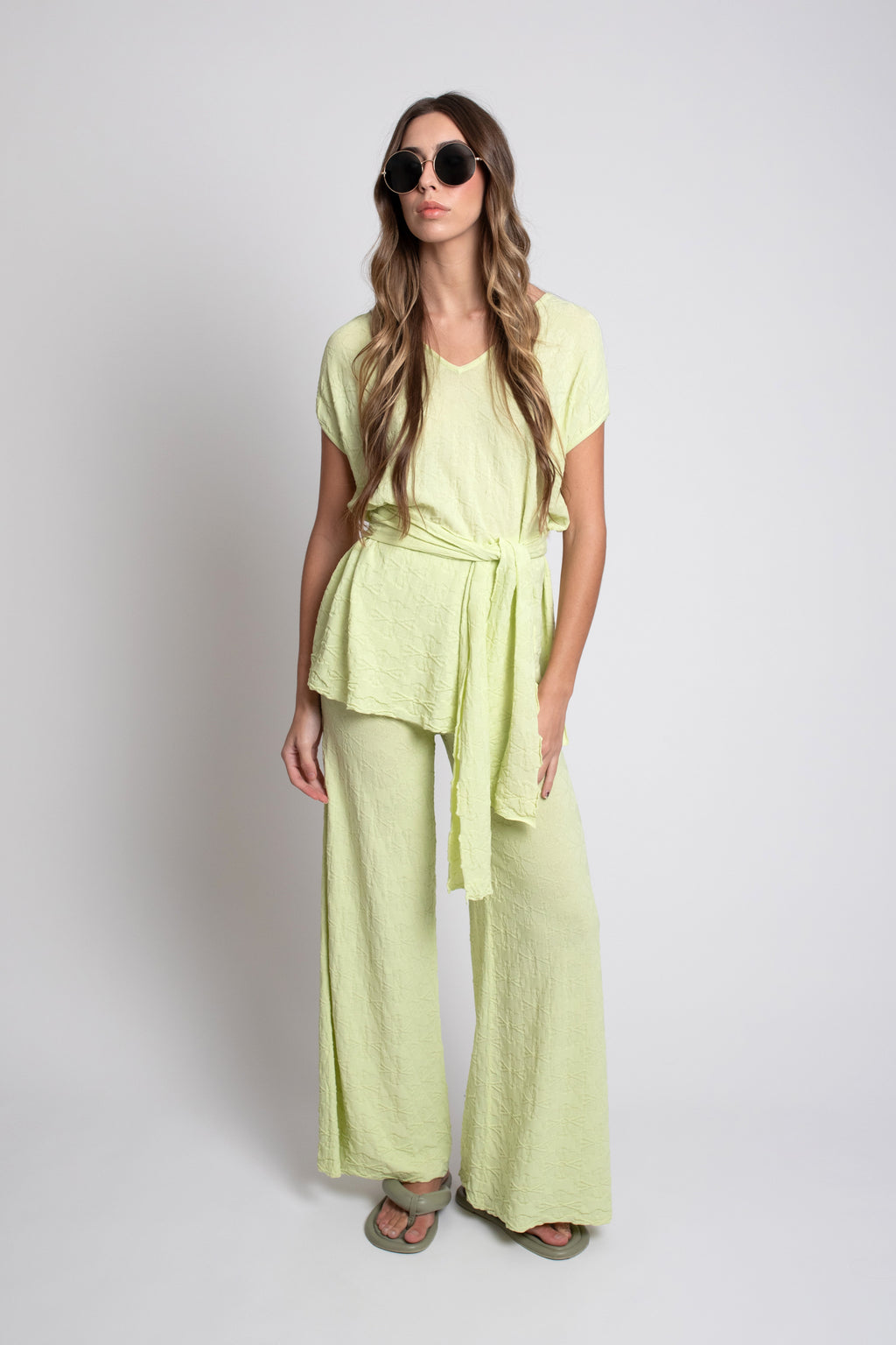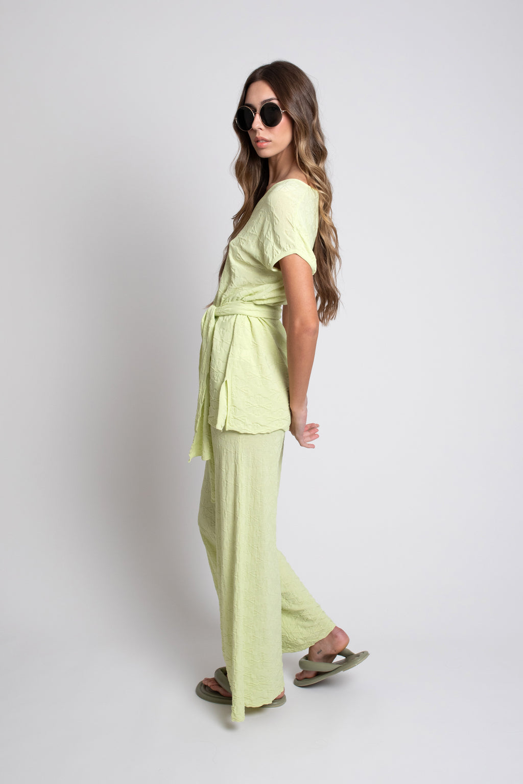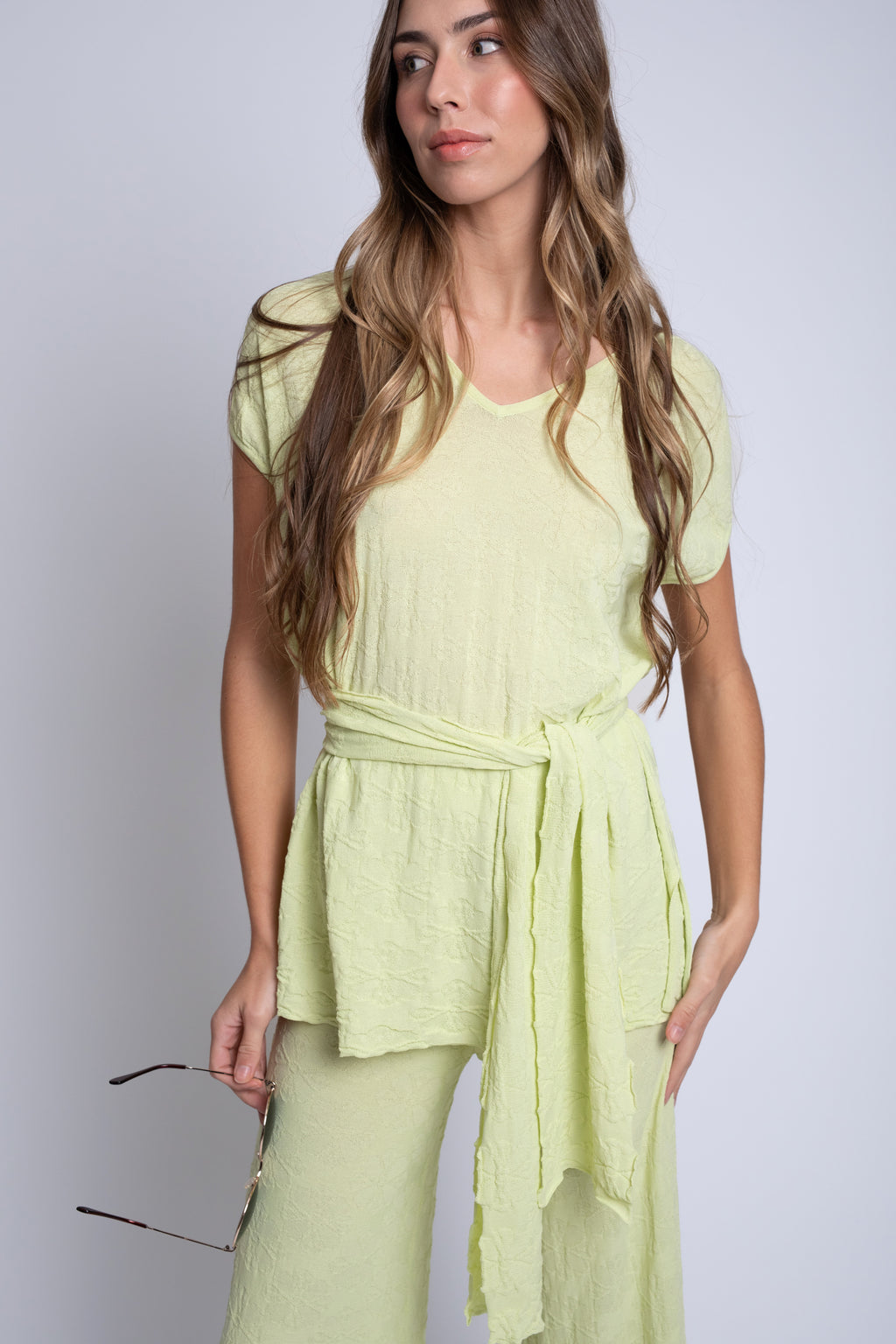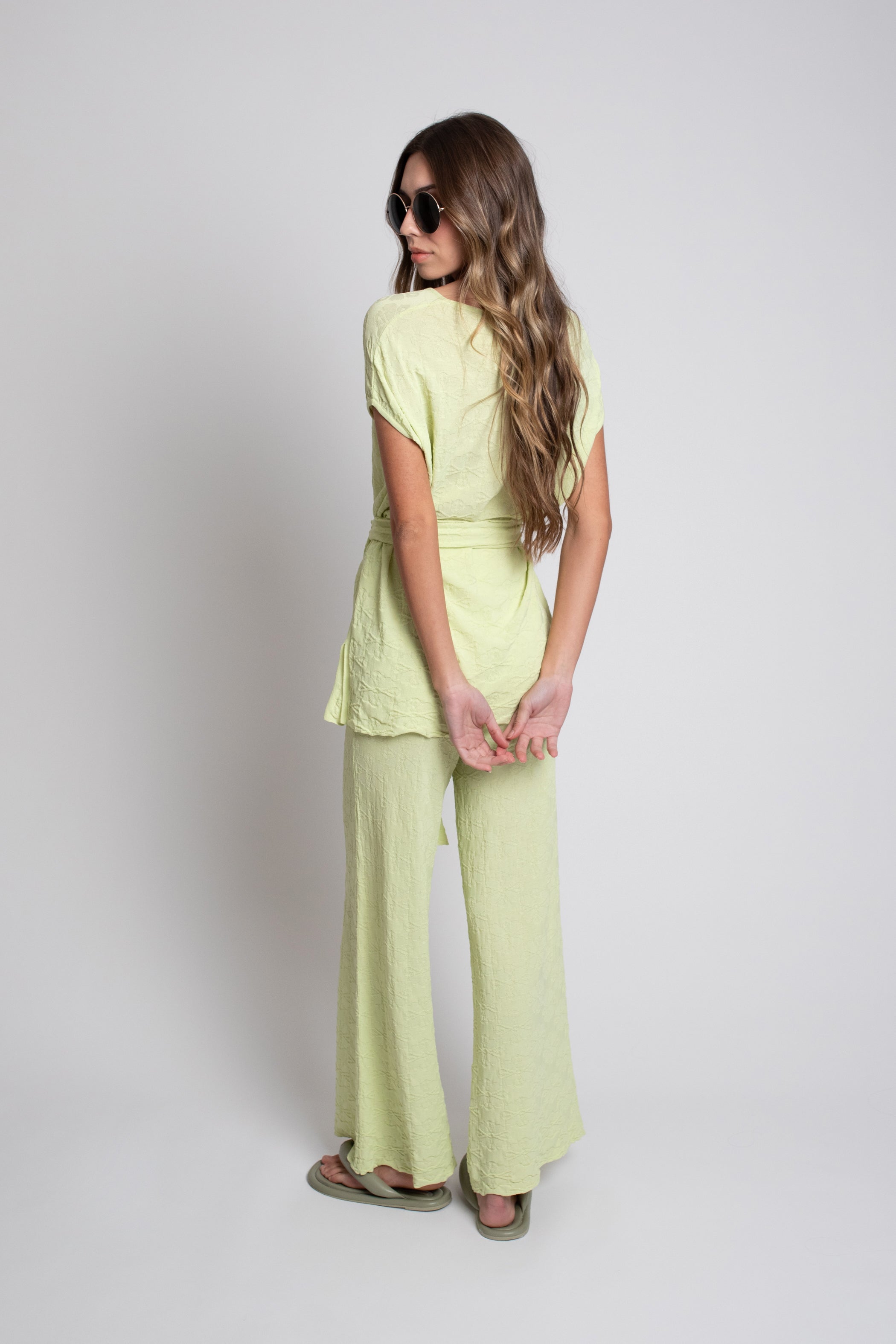 Incluye un cinturón o fajín del mismo tejido, que permite ceñir la prenda a la cintura o llevarla suelta, adaptándose a distintos estilos y momentos del día. Su diseño combina feminidad y funcionalidad, convirtiéndolo en una opción ideal tanto para looks diarios como para ocasiones más especiales.