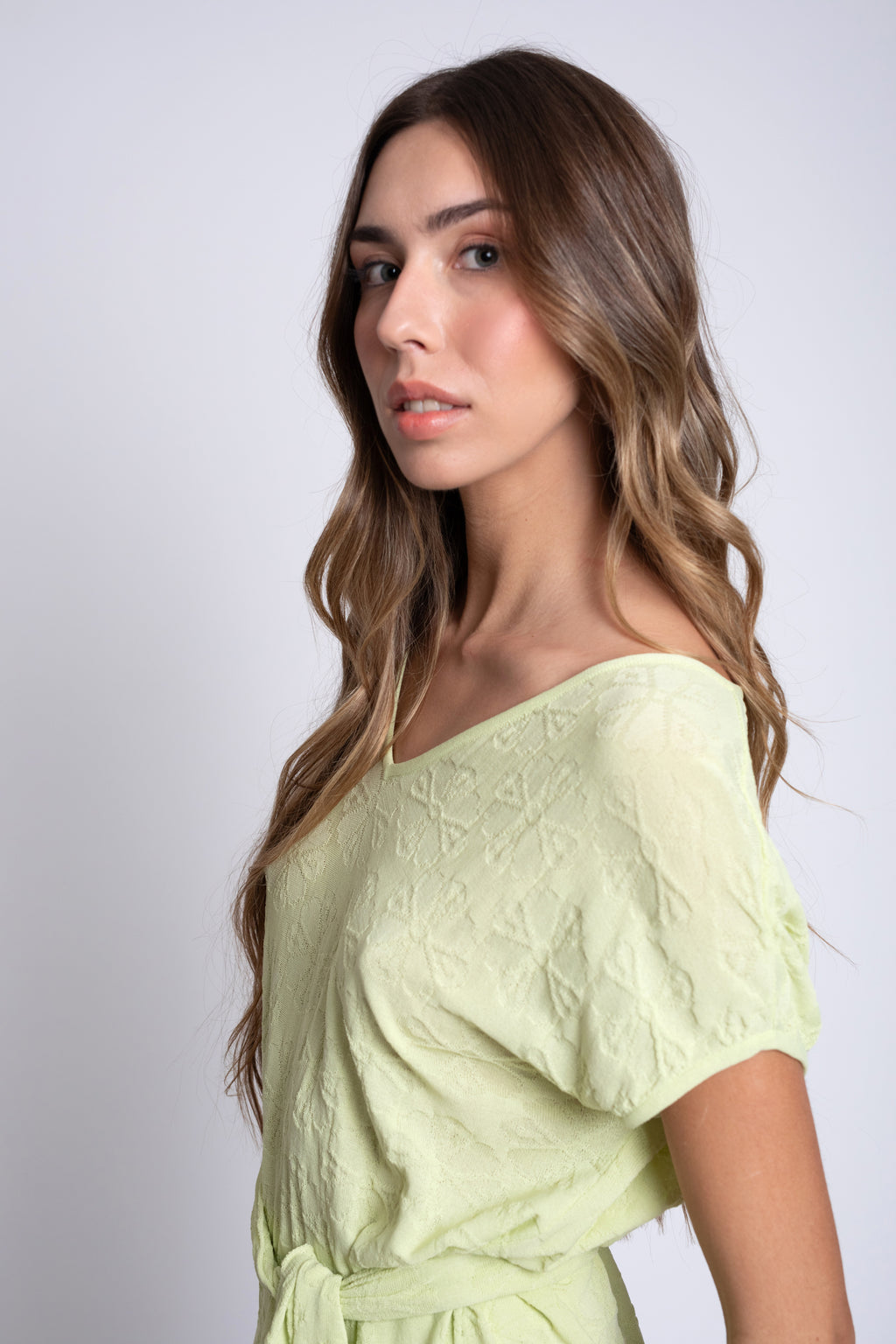Este top de punto texturizado destaca por su delicada estructura floral en relieve, que aporta profundidad y sofisticación a una prenda ligera y versátil. Con escote en pico y manga corta caída, ofrece una silueta relajada que se adapta cómodamente al cuerpo.