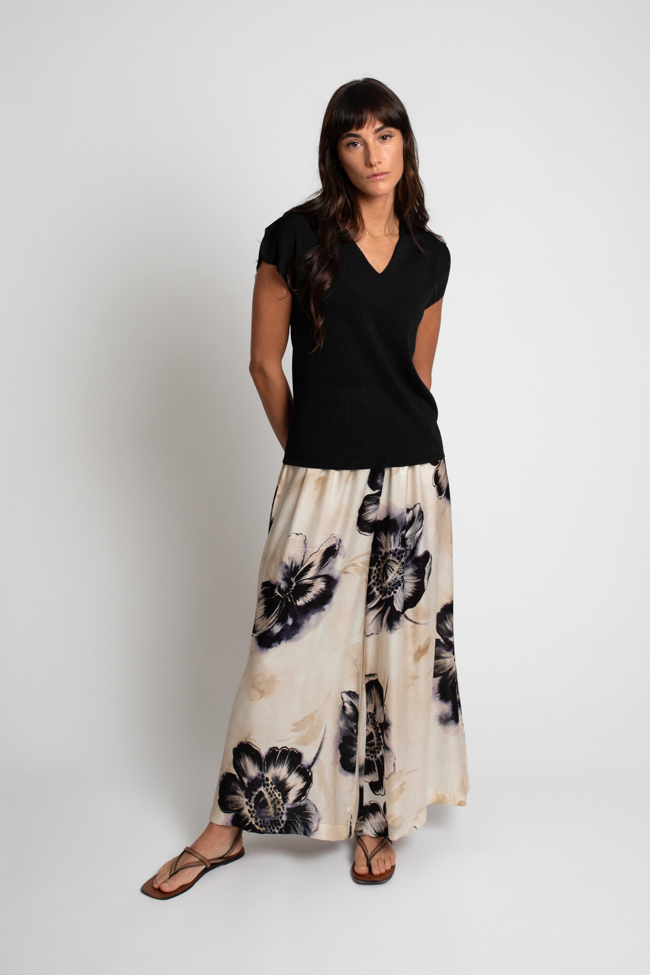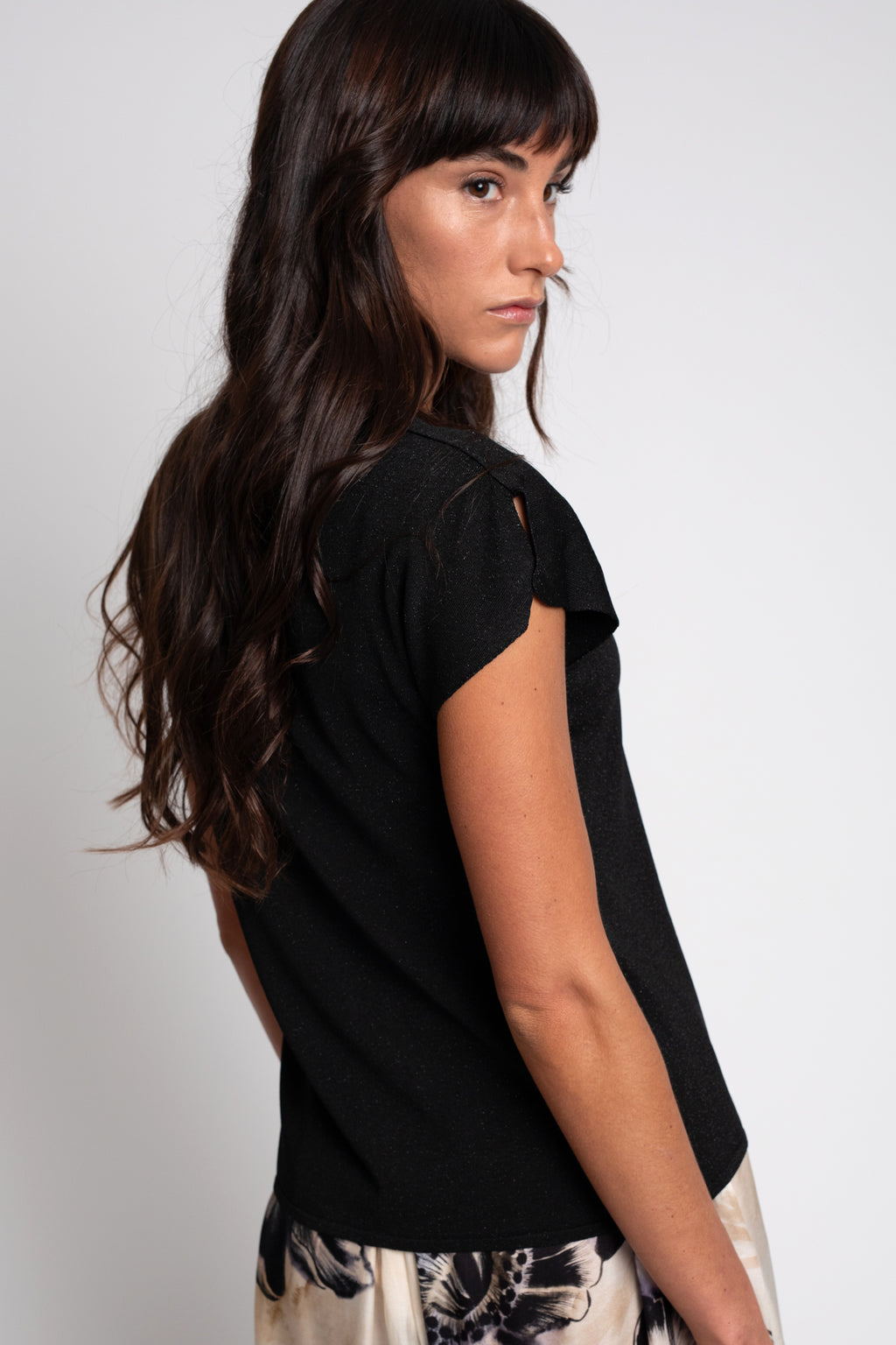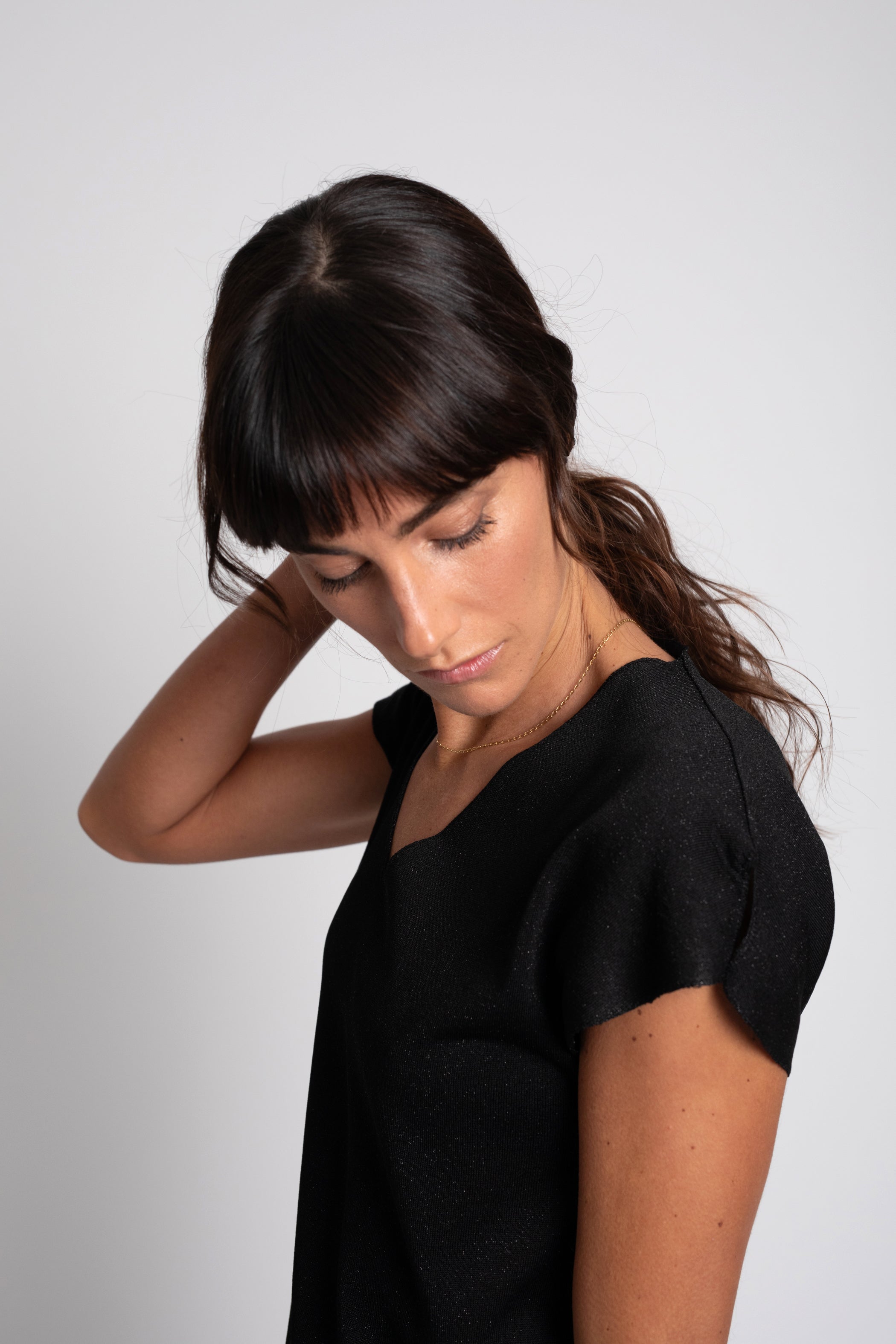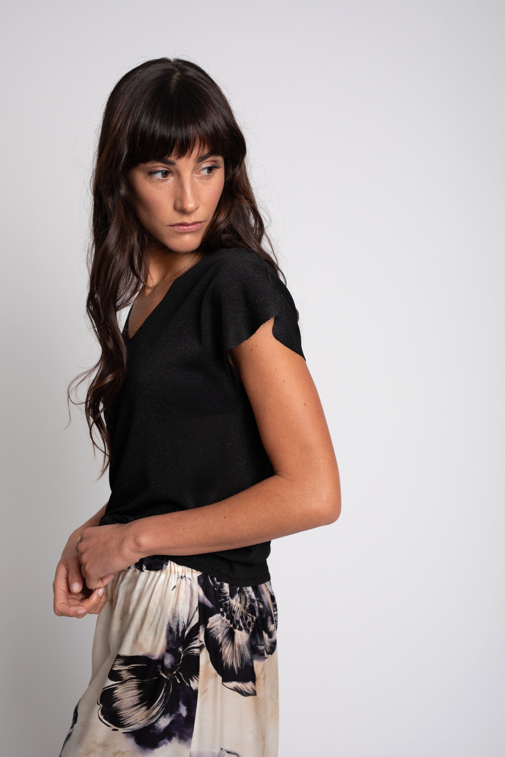 Top de punto tricot para mujer, confeccionado con hilo de brillo sutil que aporta luminosidad sin excesos. Su escote en V profundo estiliza la silueta y lo convierte en una prenda elegante, ligera y muy actual.