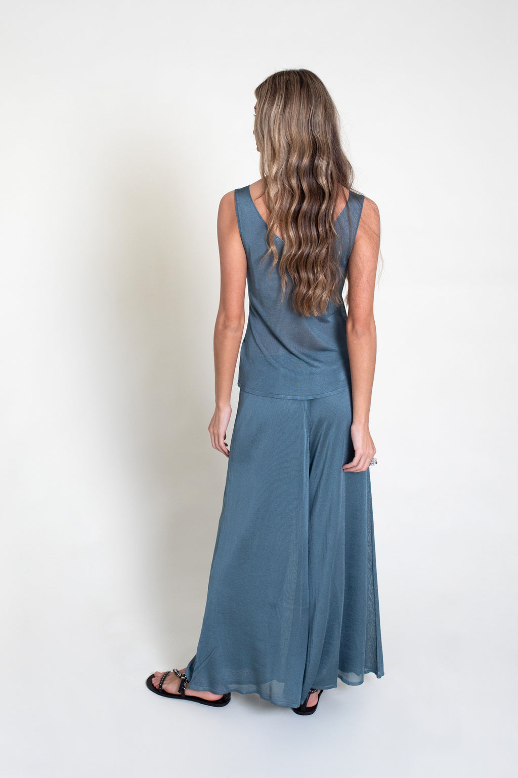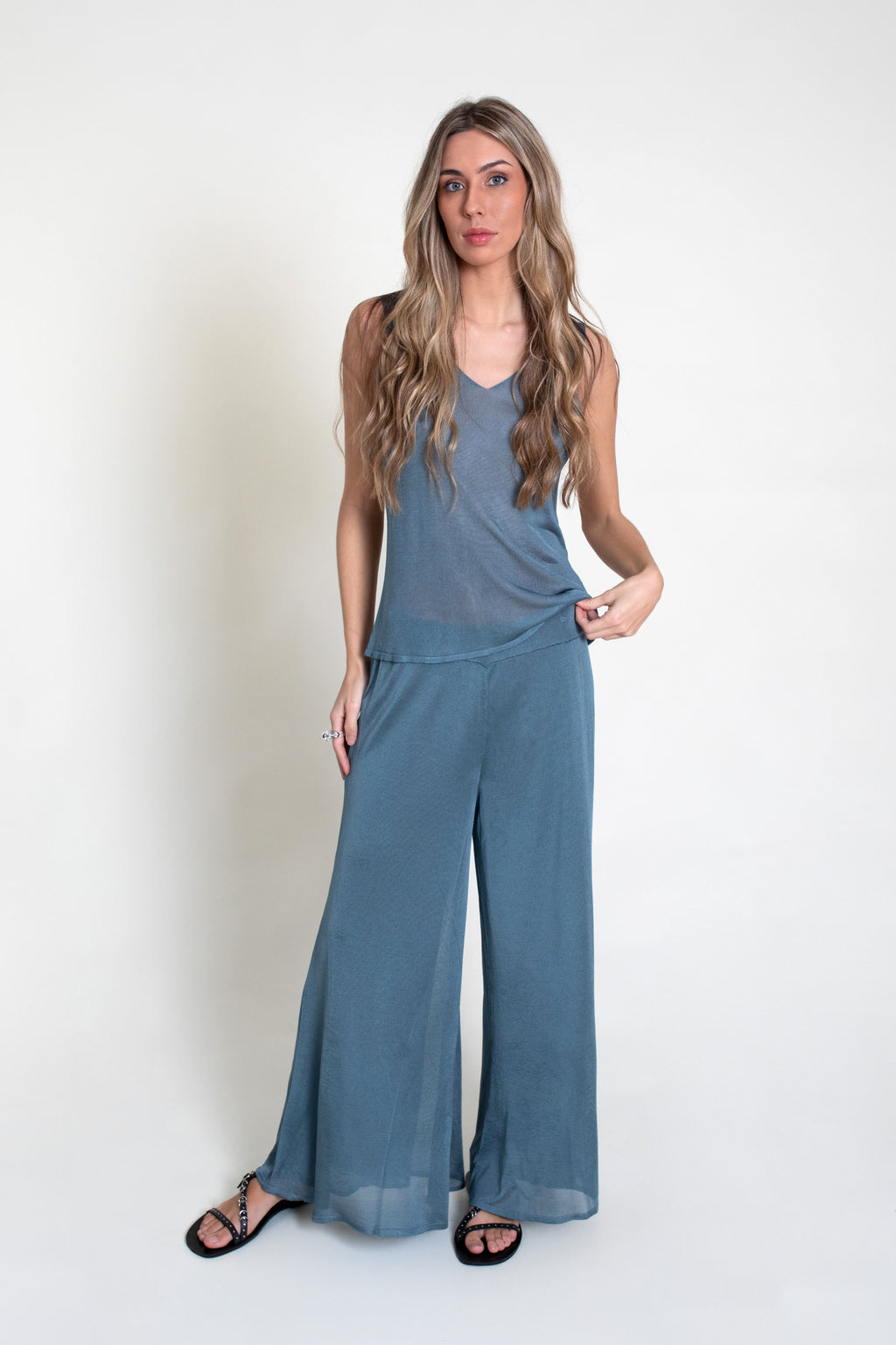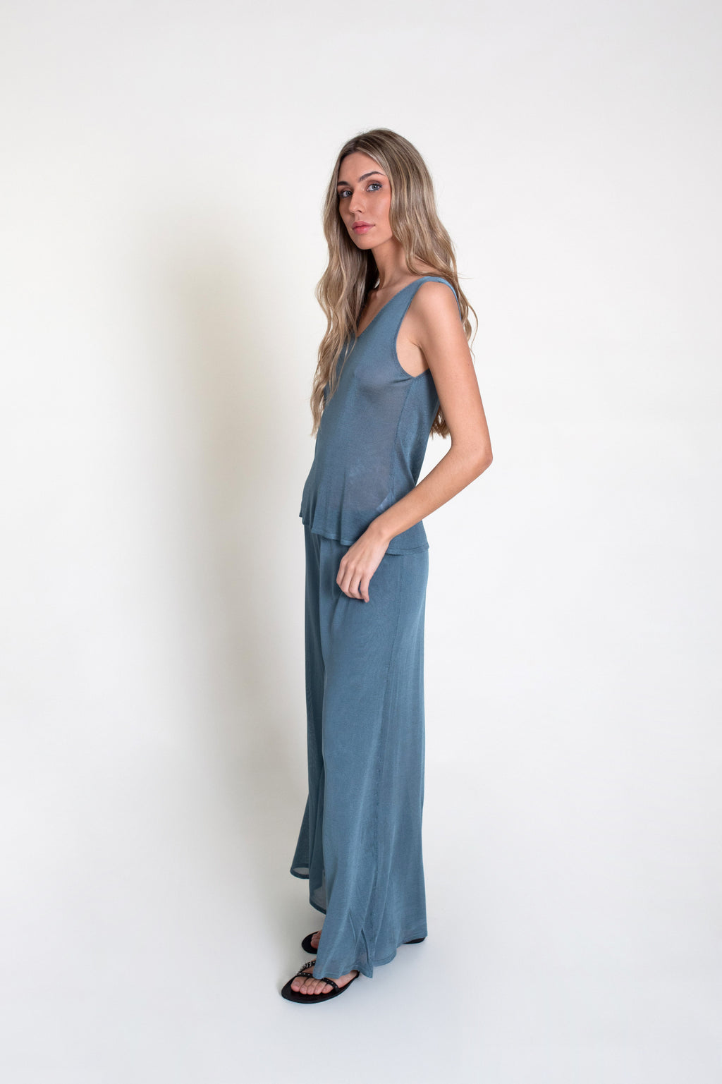 Top fino de punto tricot con ligero brillo, sin mangas y escote en pico.