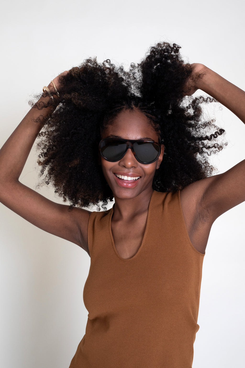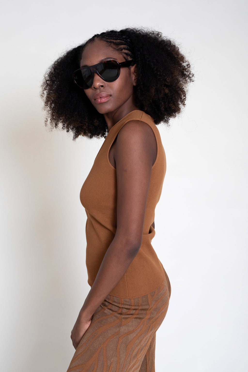 Top de punto tricot sin mangas en color marrón. Modelo de cote recto con ligero escote en pico