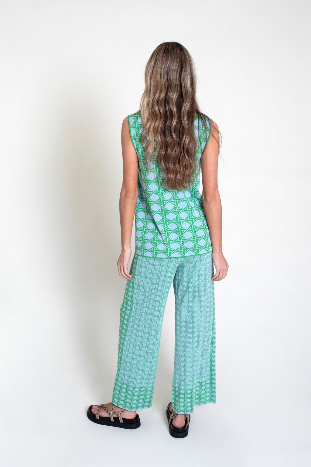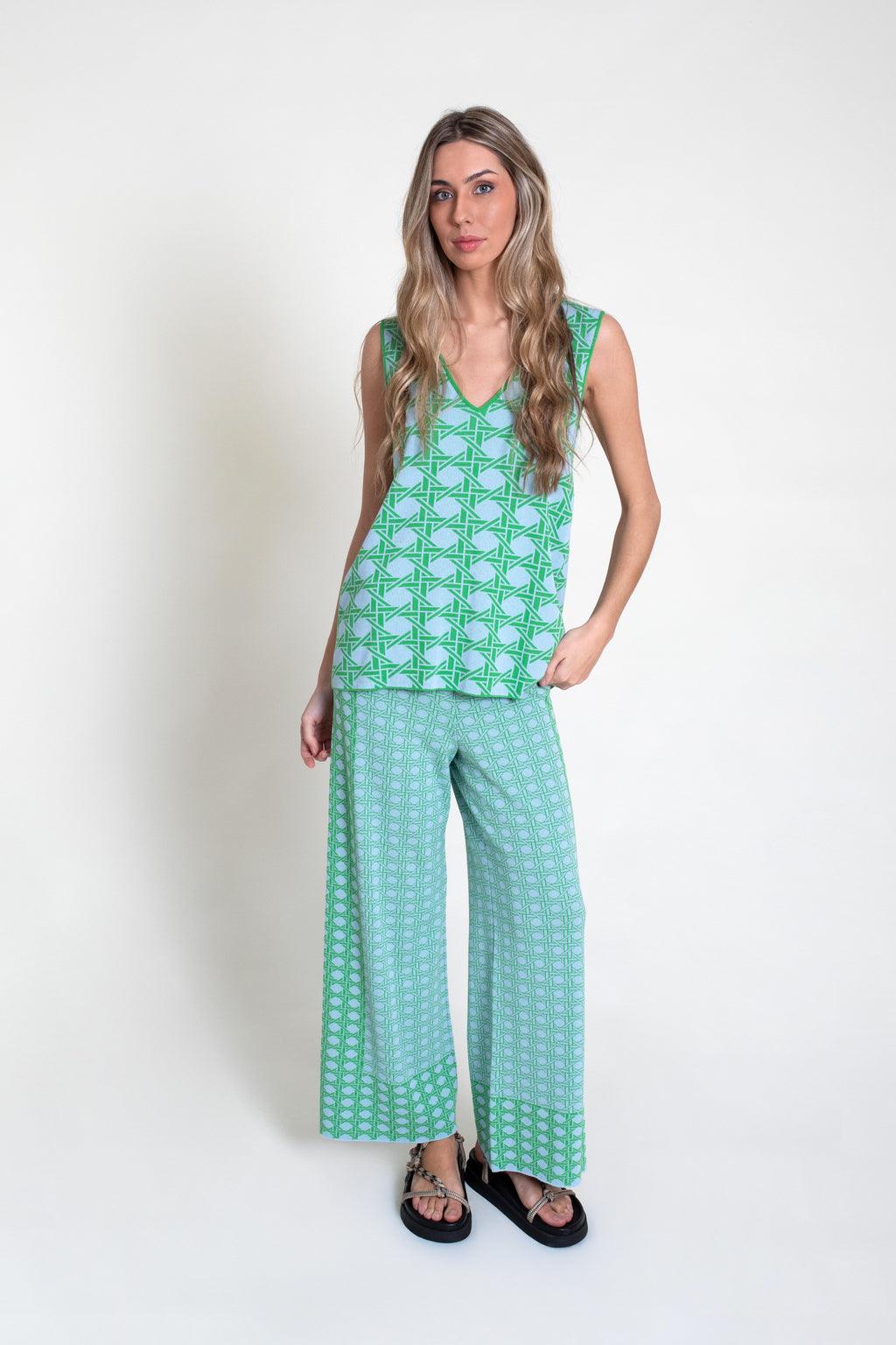 Top de punto tricot sin mangas y escote pico en delantero y espalda. Modelo de corte recto en colores verde y celeste.