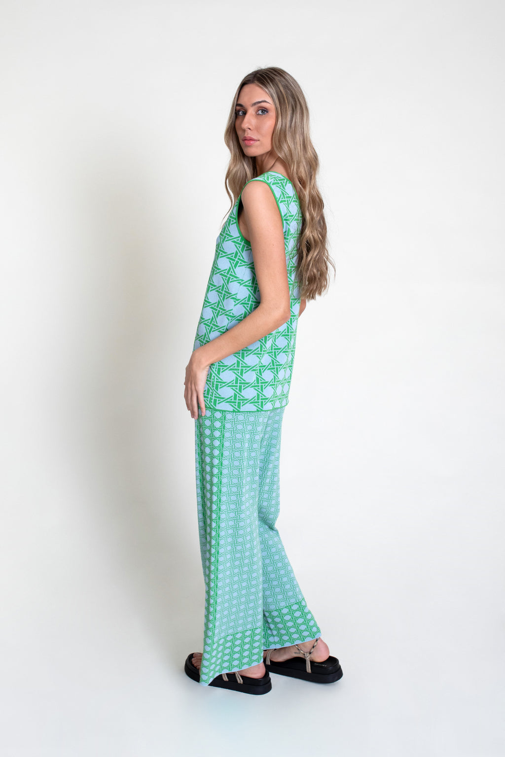 Top de punto tricot sin mangas y escote pico en delantero y espalda. Modelo de corte recto en colores verde y celeste.