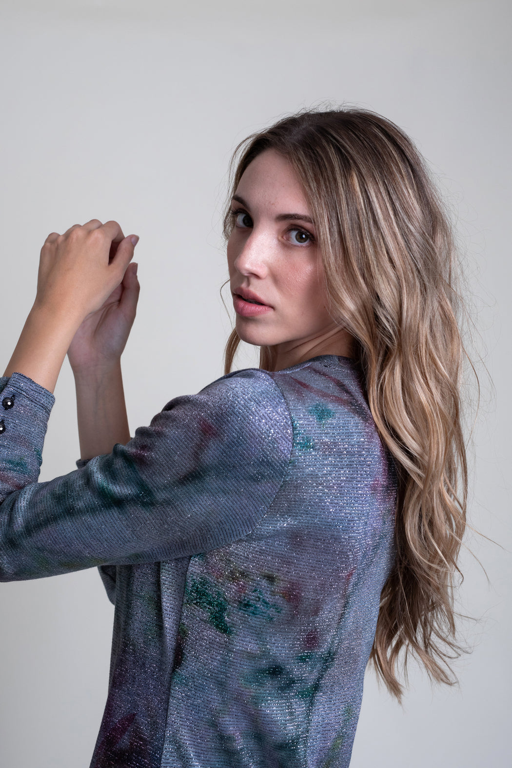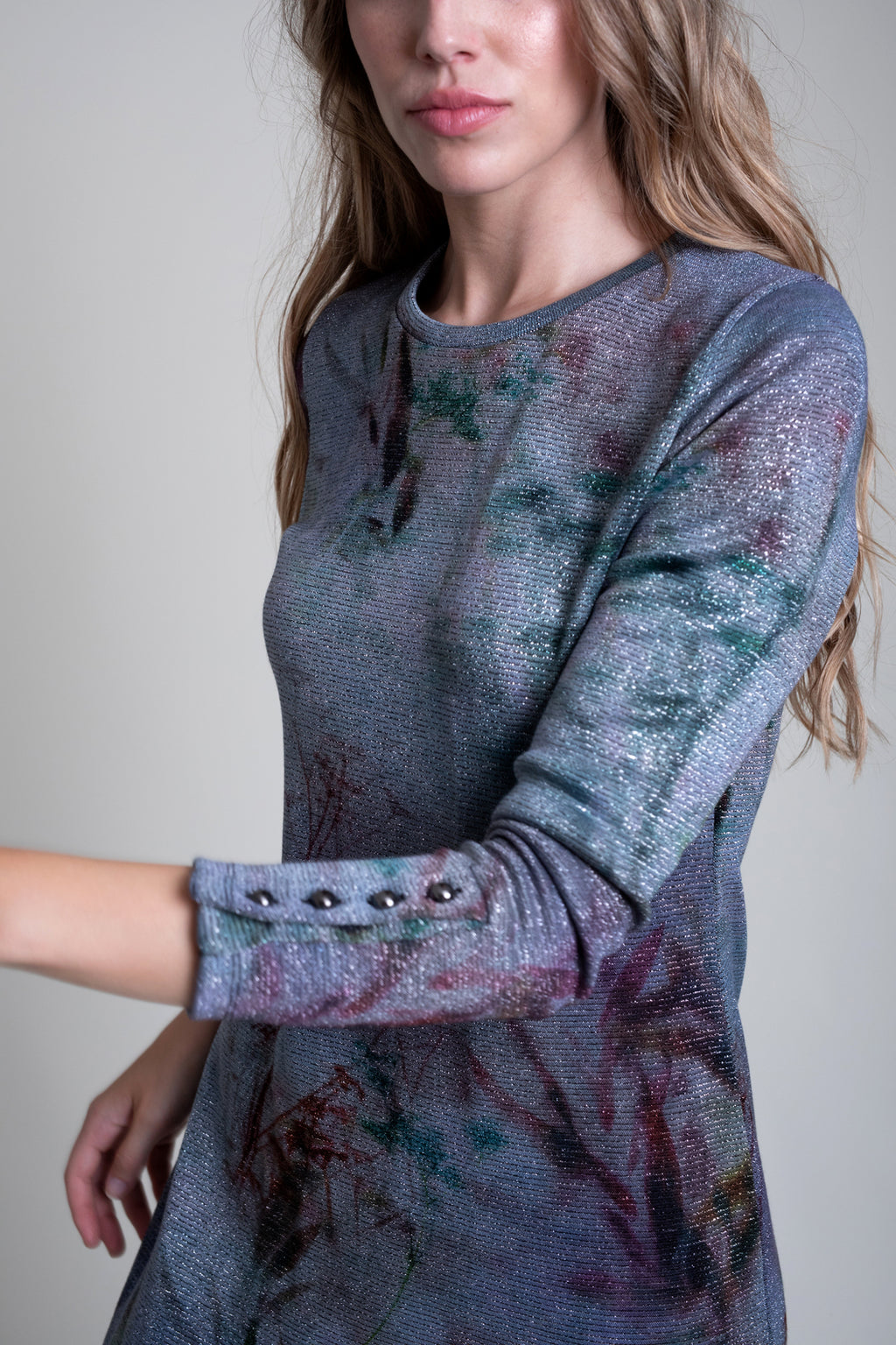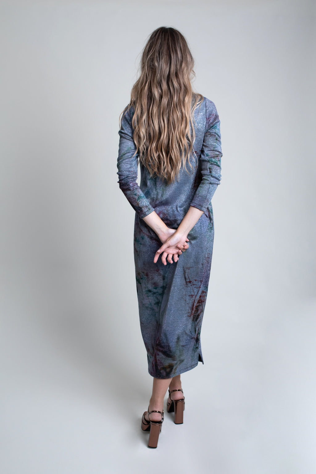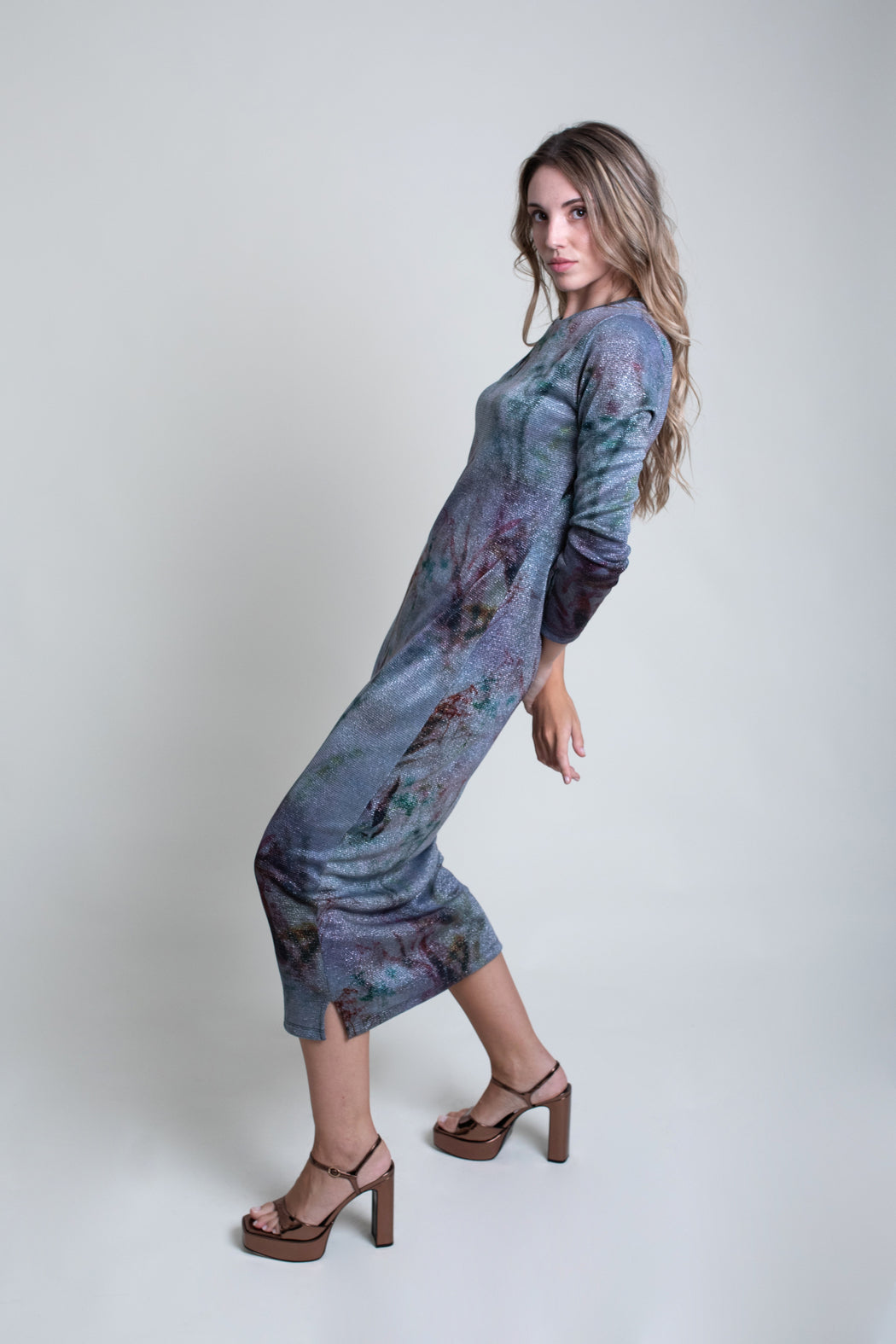 Vestido largo estampado en tejido elástico con brillo. Modelo recto con cuello caja y manga larga con detalle de botones a modo de adorno en el puño.